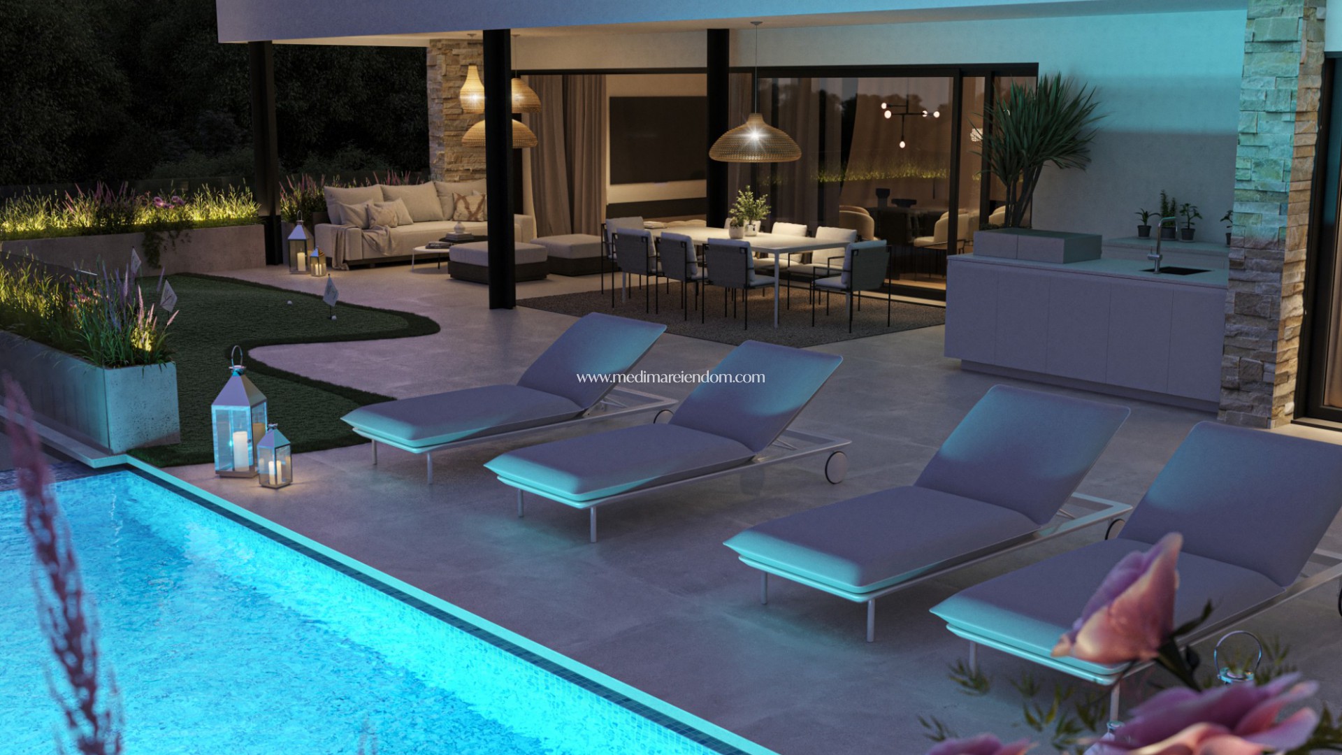 Alle Eigenschaften haben 2-3 Badezimmer, Wohnzimmer mit offener Küche und Terrasse.