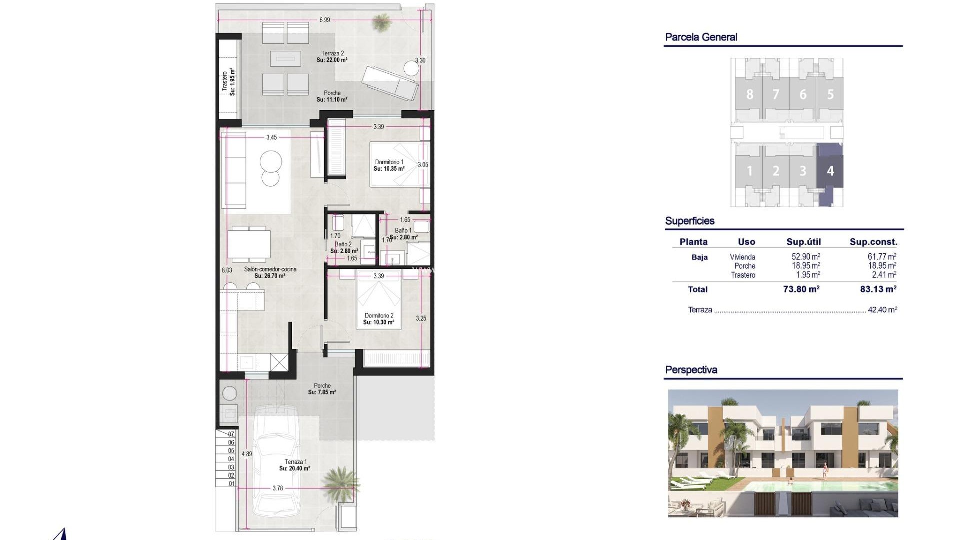 NEU GEBAUTE BUNGALOWWOHNUNGEN IN SAN PEDRO DEL PINATAR Neubau einer Wohnanlage mit modernen Bungalowwohnungen in San Pedro Del Pinatar. Das Erdgeschoss Bungalow mit 2 Schlafzimmern haben eine Terrasse mit privatem Garten. Das Dachgeschoss Bungalow mit 3 Schlafzimmern haben eine große Sonnenterrasse. Alle Bungalows haben einen Parkplatz. Es gibt einen gemeinsamen Garten mit Schwimmbad. Die privilegierte Lage von San Pedro del Pinatar am Mar Menor und an der Mittelmeerküste zieht alle an, die sich für Segeln und Wassersport interessieren, denn es gibt Anlegestellen im Hafen und Segelclubs, während die Strände und natürlichen Schlammbäder diejenigen anziehen, die Sonne, Meer und Sand suchen. San Pedro del Pinatar hat eine etablierte Gemeinde und bietet ein ausgezeichnetes Angebot an Aktivitäten, darunter ein überdachtes Schwimmbad und Sporteinrichtungen, sowie ein ganzjähriges Programm an sozialen Aktivitäten bei angenehmem Winterwetter. Die Vorzüge der für die Region typischen Schlammbäder oder des ruhigen Wassers des Mar Menor haben das Wachstum von Lo Pagán begünstigt, das heute über alle möglichen Annehmlichkeiten verfügt. Außerdem hat es eine ausgezeichnete Lage, nur 5 Minuten vom Einkaufszentrum Dos Mares entfernt. Der Flughafen Murcia/Corvera ist 30 Minuten und der Flughafen Alicante eine Autostunde entfernt.