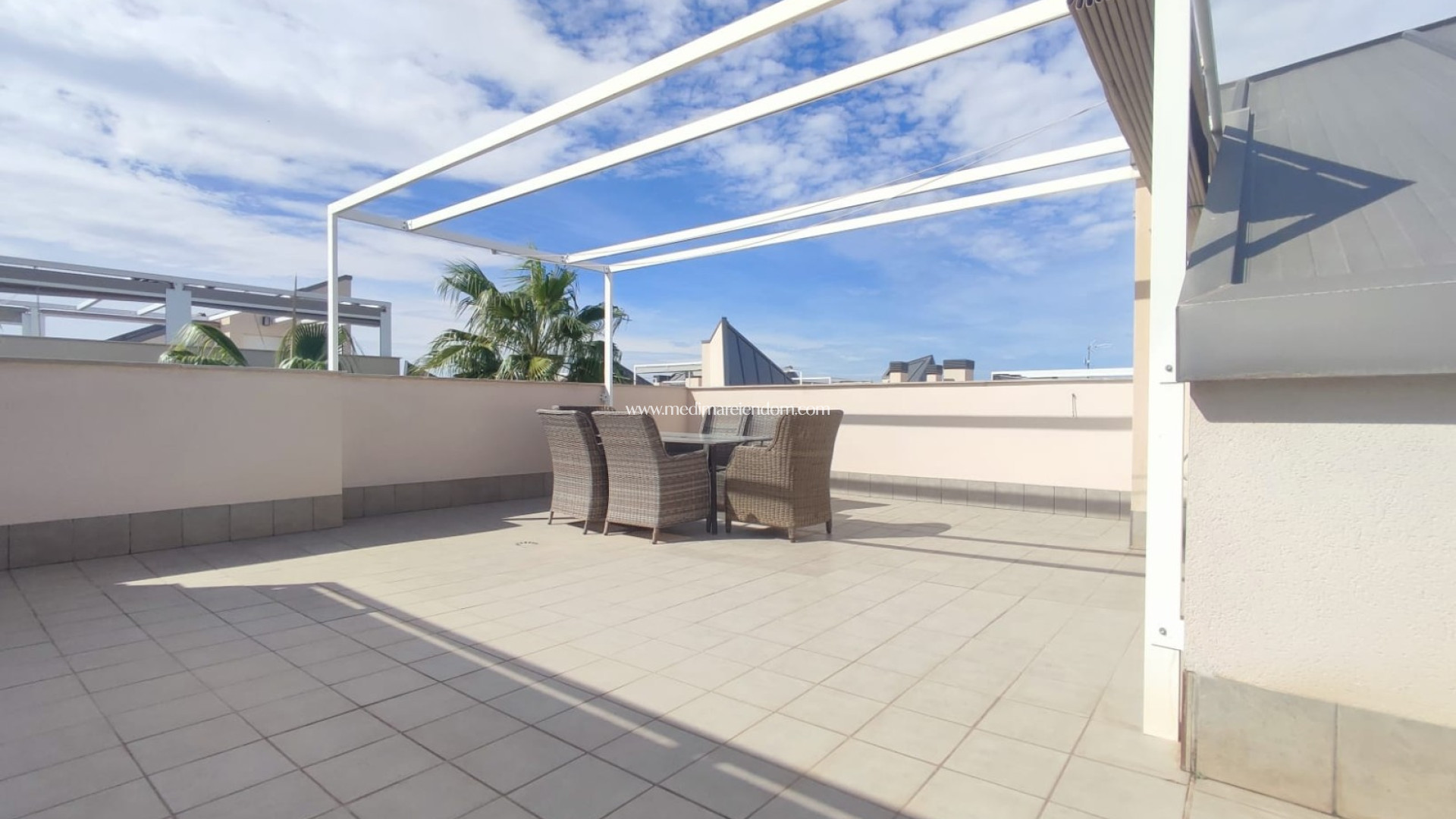 Modernes Penthouse mit 2 Schlafzimmern, 2 Bädern, Terrasse und großer Dachterrasse mit Pergola. Die Wohnung wird mit Haushaltsgeräten, Klimaanlage kalt/warm und Tiefgarage verkauft.