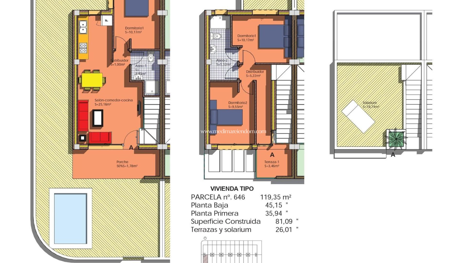 NYBYGDE TOMANNSBOLIGER I ORIHUELA COSTA Nybygg praktfullt kompleks bestående av 24 rekkehus og tomannsboliger med 3 soverom og 2 bad, privat svømmebasseng og solarium for å nyte alle soltimer hver dag hele året. Komplekset ligger i PAU 26, rolig boligområde i Orihuela Costa. Disse egenskapene leveres med forhåndsinstallert kanalisert klimaanlegg, inkludert tilførsels- og returgitter i stuen og soverommene, samt forhåndsinstallasjon av klimakontroll. Komplekset ligger ved siden av stranden i Punta Prima, slik at du kan nyte den spanske solen hele året på Costa Blanca. Bare 10 minutter fra golfbanen Villa Martín og kjøpesenteret La Zenia Boulevard. Komplekset ligger 40 minutter fra Alicante flyplass og 1 time Murcia - Corvera flyplass.