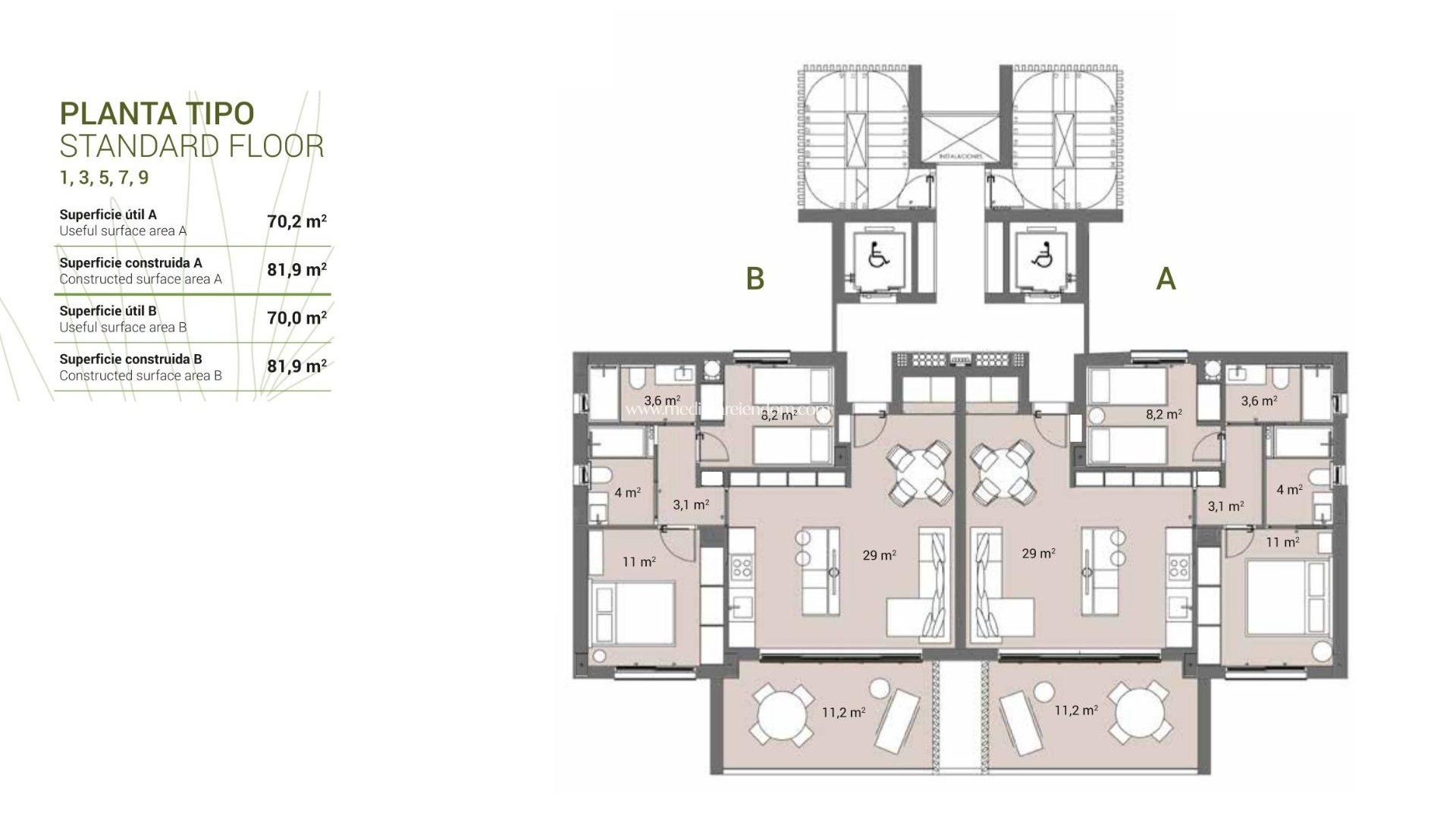 NYBYGG BOLIG I GUARDAMAR DEL SEGURA Et 11 etasjers nybygg moderne boligkompleks bestående av 20 leiligheter og penthouse, med fellesarealer og direkte havutsikt i Guardamar del Segura. Et fristed for ro ved siden av Las Dunas naturpark og havet. Bolig bestående av leiligheter med 2 soverom og penthouse med 3 soverom, alle har åpen kjøkkenløsning med romslig stue, garderober, terrasse, bod, parkeringsplass. Boligene er designet for maksimal privatliv, med store terrasser med utsikt over havet og romslige fellesarealer med svømmebasseng og grønne områder hvor du kan slappe av og nyte omgivelsene. Miljøvennlige hjem for å nyte Middelhavet i sitt mest naturlige og fredelige miljø hvor du kan gå, svømme og utøve forskjellige idretter. Guardamar del Segura er en by som ligger på Costa Blanca sør. Med sine 11 kilometer med naturlig strand og sin store furuskog. Guardamar er en rolig by å bo i, den har alle tjenester hele året som restauranter, barer, butikker, banker, steder for fritid, etc. Hver onsdag, i de sentrale gatene i byen, arrangeres et marked der mange mennesker går for å kjøpe produkter som mat, klær, møbler, dyr osv. Det er et stort krav, og innbyggerne i den omkringliggende byen kommer til Guardamar hver onsdag for å besøke markedet. Guardamar del Segura har en stor havn med aktiviteter hele året, det har et stort sportssenter med paddle tennis, tennis, fotball og et stort oppvarmet svømmebasseng som fungerer hele året. Det har også et bibliotek der det er gratis wifi og datamaskiner. Guardamar del Segura ligger bare 20 km fra flyplassen Alicante - Elche (El Altet), hvor det er mange flyvninger hver dag med forbindelser til de største europeiske byene, på grunn av etterspørselen etter turister på Costa Blanca.