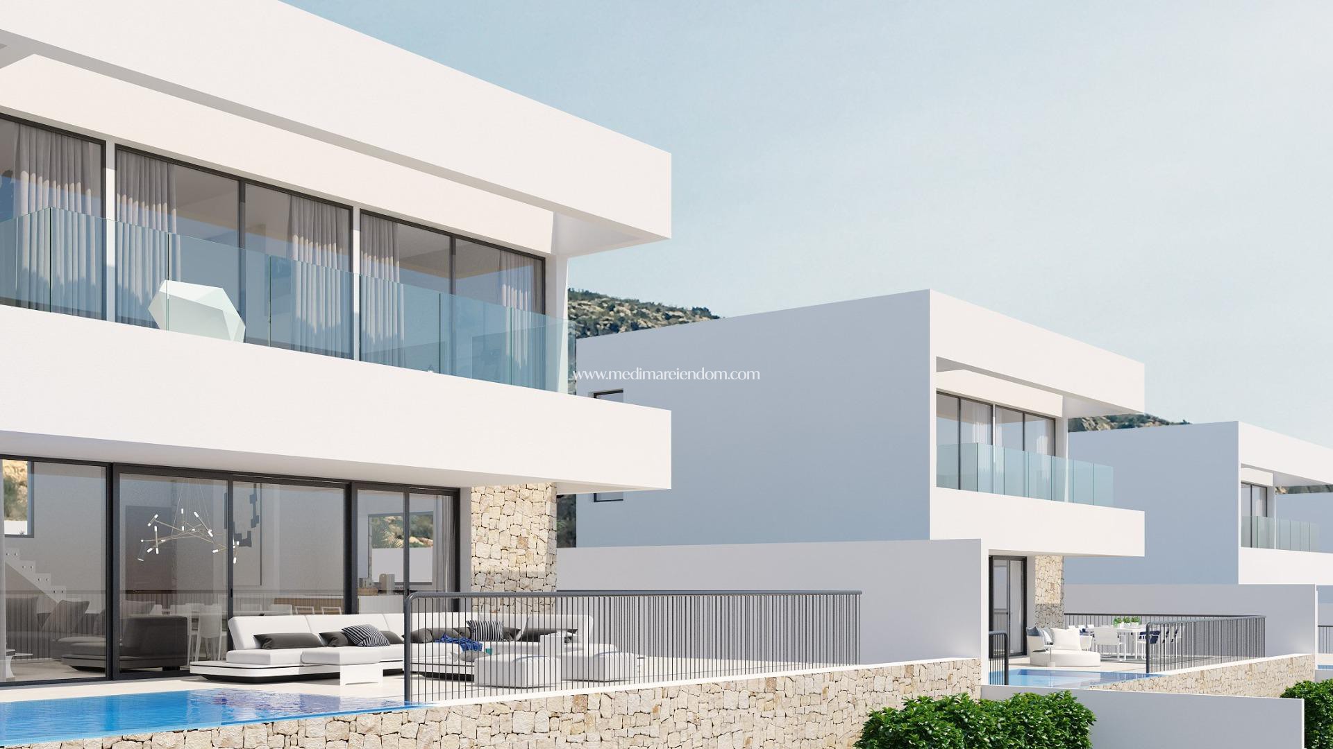 NYBYGD LUKSUSVILLA I FINESTRAT MED HAVUTSIKT Nybygget luksusvilla i Finestrat med fantastisk utsikt over havet og Benidorms skyline. Villa fordelt på 3 etasjer, har 4 soverom, 3 bad og 1 toalett, en stue og et kjøkken integrert i bare ett romslig rom, og utenfor har du en tomt på mer enn 400 m2, med vakre hager og et stort svømmebasseng hvor du kan leve vår middelhavsstil fullt ut. I kjelleren er det dobbel garasje, og en plass hvor du kan lage ditt gjestehus, lekerommet for barna eller ditt mest personlige område av huset. Finestrat ligger i Marina Baixa-regionen på Costa Blanca, nær nabobyen Benidorm og ca. 40 kilometer fra byen Alicante og den internasjonale flyplassen. Benidorm ligger bare en fem minutters kjøretur unna, og her finner du alt du trenger av butikker, barer, restauranter, supermarkeder, banker, apotek og flere private internasjonale skoler. Det er kort vei til de over 6 km lange strendene Levante, Poniente og Cala de Finestrat, som er blant de beste i Europa og har fått tildelt blått flagg av EU. Alle fritidstilbud som fornøyelsesparkene Aqua Natura, Terra Mítica, Terra Natura, Aqualandia og Mundomar, golfbanene Sierra Cortina og Villaitana, fotturer og klatring i Puig Campana, en enestående naturskjønn omgivelse, og nautisk sport.