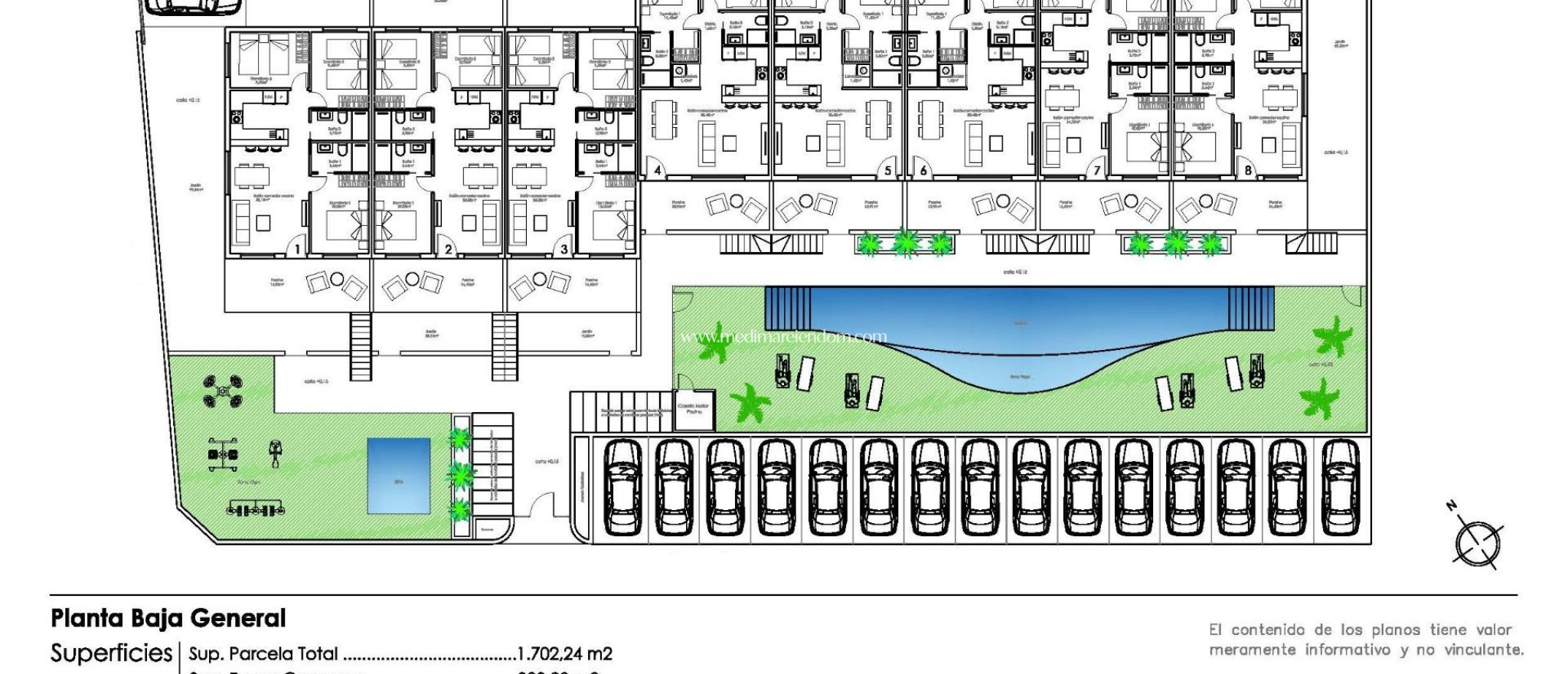Eksklusive nybyggede bungalower i Pilar de la Horadada - unik stil og privilegert beliggenhet En unik stil som definerer ditt nye hjem Dette nye prosjektet med bungalower med 2 og 3 soverom i Pilar de la Horadada skiller seg ut med sin moderne design og bølgende struktur, noe som gir hvert hjem en unik personlighet. Du vil kunne velge mellom: Første etasje med hage foran og uteplass på baksiden. Toppetasjer med privat solarium. Boligkomplekset har et felles svømmebasseng og romslige fellesområder designet for avslapning og glede for hele familien. I tillegg tilbyr anlegget et utendørs treningsstudio, felles boblebad og parkeringsplass for sykler, samt en parkeringsplass som er tildelt hver eiendom med mulighet for lading av elektriske kjøretøy, designet for å tilby deg maksimal komfort og livskvalitet. Lyst interiør av høy kvalitet Hvert hjem er designet for å gi en opplevelse av komfort og funksjonalitet. Åpen planløsning gir maksimal følelse av romslighet og lys, mens nøytrale fargetoner og treverk skaper en elegant og innbydende atmosfære. Romslige og lyse soverom, med hovedsoverommet som har utgang til en privat terrasse. Åpent kjøkken, integrert i stuen for enkelhets skyld. Moderne bad med materialer av topp kvalitet. Pilar de la Horadada - livskvalitet på Costa Blanca Pilar de la Horadada ligger i Alicante-provinsen, og er en kystby som kombinerer tradisjon med en avslappet atmosfære. Byen er kjent for sine vakre strender, som Playa de las Higuericas, med gyllen sand og krystallklart middelhavsvann. I tillegg til kystlinjen har byen en livlig hovedgate med butikker, supermarkeder, restauranter og pittoreske torg. Den utmerkede infrastrukturen omfatter sykkelstier, turstier og et bredt utvalg av sportsaktiviteter. Nærhet til viktige severdigheter Dette boligområdet tilbyr praktisk tilgang til de viktigste destinasjonene i området: Torre de la Horadada-stranden - 3 km (5 min kjøretur). Lo Romero golfbane - 5 km (10 min kjøretur). La Zenia Boulevard kjøpesenter - 15 km (15 min kjøretur). Corvera lufthavn (Murcia) - 40 km (40 min kjøretur). Alicante lufthavn - 55 km (55 min kjøretur). Sikre din Costa Blanca eiendom i dag Ikke gå glipp av muligheten til å kjøpe en splitter ny eiendom med en eksepsjonell beliggenhet. Kontakt oss i dag for mer informasjon og for å avtale visning.