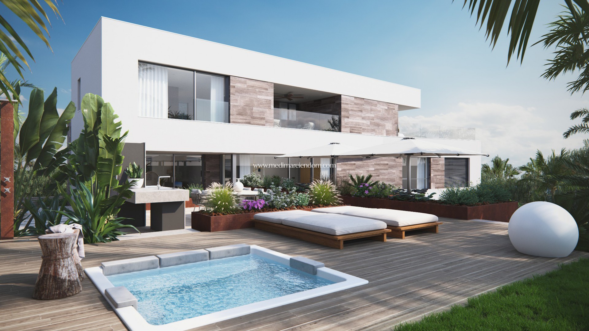 Villaen inkluderer fullt utstyrt hage på 1000 m2, med privat svømmebasseng, heis, garasje, SPA med Boblebad, badstue og dusj, grill, air condition, gulvvarme, 5 soverom, 3 bad ferdig ferdig, 2 toaletter, design kjøkken, stue, spisestue, vaskerom, bod, garasje for to biler og parkering, flere terrasser, solarium og veranda.