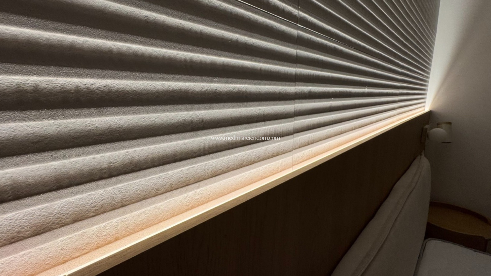 Denne totalrenoverte hjørneleiligheten i 6. etasje ligger bare 500 meter fra Middelhavet, og tilbyr privatliv, naturlig lys og panoramautsikt i et av de mest prestisjefylte områdene i Punta Prima. Den forhøyede toppetasjen og hjørneplanløsningen gir åpen utsikt over havet, saltsjøer, fjell og byens silhuett, med soloppganger og solnedganger synlige hele året. Leiligheten drar nytte av utmerket naturlig lys og en sterk følelse av åpenhet både dag og natt. Eiendommen har et bebygd areal på 70 m² og har blitt renovert til en høy standard. Alle vinduer åpner direkte ut mot terrassen, noe som skaper en sømløs innendørs-utendørs forbindelse og eliminerer interne terrasser. Panoramavinduer med lydisolasjon sikrer utmerket akustisk komfort samtidig som de opprettholder åpen utsikt. Interiøret har moderne designermøbler, natursteinselementer og store porselensfliser. Det fullt utstyrte kjøkkenet inkluderer induksjonstopp og kvalitetsapparater. Komfort sikres med inverter klimaanlegg med WiFi-kontroll, en programmerbar kjele og god isolasjon. Leiligheten selges fullt møblert og klar til umiddelbar bruk. Bygningen har heis og et felles svømmebasseng. En fullstendig fasaderenovering pågår for tiden og er fullt betalt, uten ekstra kostnader for den nye eieren. Leiligheten har turistlisens, og ny lisens kan utstedes på nytt etter hvert som lisenser utstedes i denne bygningen. Inngjerdet felles parkeringsplass med tak er tilgjengelig på stedet. En valgfri underjordisk parkeringsplass kan kjøpes for €10 000.
