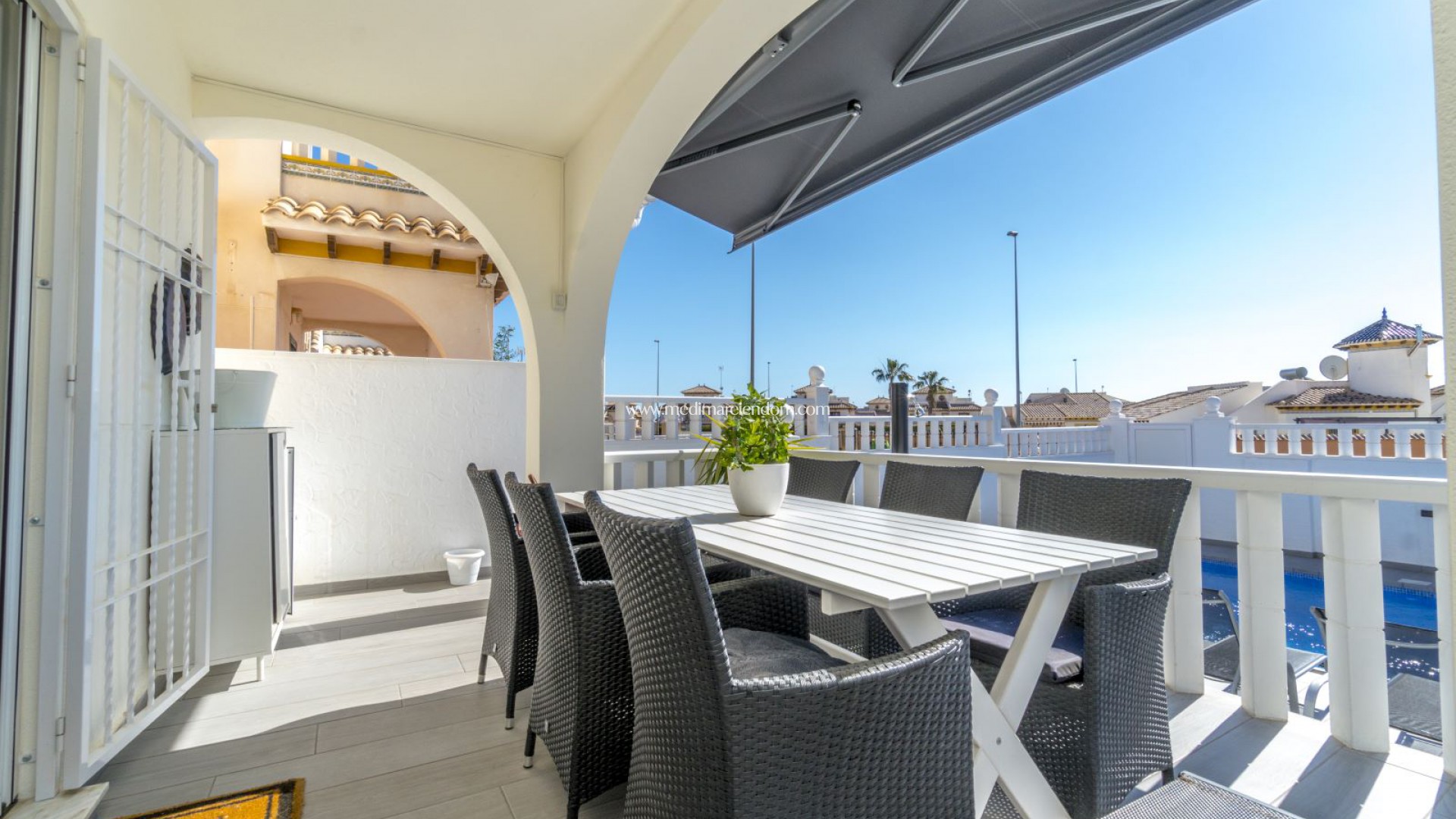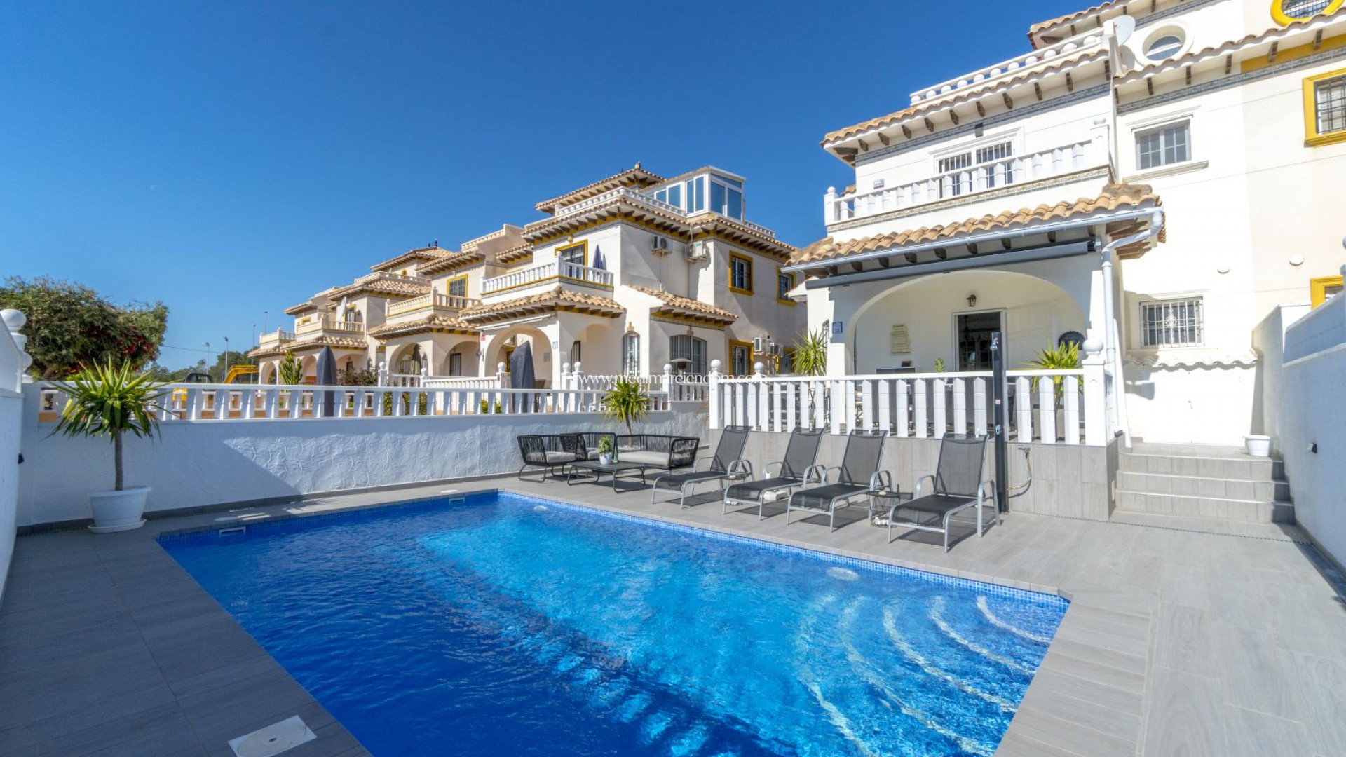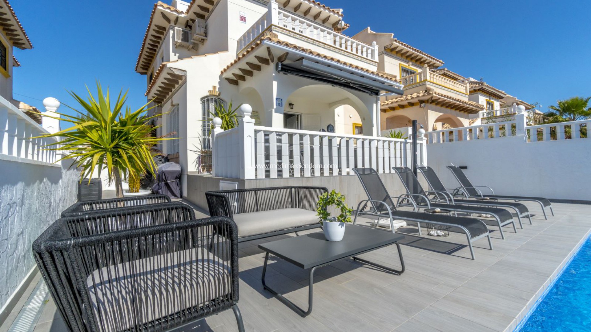 Refubrished townhouse in Lomas de Cabo Roig, Orihuela Costa. The property is built over 2 floors on the plot 116 m2 with private swimming pool On the ground floor there is a dining-living room with open plan kitchen and 1 bathroom. On the top floor there are 2 bedrooms and 1 bathrooms. There is also a roof terrace, storage room. The property has modern furniture and ready to move in.