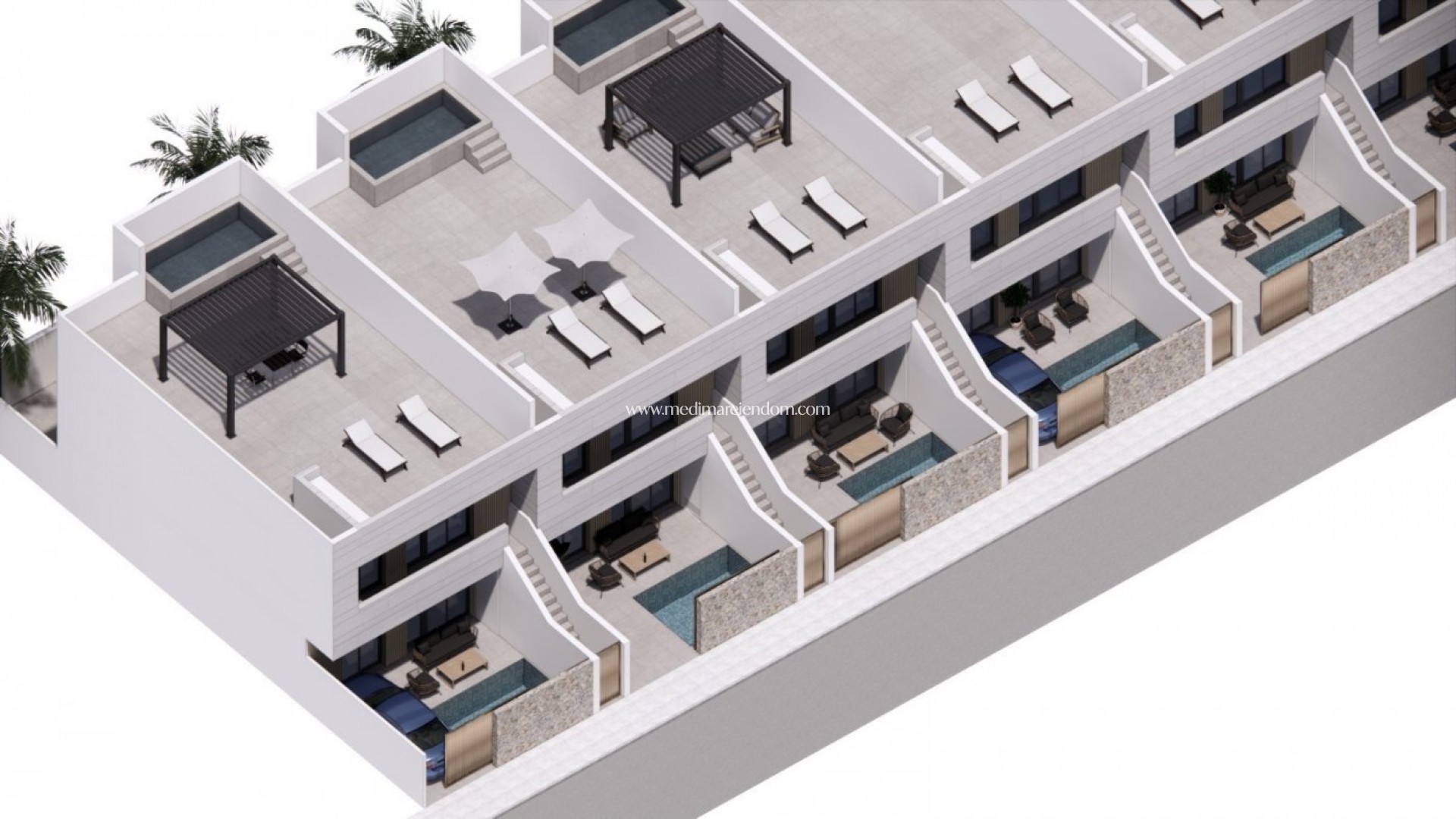 NEW BUILD BUNGALOWS IN SANTIAGO DE LA RIBERA New Build project with only 10 bungalow apartments, 5 Ground Floor and 5 top Floor apartments, all them with a private pool in Santiago de la Ribera. These apartments will be built to a high standard with a modern, light, open approach incorporated into the design, boasting 3 bedrooms and 2 bathrooms. The ground floor properties will have a back and a front garden with pool and the top floor properties will have a solarium with pool. Kitchen appliances and the complete installation of Air condition are included. Complex build in a perfect location, Santiago de la Ribera, a lovely town that sits on the shores of the Mar Menor. It is the coastal area of the town of San Javier and started life as a simple fishing village. It has now grown into a popular holiday destination, attracting not only the Spanish but also tourists from all over Europe. Santiago has a modern feel, although it still maintains its ‘fishing village’ atmosphere. It has a very beautiful promenade, which is lined by majestic palm trees and 2 kilometres of wonderful sandy beaches. From here you can take a boat trip out across the calm waters of the Mar Menor, to the La Manga Strip on the opposite side. The main shopping area is really in the town of San Javier, but there are some some shops in the narrow streets to browse, try visiting on a Wednesday morning when there is a large street market. The villas are walking distance to shops, bars, restaurants, Dos Mares shopping centre and the fantastic beaches of the Mar Menor and 20 minutes to the popular Zenia Boulevard - everything is within easy reach! Just 30 minutes from Cartagena city and the new International Murcia airport.