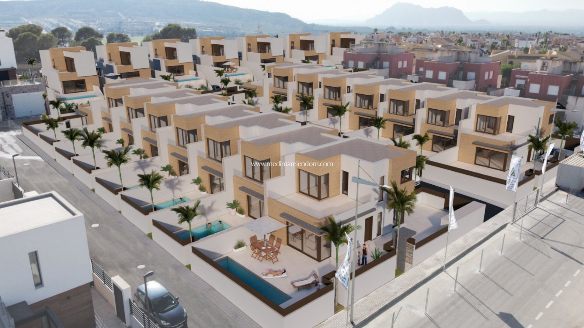 NEW BUILD RESIDENTIAL COMPLEX IN ALGORFA New Build complex of 14 townhouses, 2 semi-detached villas and 7 independent villas in La Finca Golf course, Algorfa. All properties equipped with finished basement, air conditioning, fully fitted kitchen with electrical appliances, fully equipped bathrooms, interior and exterior lights, fitted wardrobes, electric blinds, thermo regulation system, hot water by aerotermia, private garden with swimming pool and parking space. The properties consists of 3 bedrooms, 4 bathrooms, open plan kitchen with the living room, English patio in the basement, 2 terraces on the first floor. Vehicle access into the plot is through a motorized gate with remote control. Private pool equipped with: • Heat pump and underwater lighting • Outdoor shower • High-resistance tile coating Residential complex located in La Finca Golf resort, in the municipality of Algorfa, in the Vega Baja area of the Costa Blanca South. Only 15 minutes drive from the sandy beaches of Guardamar del Segura, and only 35 minutes from Alicante airport. The larger towns of Almoradi, Benijófar and Ciudad Quesada are a short drive away. Torrevieja and Orihuela Costa, with their large shopping centres, are 15 minutes away.