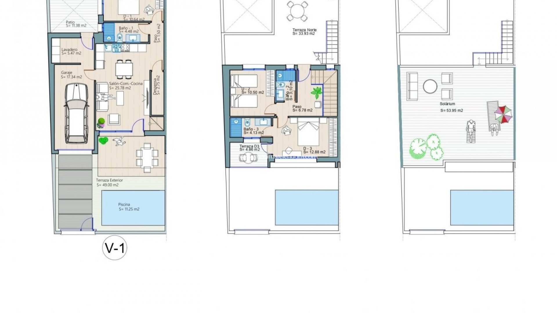 NEW BUILD TOWNHOUSES IN LOS ALCAZARES New Build residential luxury complex of 4 townhouses in Los Alcazares. Beautiful townhouses with private pool, terraced areas with Summer kitchen, covered garage and large solarium that allows you to enjoy all hours of sunshine, every day of the year. Each townhouse has 3 bedrooms and 3 fitted bathrooms. Designed on two levels with a contemporary style and open planned concept, comprising a fully-fitted kitchen and lounge-dining room. The development is located in Los Alcázares, 850 m. from to the beach, surrounded by all services, parks, sports facilities and several Golf Courses. The property will meet the highest standards and will be equipped with: Private swimming pool with LED lighting and shower. Kitchen completely furnished and equipped with oven and microwave in column, integrated fridge and dishwasher, ceramic hob and extractor fan. Lighting: LED inside the property (dining room, kitchen, corridors and bathrooms), and well as in outdoor areas. Lined wardrobes with drawers, shelves and clothes racks. Fully fitted bathrooms with design vanity unit, toilet, mirror and rainfall shower column with shower screens. Pre-installation for air conditioning. Terrace with Summer kitchen. Covered garage on the plot. Los Alcazares is a coastal town on the Mar Menor. It has all the necessary services within walking distance, leisure areas, health centre, commercial areas and the beach. Golf courses are just over 5 minutes away by car, the city of Cartagena less than 15 minutes by car, therefore having a wide cultural, gastronomic and sports offer within reach. Complex located 25 minutes from Murcia - Corvera airport and 1 hour from Alicante airport.