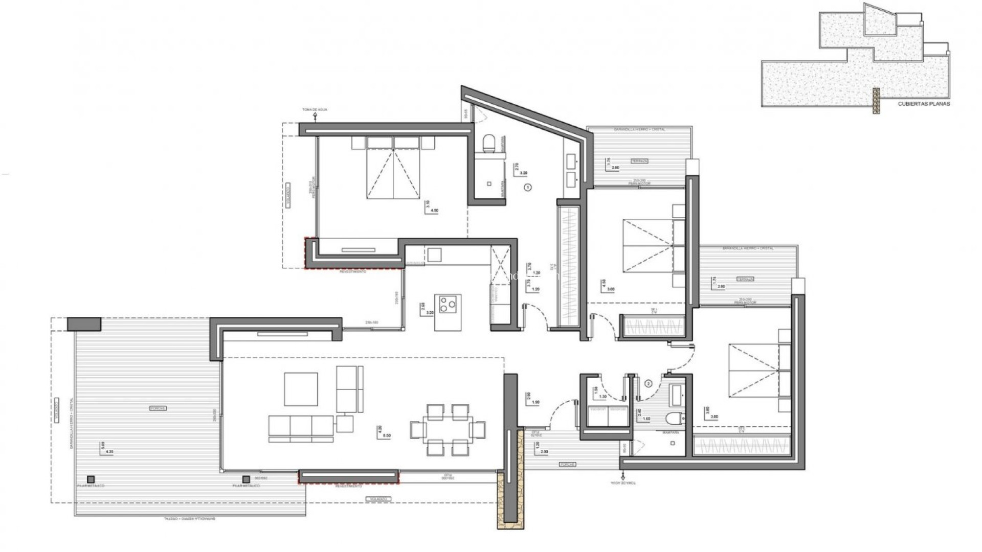 Design modern villa for sale at Cumbres del Sol A unique project for one of the last plots of land available in this part of the urbanization, an established area in residential Resort Cumbre del Sol, designed to get the best out of the sea views. Its location stands out, mainly, because it allows you to walk to the shopping centre “Adelfas”, where you can find services and a range of cuisine and Cumbre del Sol´s sports area. It is an ideal location if you want to do some sport, go out for a meal or simply go for a walk. A special project for those who are looking for a property with a unique design. A practical layout with intelligent solutions that manage to make the most of the space. The villa has 3 bedrooms, the main bedroom has a walk-in-closet and an en suite bathroom, the other two bedrooms have a shared bathroom and access to the terrace. There is an open plan kitchen to the living-dining room separated by an island, an extensive porch where you can enjoy long after-dinner conversations, landscaped areas around the terraces, an infinite pool, and many more details that make this property a unique home.