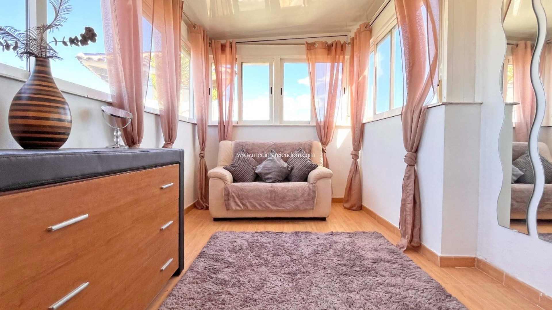 On the main level, you'll find a bright and spacious living room with a dining area, a separate fully equipped kitchen, and a modern bathroom. The glazed-in terrace overlooks the private pool and garden, creating an ideal space to relax and enjoy the outdoors year-round.