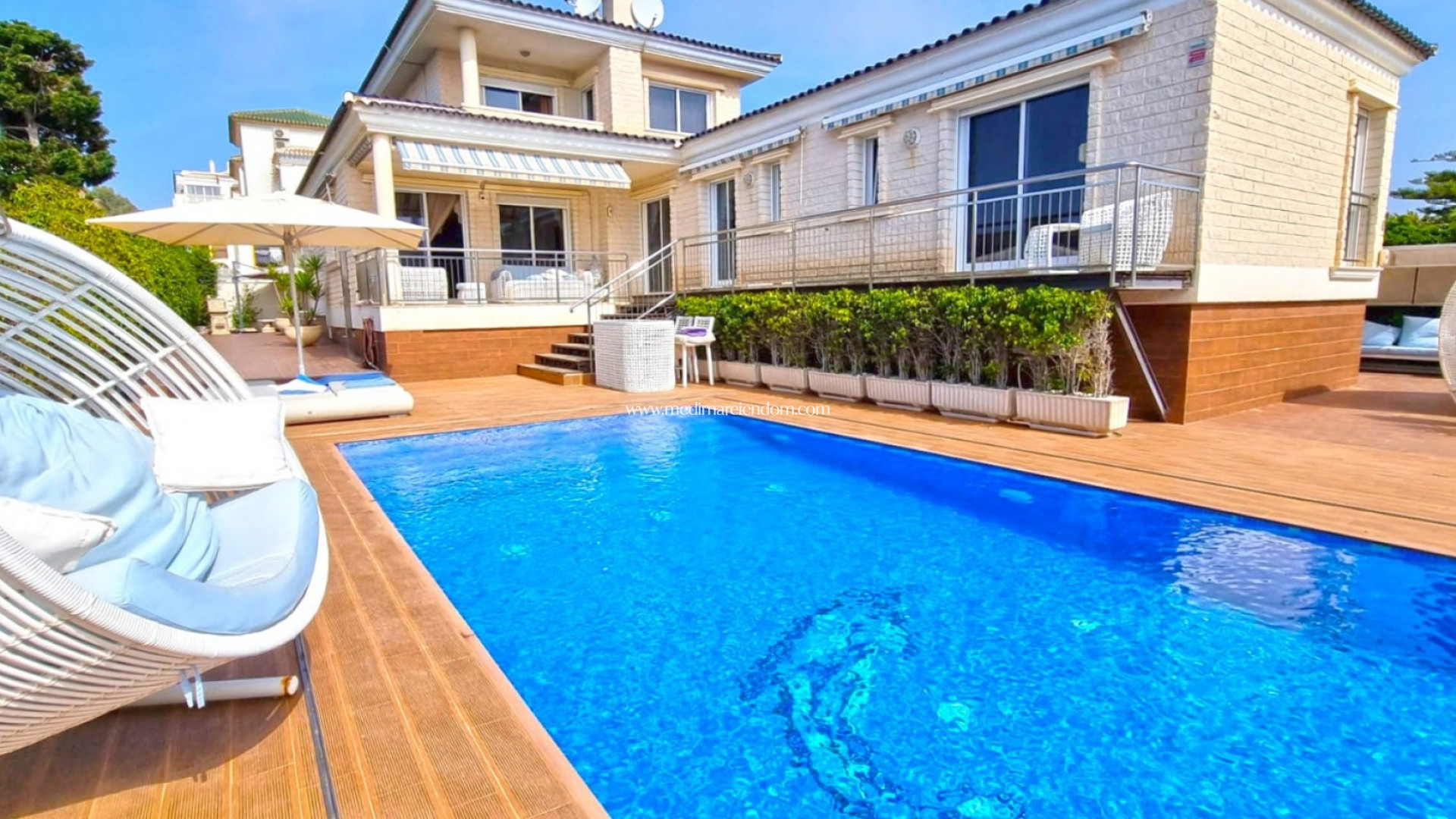 The villa sits on a large plot with multiple outdoor areas for entertaining and relaxation. The property includes: