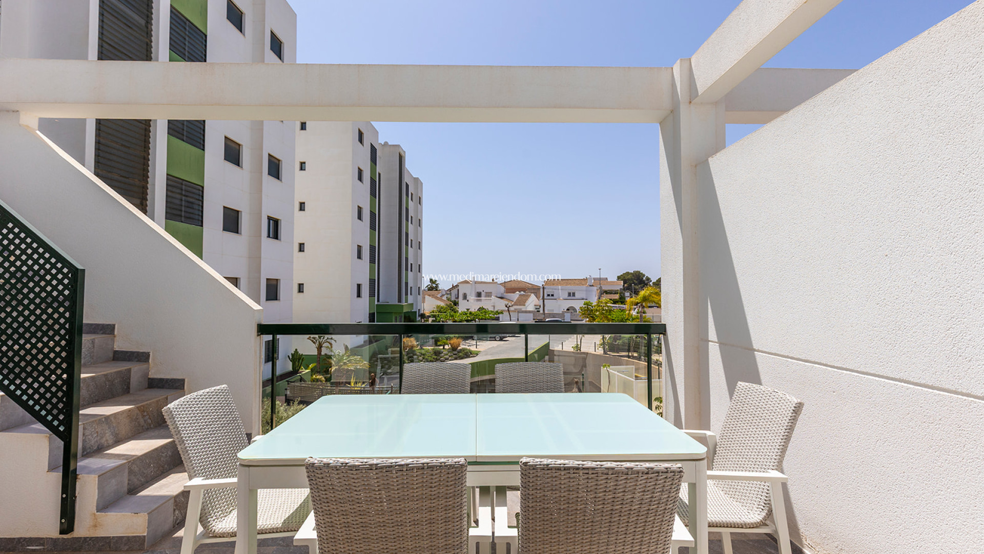 This modern apartment is located in the sought-after area of Mil Palmeras, in Pilar de la Horadada, just 400 meters from the white sandy beaches of the Mediterranean. Situated on the top floor of a two-story building constructed in 2020, it perfectly combines comfort, design, and a prime location. The property has a built area of 77.3 m² distributed over two bedrooms, two bathrooms, an Italian-style kitchen with breakfast bar, and a bright living room with access to a 12 m² terrace overlooking the communal areas. One of its standout features is the private 30 m² solarium with sea views, a retractable pergola, and a decorative vertical garden — ideal for enjoying the climate and the setting. The apartment is sold fully furnished and equipped with air conditioning, a private parking space, and lift access. The residential complex offers excellent communal facilities, including two swimming pools, an outdoor gym, chill-out areas, and palm-lined gardens that create a peaceful and welcoming atmosphere. Mil Palmeras is a well-established residential area offering all necessary services within walking distance: restaurants, supermarkets, shopping centers, and Blue Flag beaches with the "Q" for Tourist Quality certification. The property is just a 50-minute drive from Alicante airport and 5 minutes from various leisure and dining options, making it an excellent choice both as a year-round residence and for holiday rental investment.