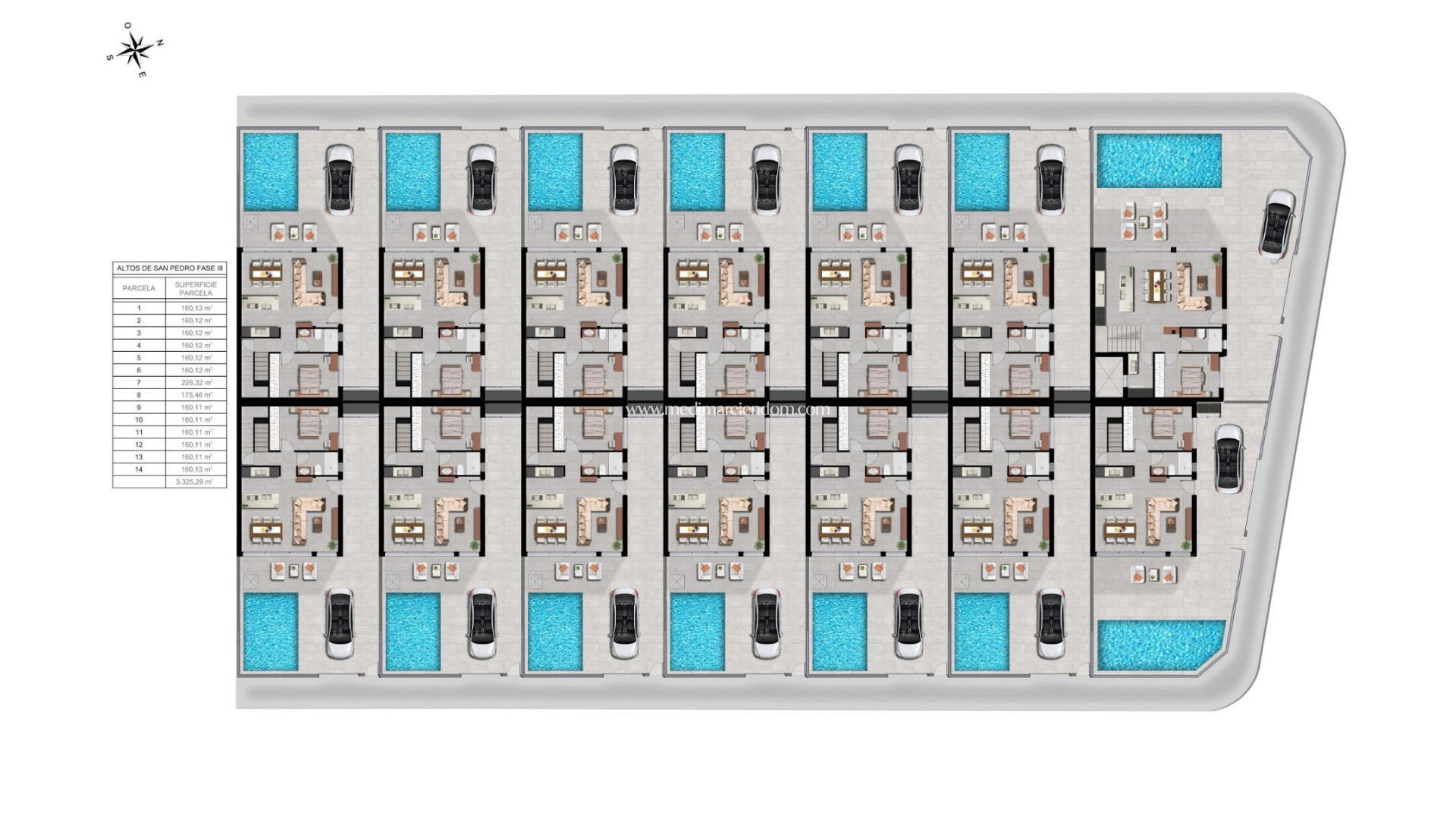Modern New Build Villas with Private Pool in San Pedro del Pinatar Contemporary Design and Premium Quality Living Discover the third phase of this exclusive residential project in San Pedro del Pinatar, where modern architecture meets comfort and functionality. These 14 semi detached villas are designed with a minimalist style and high quality finishes, offering an elegant and sophisticated living experience on the Costa Calida. Each villa features 3-4 spacious bedrooms, 3 bathrooms, private swimming pool, terraces and a private garden, creating the perfect environment for privacy, relaxation and Mediterranean outdoor living. San Pedro del Pinatar is one of the most sought after towns in the Mar Menor area, known for its natural salt lakes, calm beaches and year round pleasant climate, making it ideal for both permanent living and holiday use. Open Plan Layout Designed for Modern Life The villas are carefully distributed with an open plan kitchen connected to a bright living and dining area. Large windows in the living room with motorized blinds provide direct access to the pool area and allow natural light to flood the interior spaces. Key features of each property include: 3 bedrooms with built in wardrobes 3 fully equipped bathrooms with vanity units, mirrors and shower screens Furnished kitchen with Balay appliances included Private pool and garden area Interior and exterior LED lighting Terraces on the first floor and optional rooftop solarium On plot parking space Aerothermal system for hot water Photovoltaic solar panels for improved energy efficiency Pre installation of ducted air conditioning These homes are designed to combine sustainability, comfort and modern style in every detail. Prime Location Near Beaches and Services Located between the Mar Menor and the Mediterranean Sea, San Pedro del Pinatar is a paradise for beach lovers and water sports enthusiasts. The town offers a lively marina, natural mud baths, shops, restaurants, sports facilities and excellent services all year round. Beaches of the Mar Menor 3 km Mediterranean beaches 5 km Dos Mares Shopping Center 5 km Lo Romero Golf 10 km Roda Golf 15 km Murcia Corvera Airport 30 km Alicante Airport 80 km San Pedro Marina 4 km An Ideal Home for Lifestyle and Investment Thanks to their location, design and energy efficient features, these villas represent an excellent opportunity as a permanent residence, holiday home or rental investment in one of the most attractive areas of the Costa Calida. Contact us today for more information or to arrange a viewing and secure your new villa in San Pedro del Pinatar.