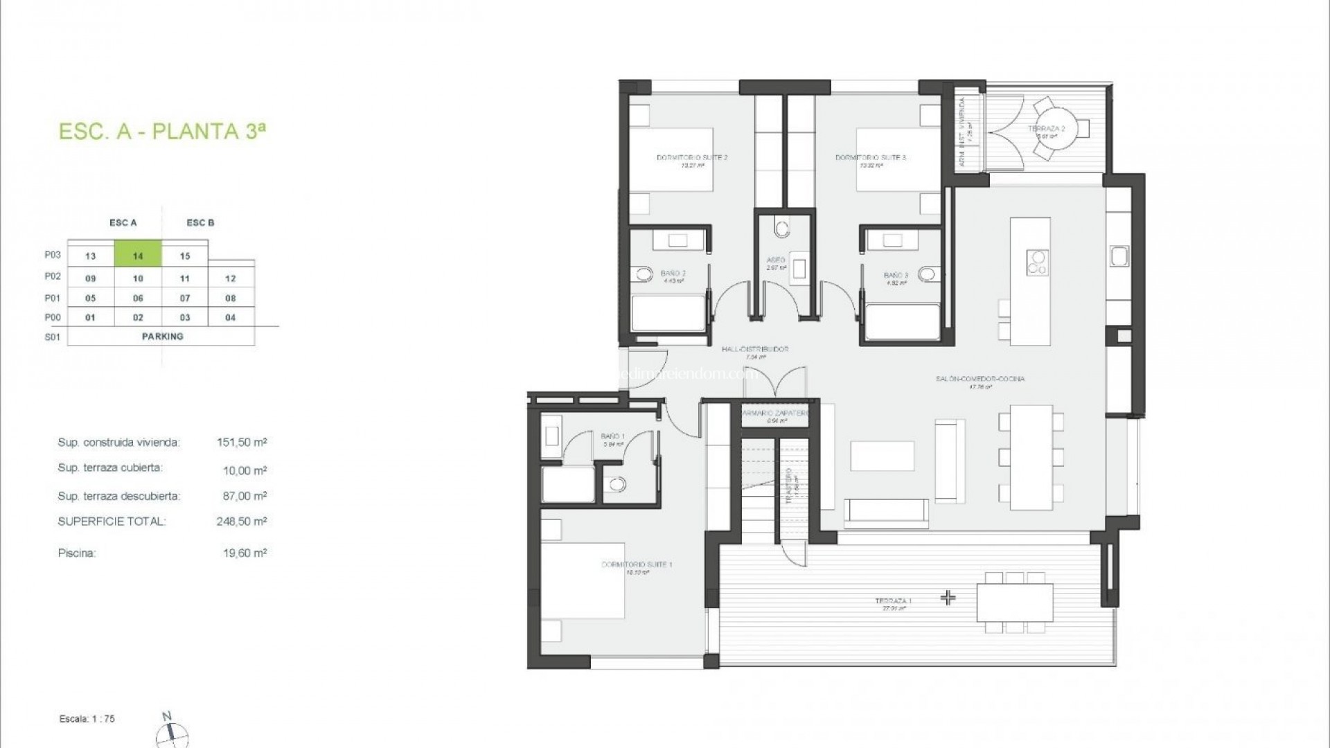 COMPLEJO RESIDENCIAL DE OBRA NUEVA EN LAS COLINAS GOLF La promoción de obra nueva consta de 15 apartamentos de lujo con enormes terrazas con vistas a la zona verde natural circundante. Hemos realizado una combinación de arquitectura mediterránea moderna y tradicional. Nuestra idea desde el principio ha sido hacer los apartamentos, con una descripción de materiales que incluye entre otros, calefacción por suelo radiante con agua, grifo quooker, sistema de renovación de aire, techos de reducción de sonido, cocinas lacadas, sistema de casa inteligente y mucho más. Teniendo en cuenta la ubicación privilegiada y las vistas creemos que el complejo ofrece las condiciones ideales para satisfacer los criterios de clientes con gusto exquisito. La tercera planta consta de 3 apartamentos: 2 apartamentos con 3 dormitorios, 3 baños y un aseo y 1 apartamento con 2 dormitorios y 2 baños. Desde los apartamentos se tiene acceso directo a grandes terrazas en el mismo nivel que el apartamento. Además, hay una escalera que lleva al solarium, donde cada apartamento de la planta superior tiene una piscina privada, un aseo, una cocina al aire libre con un pequeño ascensor desde la cocina de abajo y mucho más. En Las Colinas Golf & Country Club encontrará además una amplia variedad de servicios para los propietarios como tenis, padel-tenis, fitness, masajes, golf, senderismo y mucho más. Dentro de Las Colinas Golf & Country Club también encontrará varios restaurantes así como un minimarket con pan recién horneado y mucho más. Disfrutará de 200.000 metros cuadrados de hermosos paisajes mediterráneos y podrá realizar pintorescos paseos por la exuberante flora autóctona y los extensos campos de naranjos y limoneros. Complejo situado a 40 minutos del aeropuerto de Alicante y a 1 hora del aeropuerto de Murcia - Corvera.