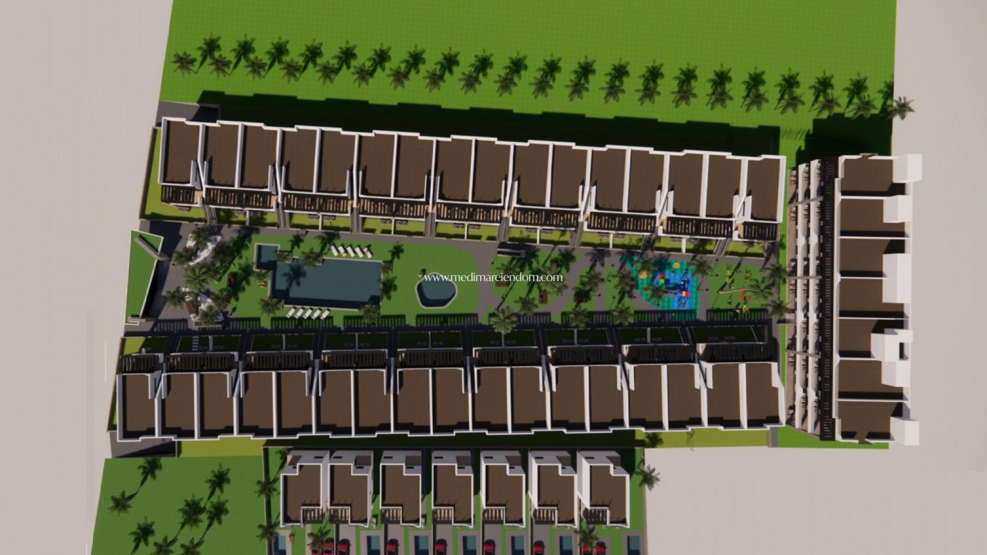 COMPLEJO RESIDENCIAL DE NUEVA OBRA EN PUNTA PRIMA Complejo residencial de nueva construcción de bungalows y 7 chalets independientes en Punta Prima. Los bungalows están distribuidos en tres bloques. Bungalows de planta baja con jardín privado y bungalows de planta alta con solarium privado. Preciosos bungalows de 2 o 3 dormitorios, cocina abierta con el salón, armarios empotrados, lavadero y amplias terrazas. Cada bungalow dispone de plaza de aparcamiento. La urbanización ofrece bonitas zonas verdes con parque infantil, gimnasio y dos piscinas comunitarias. Complejo situado a pocos metros del centro de Punta Prima donde encontrará todos los servicios que pueda necesitar. En los alrededores encontrará una amplia gama de agradables restaurantes, cafeterías, supermercados, farmacias y todas las comodidades que pueda necesitar. Punta Prima, situada a tan sólo 5 km de Torrevieja, se caracteriza por sus buenas infraestructuras de comunicación y sanitarias, la cercanía al aeropuerto de Alicante, y la cantidad de servicios abiertos durante todo el año. A tan sólo 10 km podemos encontrar los campos de golf de Villamartín, Campoamor, Las Ramblas, Las Colinas y Lo Romero, así como los centros comerciales de La Zenia y Habaneras.