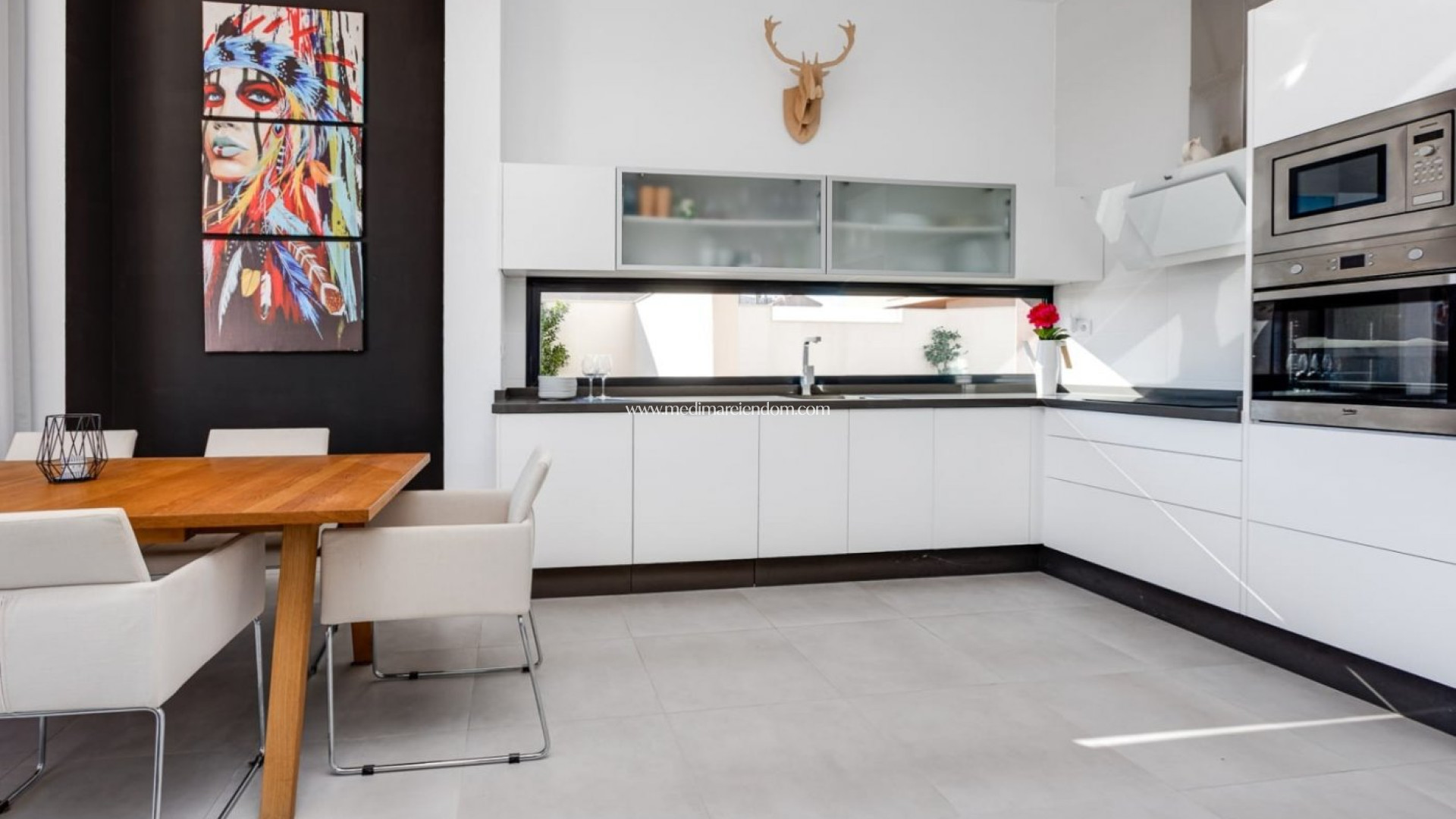 VILLAS DE OBRA NUEVA EN PILAR DE LA HORADADA Residencial de obra nueva de 6 chalets en Pilar de la Horadada. Las villas de nueva construcción de una sola planta tienen 3 dormitorios, 2 baños, cocina abierta con el salón, armarios empotrados, jardín privado con plaza de aparcamiento. Una opción para un solarium y una piscina privada a un costo adicional. Estas fantásticas casas están revestidas de piedra natural para un mantenimiento mínimo, la doble altura del salón y los grandes ventanales proporcionan mucha luz natural. Pilar de la Horadada es la ciudad y el municipio más meridional de la Costa Blanca en la provincia de Alicante. La ciudad se encuentra en la frontera entre la Comunidad Valenciana y la región de Murcia. La ciudad de Pilar de la Horadada es un típico pueblo español situado a sólo 2 km de la costa y de las populares playas de Torre de la Horadada. En el centro de Pilar de la Horadada encontrará todos los servicios: tiendas, pastelerías, bancos, etc. a lo largo de la calle principal 'Calle Mayor'. También experimentará un maravilloso ambiente cerca de la iglesia local en la 'Plaza de la Iglesia' donde hay varios cafés. En Pilar de la Horadada también hay una red de senderos para ciclistas y caminantes bien desarrollada, y también hay una gran oferta de diversas actividades deportivas. El campo de golf Lo Romero de 18 hoyos está a poca distancia del pueblo. Los aeropuertos de Corvera (Murcia) y Alicante están a 40 y 55 minutos respectivamente.