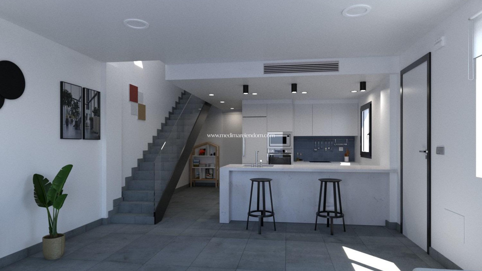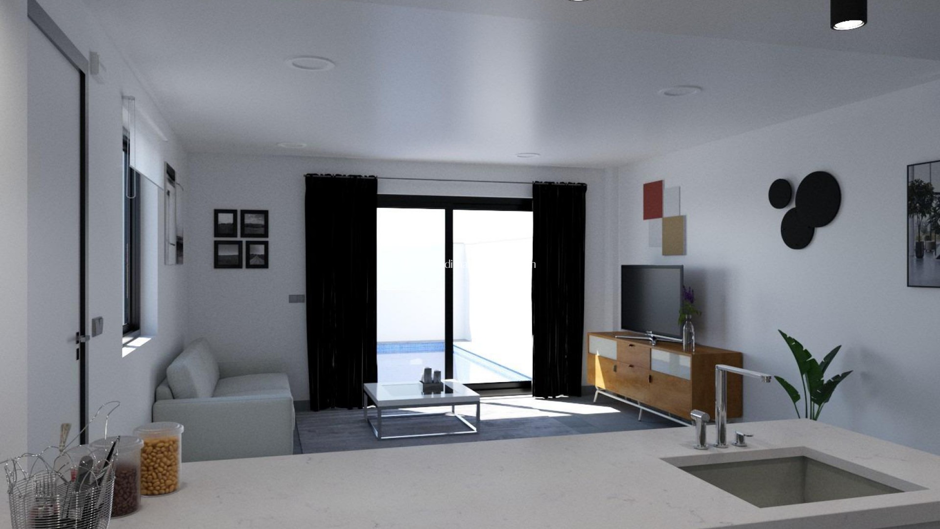 VILLAS PAREADAS DE OBRA NUEVA EN SAN PEDRO DEL PINATAR Villas pareadas de obra nueva en San Pedro del Pinatar. Proyecto de obra nueva de 2 villas pareadas de 3 dormitorios y 3 baños, cocina abierta al salón, armarios empotrados, jardín privado con piscina y ducha exterior, ideal para los días calurosos, plaza de garaje, solarium privado equipado con cocina de verano, con tres módulos, encimera de granito y fregadero con agua fría y caliente. En cuanto a la climatización, cada villa dispone de preinstalación de aire acondicionado por planta con sistema de conductos internos en falso techo. La ubicación privilegiada de San Pedro del Pinatar en el Mar Menor y la costa mediterránea atrae a aquellos con un interés en la navegación y los deportes acuáticos, proporcionando amarres en el puerto deportivo y clubes náuticos, mientras que las playas y los baños de barro naturales atraen a aquellos que buscan sol seguro, mar y arena. San Pedro del Pinatar tiene una comunidad establecida y ofrece una excelente gama de actividades, incluyendo piscina cubierta e instalaciones deportivas, así como un programa de actividades sociales durante todo el año por el agradable clima invernal. Los beneficios de los baños de barro, típicos de la región, o las tranquilas aguas del Mar Menor, han favorecido el crecimiento de Lo Pagán, que actualmente cuenta con todo tipo de comodidades. Además, cuenta con una excelente ubicación, a tan sólo 5 minutos del Centro Comercial Dos Mares. El aeropuerto de Murcia/Corvera se encuentra a 30 minutos y el de Alicante a una hora en coche.