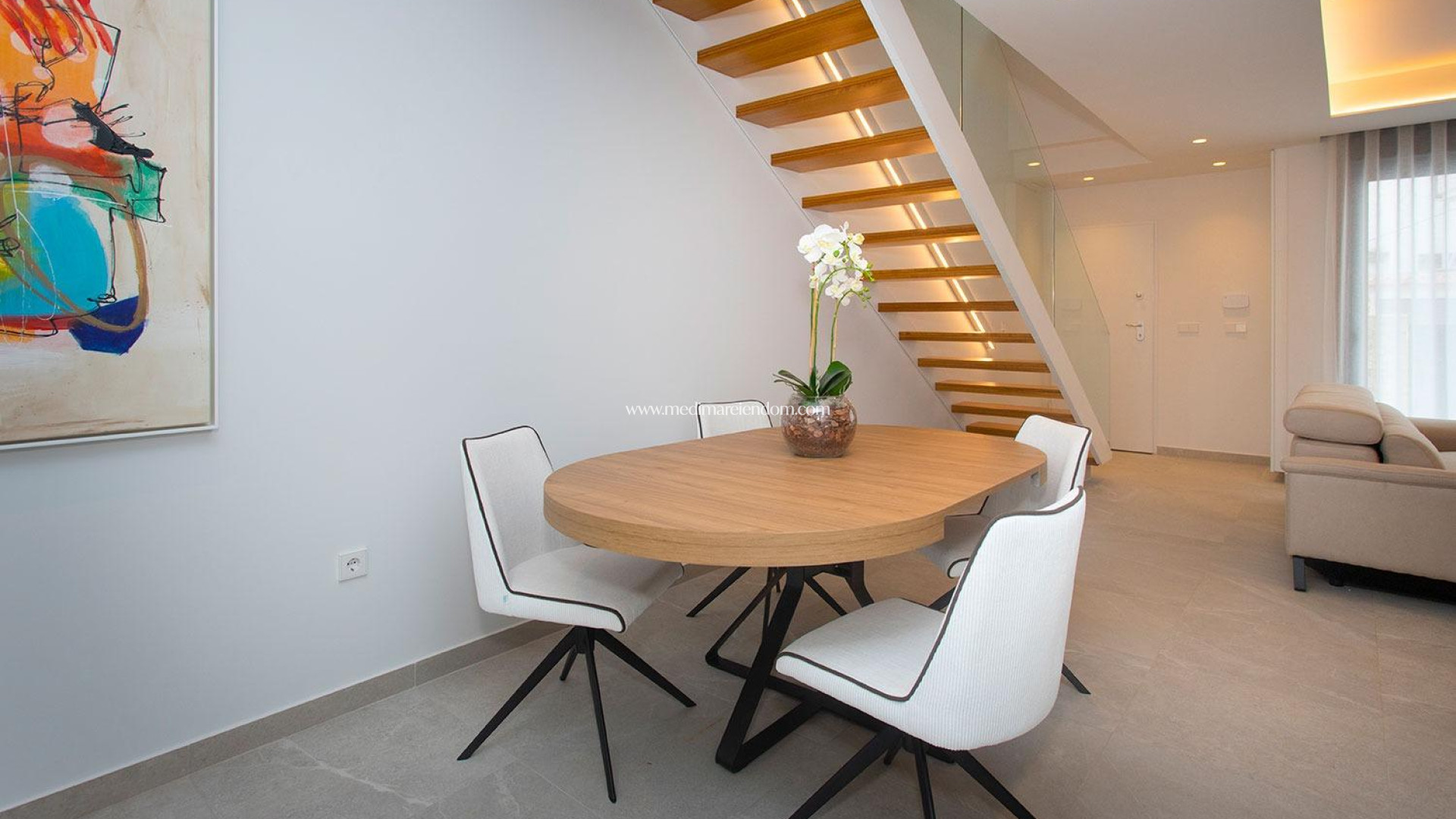 ADOSADOS DE OBRA NUEVA EN TORRE DE LA HORADADA Proyecto de obra nueva que destaca por su diseño exterior, una combinación de líneas puras y elementos revestidos, que dan un estilo único, moderno y elegante a esta vivienda en primera línea de playa. Con orientación sureste y ubicada en una zona residencial consolidada, la convierte en una vivienda ideal para disfrutar de la vida mediterránea. Su distribución interior también merece especial atención, detalles que han sido cuidadosamente pensados para proporcionar el máximo confort a sus propietarios y realzar la estética del espacio. Así, en la planta principal se ha creado un espacio "abierto y luminoso" donde salón, comedor y cocina se comunican a través de puertas correderas con un patio interior para uso y disfrute al aire libre durante todo el año. La sencillez es la clave de esta colección. De nuevo, con una sencilla estructura metálica blanca y barandilla de cristal, la escalera se convierte en el complemento perfecto para mantener la luminosidad y amplitud desde la entrada. Un dormitorio con acceso al patio y un baño completan la distribución de esta planta. A este adosado aún le espera una parte muy especial: su planta de arriba. Subiendo las escaleras se llega a un espacio chill out, antesala del solarium: un acogedor rincón con zona de lectura y escritorio. Este rellano multifuncional da paso a dos amplios dormitorios, uno de ellos con terraza privada y ambos comparten un elegante baño con sus 10m2 de superficie. Torre de la Horadada se encuentra al sur de Alicante en una preciosa ubicación en la costa. Las hermosas playas de Torre de la Horadada y Mil Palmeras tienen arena fina hermoso paseo marítimo. Hay un montón de restaurantes, bares y tiendas, también deportes acuáticos, buceo y snorkel. Está bien comunicado a sólo 40 minutos de los aeropuertos de Alicante y Murcias Corvera, con grandes centros comerciales y múltiples campos de golf a poca distancia.