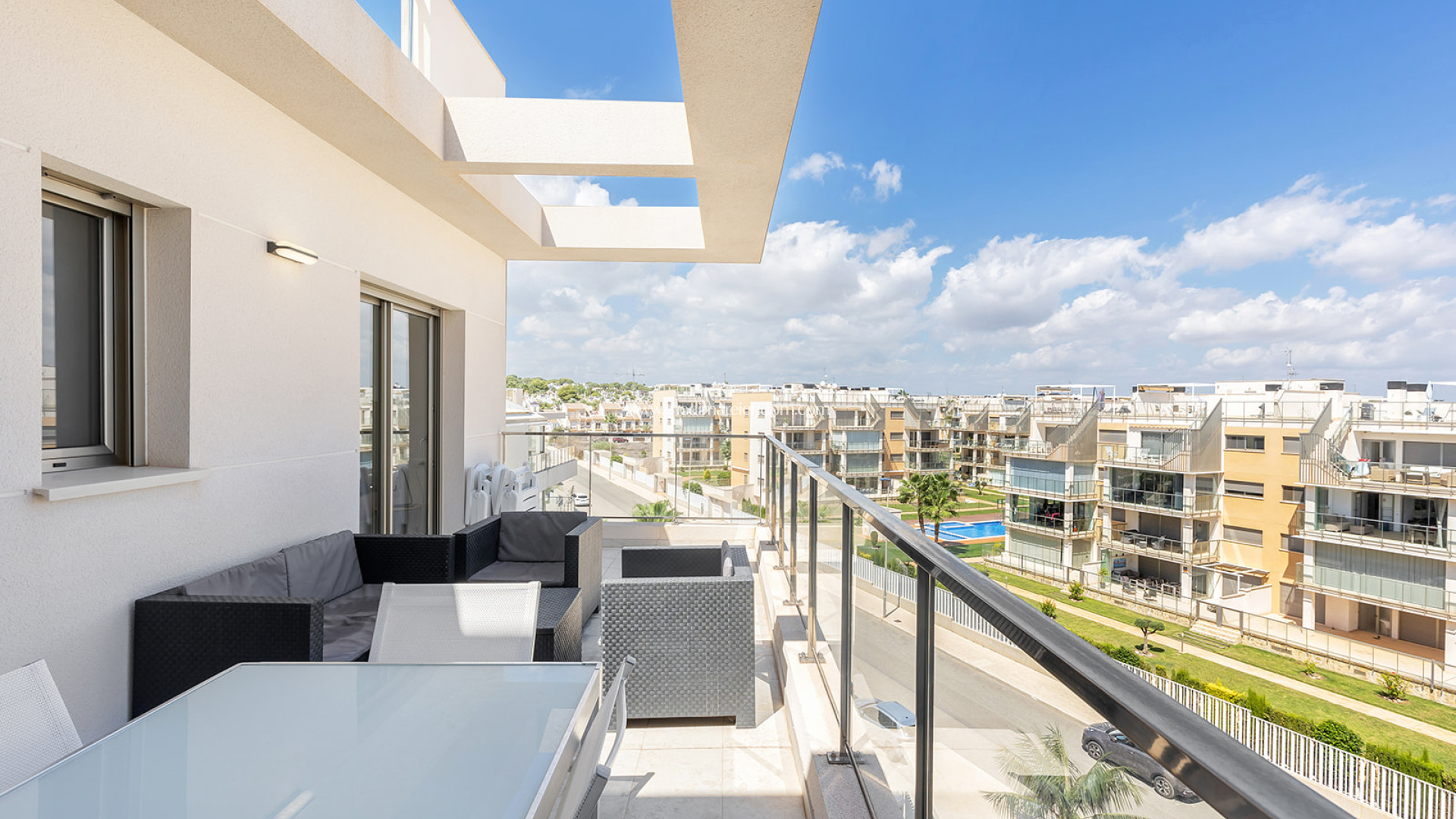 Ático con solárium en VIllamartín, Orihuela Costa. Este impresionante apartamento en última planta ofrece un amplio salón-comedor y cocina abierta, totalmente equipada con electrodomésticos junto con una terraza de 18m2. La vivienda cuenta con tres luminosas habitaciones y un solárium privado de 43m2 con ducha abierta. Incluido en el apartamento viene una plaza de aparcamiento y un trastero privado en el sótano. Se encuentra en el residencial Green Hills donde se puede disfrutar de piscina cubierta climatizada, 2 piscinas exteriores, gimnasio y zonas ajardinadas. Villamartín es una prestigiosa zona dotada de todos los servicios y comodidades entre el golf y el mar. Muy cerca está La Zenia Boulevar, que es el centro comercial más grande de la provincia de Alicante. También en las cercanías esta el Campo de Golf de Villamartín, a 5 minutos de la playa, del Real Club de Golf Campoamor y del Campo de Golf Las Ramblas, rodeados de colegios, centros comerciales, restaurantes, farmacias, paradas de autobús que favorecen la estancia durante todo el año. Conecta fácilmente con la carretera nacional N-332 y la autovía del mediterráneo AP-7.