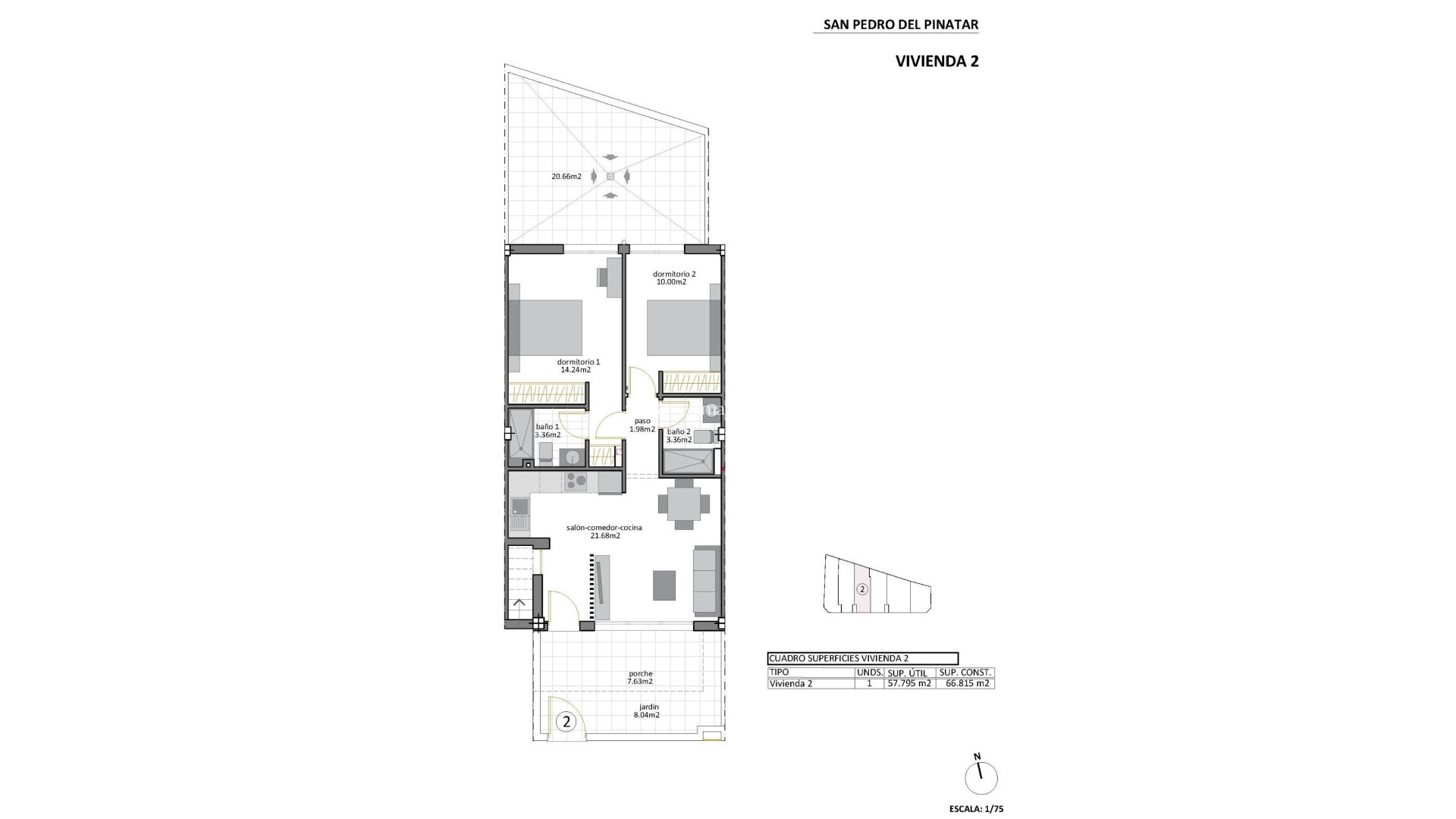 Bungalows de nueva construcción en San Pedro del Pinatar - Ubicación privilegiada a sólo 500 m de la playa Exclusivas viviendas de estilo boutique cerca de la costa Descubra estos elegantes bungalows de nueva construcción en el corazón de San Pedro del Pinatar, a sólo 500 metros de las impresionantes playas del Mar Menor. Esta promoción boutique incluye sólo ocho viviendas exclusivas, que combinan diseño moderno, confort y un tranquilo estilo de vida costero. Modelos disponibles para adaptarse a su estilo de vida Modelo Jardín/Planta Baja: Cuenta con una terraza delantera y un amplio patio trasero, perfecto para vivir al aire libre. Modelo Ático Loft: Incluye un solarium privado en la azotea y una terraza delantera, que ofrecen vistas abiertas y abundante luz solar. Detalles del modelo Garden/Planta Baja Entre en un luminoso salón que conecta a la perfección con el comedor y una cocina totalmente equipada. Las grandes puertas correderas de cristal dejan entrar la luz natural, creando un ambiente abierto y acogedor. La distribución incluye dos amplios dormitorios, el principal con baño en-suite y un moderno baño familiar. Aspectos destacados del modelo Ático Se accede al ático a través de una escalera privada que conduce a una gran terraza. En el interior, un salón y un comedor de planta abierta se combinan con una cocina totalmente equipada. Incluye dos dormitorios, el principal con baño en-suite. Un solarium privado en la azotea, accesible desde la cocina, ofrece un lugar ideal para relajarse o entretenerse. En la planta baja hay un trastero para mayor comodidad. Características principales Iluminación LED interior y exterior. Cocina totalmente equipada con placa de inducción, horno, lavavajillas y frigorífico/congelador. Aire acondicionado instalado. Plaza de aparcamiento. Jardín comunitario con piscina para residentes. San Pedro del Pinatar: Encanto costero y comodidad Situado en las hermosas costas del Mar Menor y el Mediterráneo, San Pedro del Pinatar es un paraíso para los deportes acuáticos, los entusiastas de la vela y los amantes de la playa. La cercana zona de Lo Pagán ofrece baños de barro natural, aguas tranquilas y servicios durante todo el año, como tiendas, restaurantes y locales de ocio. Distancias a los principales puntos de interés: Centro Comercial Dos Mares: 5 km Aeropuerto Murcia/Corvera: 30 km Aeropuerto de Alicante: 75 km Campos de golf locales: 10-20 km Puerto deportivo y clubes náuticos: 2 km Reserve hoy la casa de sus sueños Con la finalización prevista para finales de 2025, ahora es el momento perfecto para asegurar su nuevo hogar en San Pedro del Pinatar. No pierda esta oportunidad de disfrutar de una mezcla de elegancia moderna y tranquilidad costera. Póngase en contacto con nosotros hoy mismo para obtener más información o concertar una visita.
