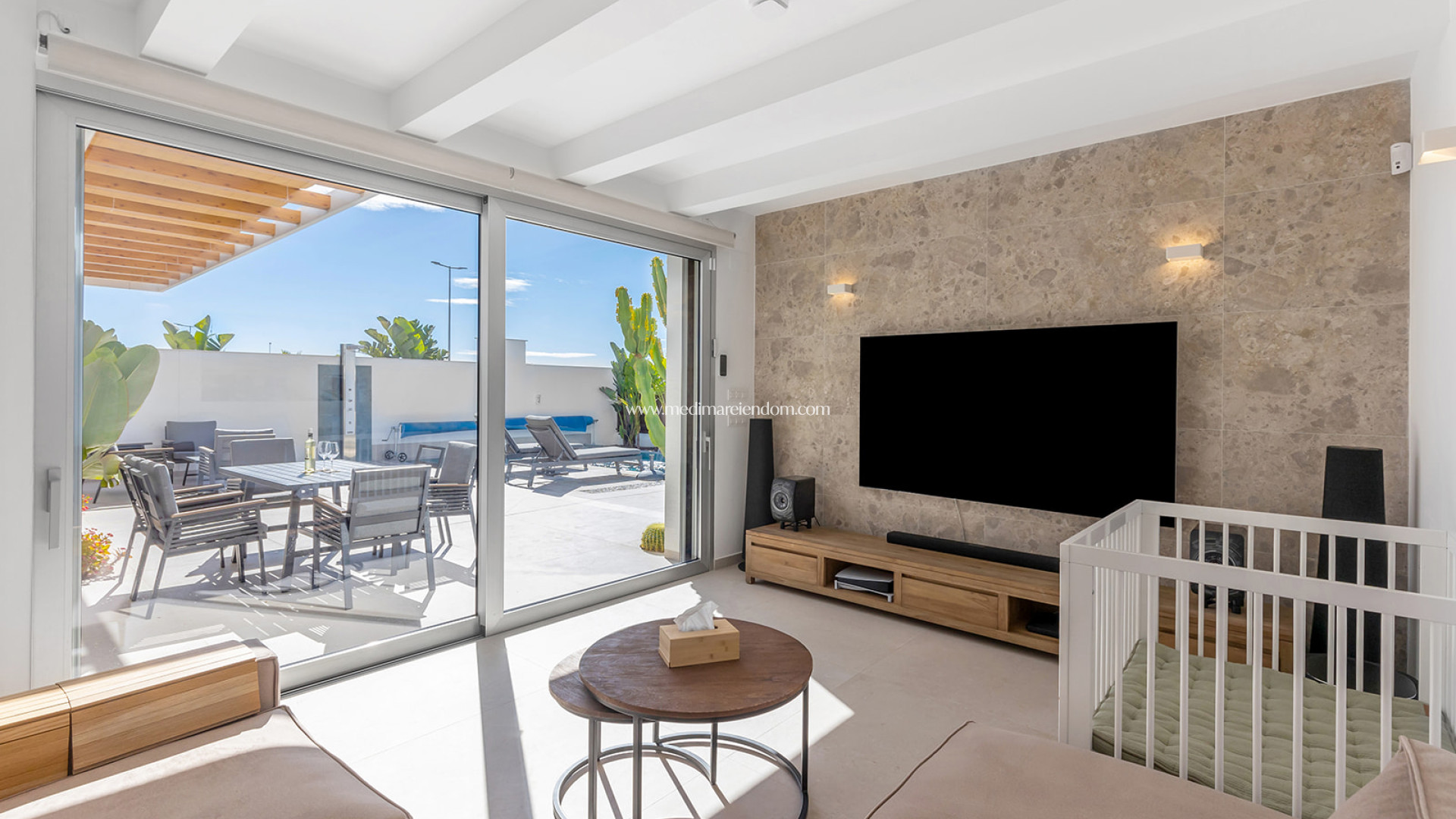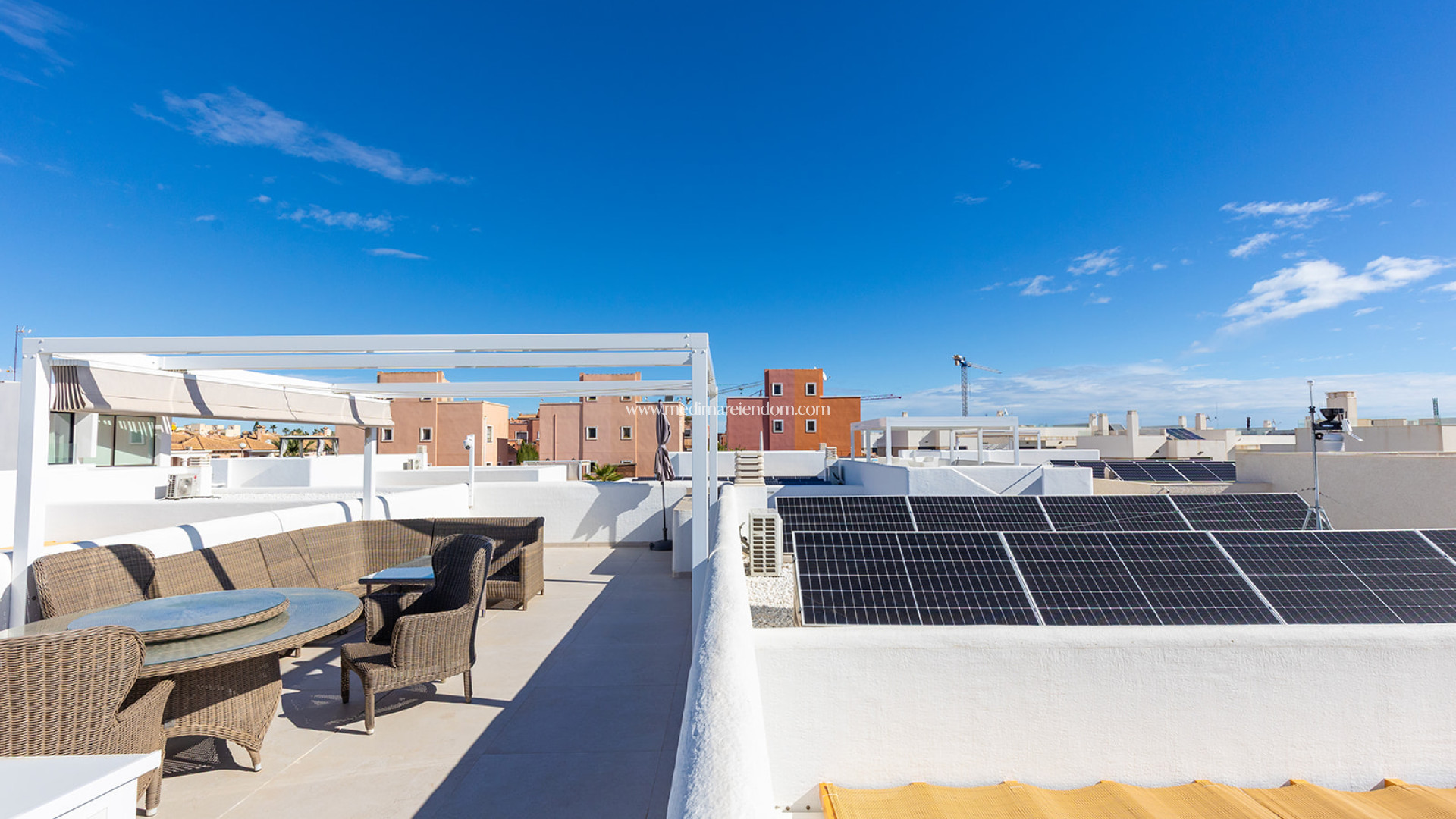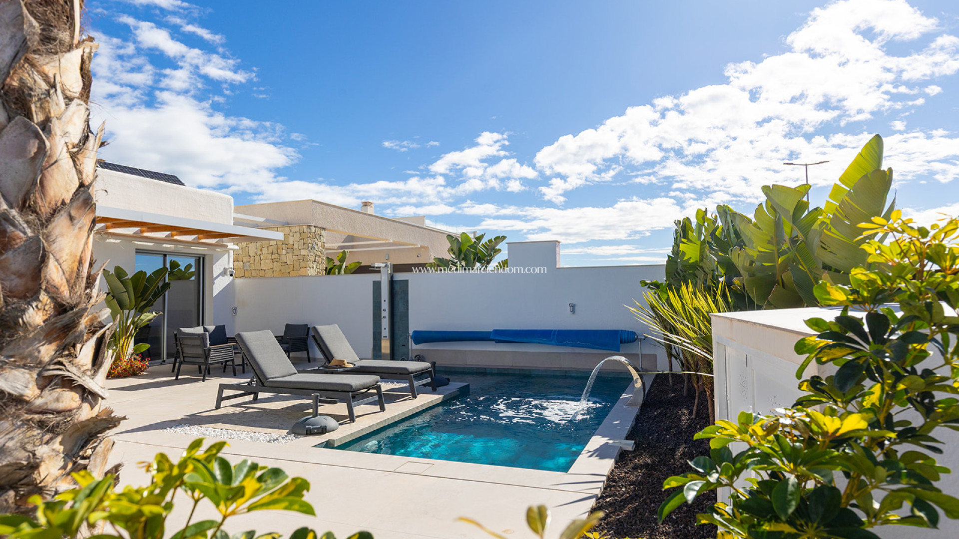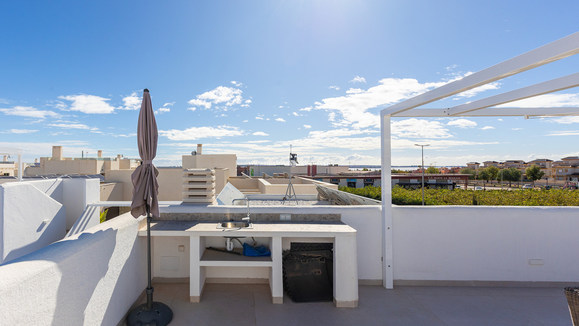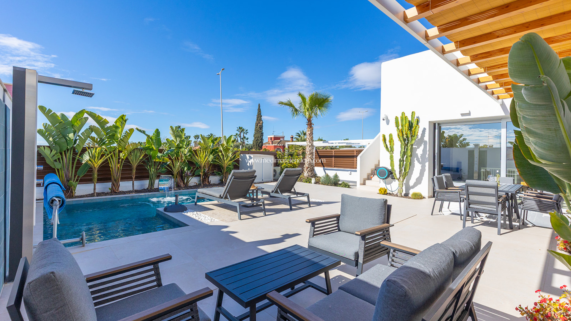 Esta moderna villa se encuentra en la tranquila urbanización de La Herrada, en Los Montesinos. La propiedad ofrece una superficie construida de 114 m² sobre una parcela de 257 m², distribuida en una sola planta con un diseño en forma de L, optimizando el espacio y garantizando una distribución cómoda y funcional. Dispone de tres dormitorios y dos baños, proporcionando estancias amplias y luminosas para una vida confortable. La vivienda cuenta con una piscina climatizada privada, ideal para disfrutar del baño durante todo el año y aprovechar al máximo el clima mediterráneo en un entorno de total privacidad. Además, dispone de un solárium de 47 m², perfecto para tomar el sol y apreciar las vistas panorámicas de la zona. Se entrega totalmente amueblada, con una cocina equipada y acabados de alta calidad en todas las estancias. La orientación suroeste de la propiedad garantiza una excelente iluminación natural durante todo el día. También cuenta con un jardín privado y un trastero, ofreciendo espacio adicional de almacenamiento. Ubicada a aproximadamente 10 km del mar, la villa permite un acceso rápido a las hermosas playas de la Costa Blanca. La zona de Los Montesinos es conocida por su ambiente tranquilo y familiar, ofreciendo una amplia gama de servicios y comodidades, como supermercados, restaurantes y centros comerciales. Su excelente infraestructura y conexiones de transporte facilitan el acceso a otras áreas de interés en la Costa Blanca, convirtiéndola en una opción ideal tanto para residencia permanente como para inversión vacacional.