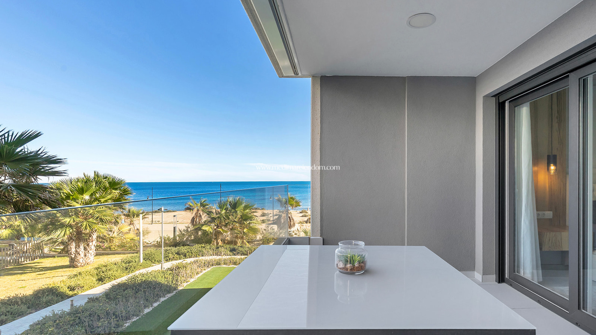 Este elegante apartamento de 2 dormitorios y 2 baños se encuentra en primera línea, ofreciendo impresionantes vistas abiertas al mar. Su diseño moderno y luminoso crea un ambiente acogedor y relajante, ideal tanto para vivir todo el año como para disfrutar de estancias vacacionales.