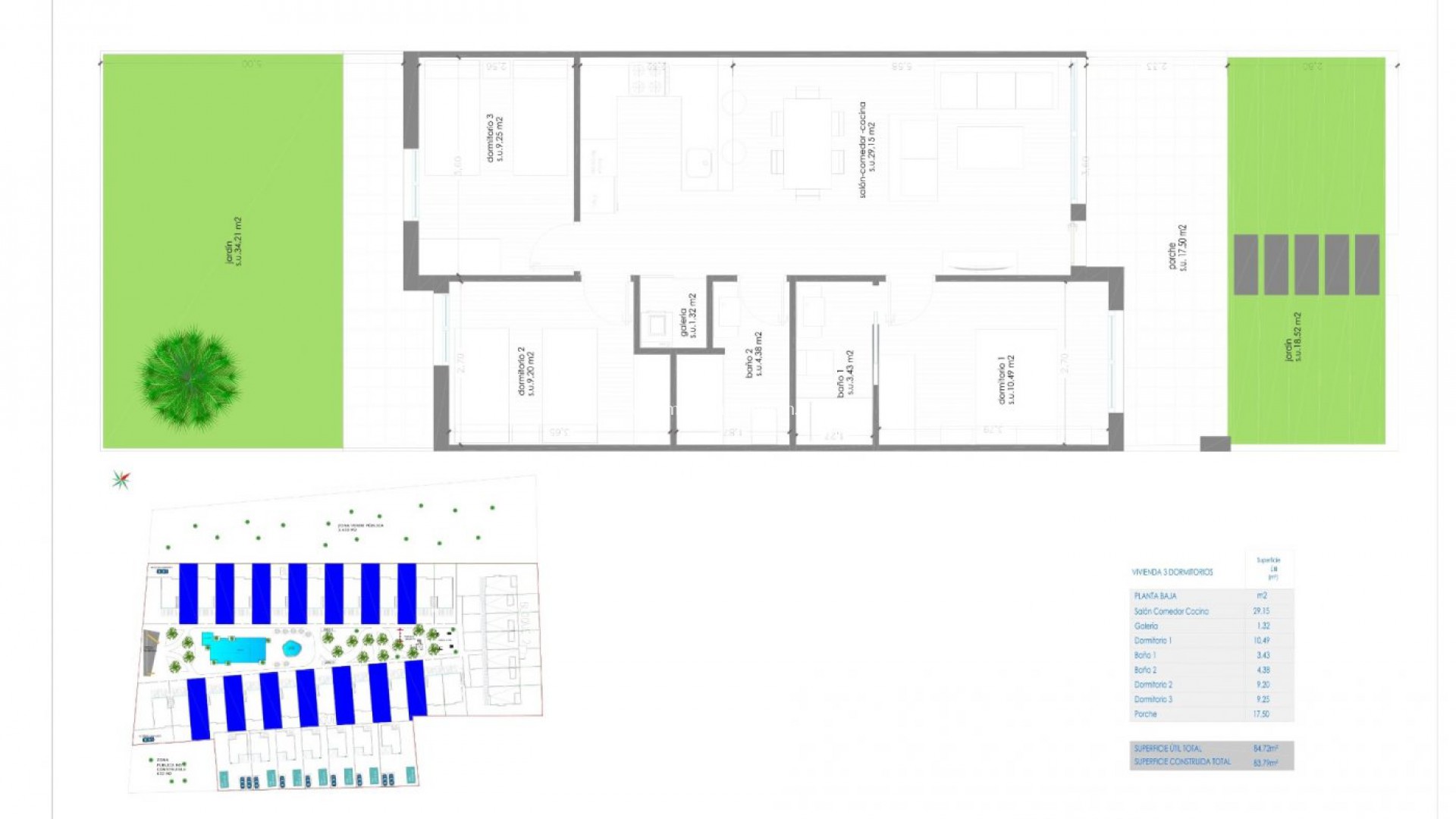 COMPLEXE RÉSIDENTIEL DE NOUVELLE CONSTRUCTION À PUNTA PRIMA Complexe résidentiel de nouvelle construction composé d'appartements de type bungalow et de 7 villas individuelles à Punta Prima. Les bungalows sont répartis en trois blocs. Bungalows au rez-de-chaussée avec jardin privé et bungalows au dernier étage avec solarium privé. De beaux bungalows avec 2 ou 3 chambres, une cuisine ouverte sur le salon, des placards, une buanderie et des terrasses spacieuses. Chaque bungalow dispose d'une place de parking. L'urbanisation offrira de beaux espaces verts avec une aire de jeux pour les enfants, une salle de sport et deux piscines communes. Complexe situé à quelques mètres du centre de Punta Prima où vous trouverez toutes les commodités dont vous pourriez avoir besoin. Dans les environs, vous trouverez un large éventail de restaurants, cafés, supermarchés, pharmacies et toutes les commodités dont vous pourriez avoir besoin. Punta Prima, située à seulement 5 km de Torrevieja, se caractérise par de bonnes infrastructures de communication et de santé, la proximité de l'aéroport d'Alicante et le nombre de services ouverts toute l'année. À seulement 10 km, on trouve les terrains de golf de Villamartín, Campoamor, Las Ramblas, Las Colinas et Lo Romero, ainsi que les centres commerciaux de La Zenia et Habaneras.