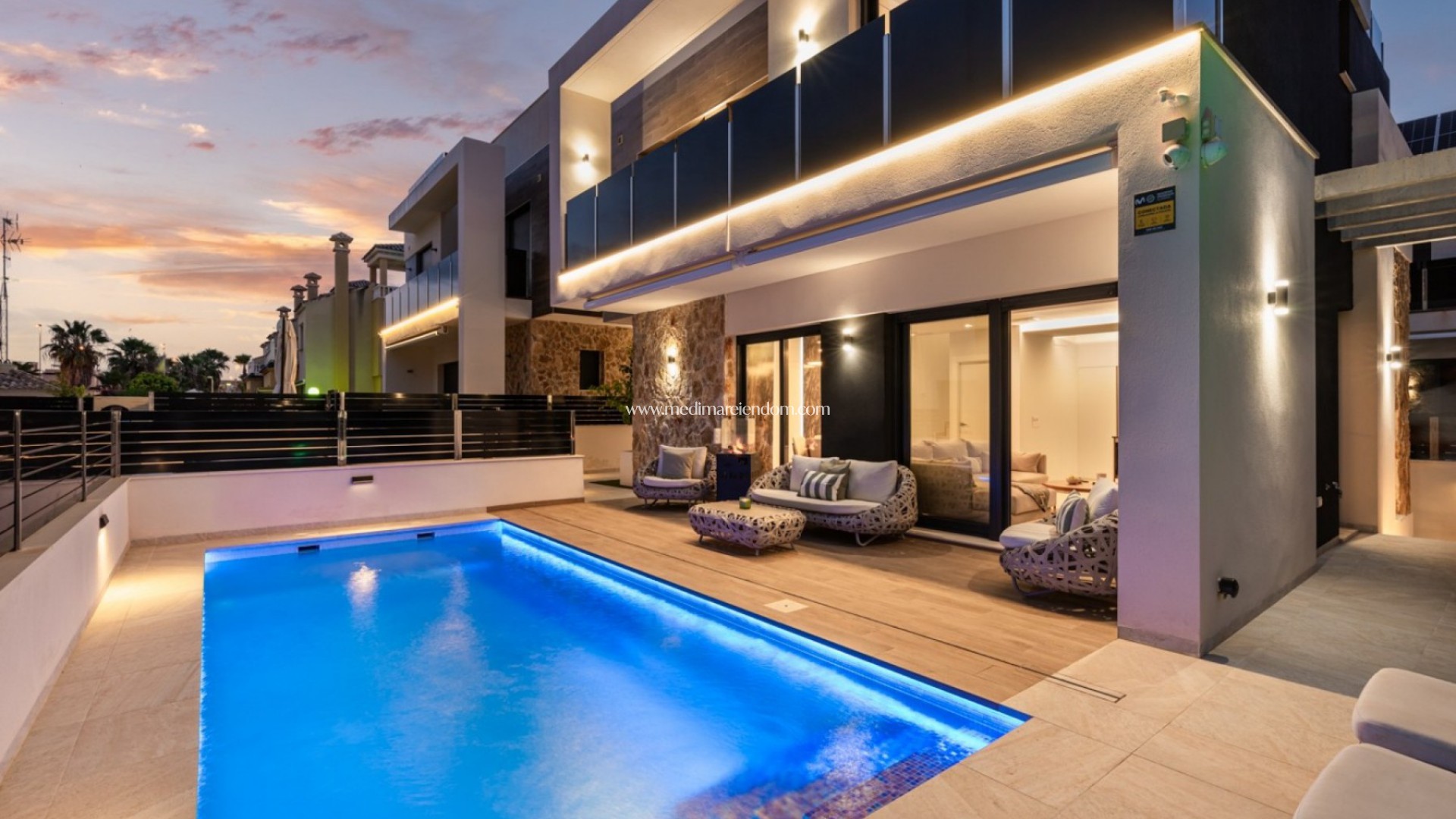 Villa de luxe moderne située à Lomas de Cabo Roig sur la Costa Blanca ! La villa dispose de 3 chambres, 4 salles de bains, grand sous-sol, toit-terrasse avec vue mer et piscine privée !