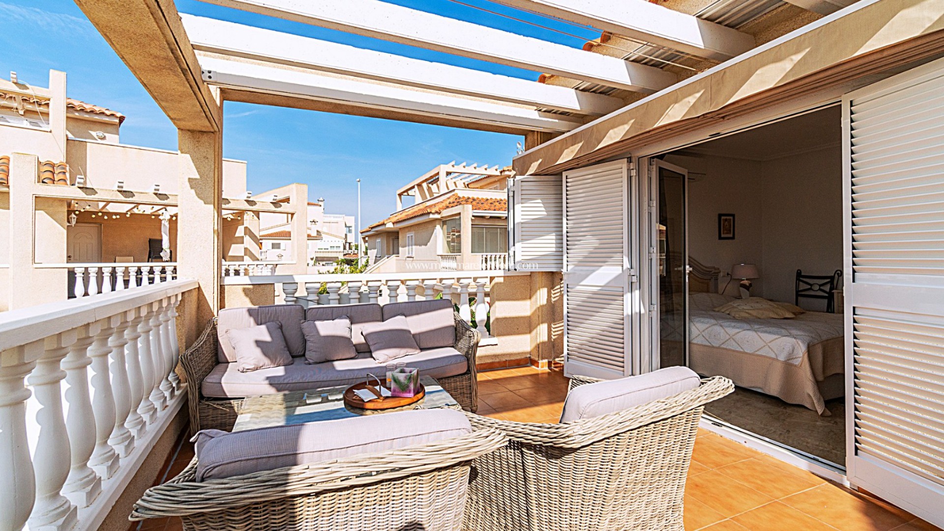 Hornraðhús sem snýr í suðvestur í Zeniamar íbúðarhúsnæði. Eignin samanstendur af 4 svefnherbergjum og 2 baðherbergjum á tveimur hæðum og með útsýni að framan í sameiginlegan garð með sundlaug.