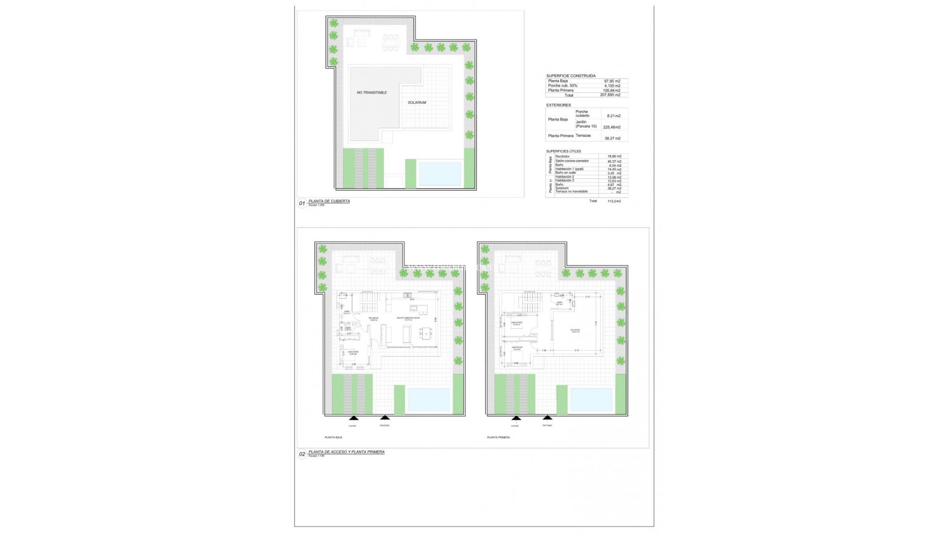 NÝBYGGÐ VILLUR Í PINAR DE CAMPOVERDE Nýtt byggt nútímalegt einbýlishús í Pinar de Campoverde Lítil þróun með aðeins 15 einbýlishúsum, þar af 9 byggð á einni hæð með 3 svefnherbergjum og 2 baðherbergjum, opnu stofu-borðstofu eldhúsi með Miðeyja útsýni til sundlaugar, í sjálfstæðum lóðum frá 300.00 m2. Það er líka stór sólstofa til að njóta sólarinnar og fallegs útsýnis allt árið um kring. Og 6 einstakar einbýlishús í lóðum frá 300,00 m2 eftir beiðni og sérsniðnar fyrir hvern viðskiptavin með aðstoð fagfólks á öllum stigum verkefnisins. Einkasundlaug er valkostur gegn aukagjaldi. Villur eru á frábærum stað við hliðina á náttúrusvæðinu Rio Seco og nálægt þægindum, íþróttaaðstöðu og nærliggjandi Lo Romero golfvelli, spænska bænum Pilar de la Horadada og í aðeins 15 mínútna akstursfjarlægð frá hvítum sandströndum La Torrede la Horadada. . Fullkominn staður ef þú vilt vera á rólegum stað, umkringdur náttúru og nálægt allri þjónustu, golfi og fallegum ströndum.