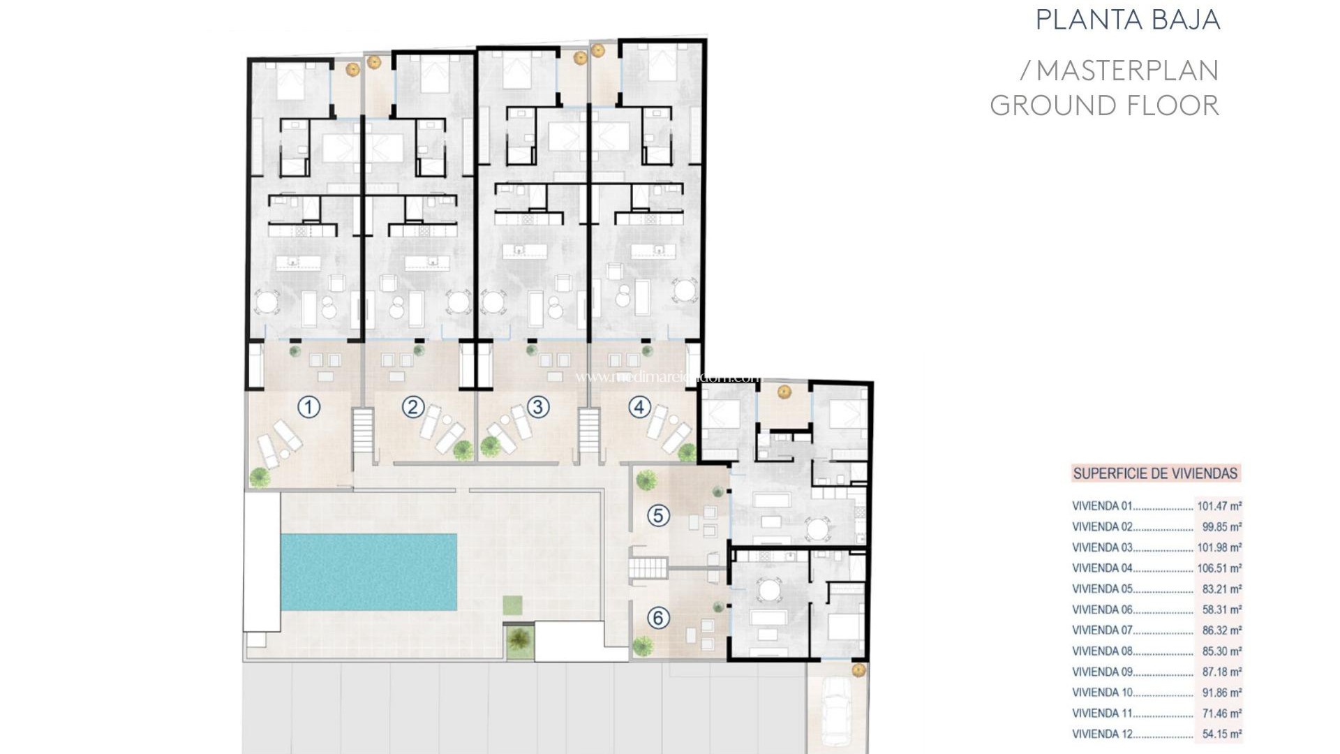 NÝBYGGÐ BÚNGALOWÍBÚÐ Í SAN PEDRO DEL PINATAR Nýbyggt safn af einstökum bústaði með framúrstefnuhönnun, athygli á hverju smáatriði og úrvali af hágæða frágangi í San Pedro del Pinatar. Samstæðan samanstendur af 1 og 2 svefnherbergja bústaðaíbúðum, fáanlegar í mismunandi gerðum: fyrstu hæð módel með stórri verönd og beinan aðgang að sameiginlegu sundlauginni og íbúðir með sér ljósabekk. Húsin bjóða upp á opna stofu sem sameinar eldhús með búri í sumum tilfellum, borðstofu og rúmgóða stofu með útgengi út á verönd. Svefnherbergin eru með rúmgóðum skápum og hjónaherbergi er einnig með sér baðherbergi. Lítil smáatriði gera þessar íbúðir einstakar! Búin með foruppsetningu á jarðgasi til húshitunar, foruppsetningu fyrir loftræstingu fyrir heitt og kalt loftræstikerfi, framleiðsla á heitu vatni með orkusparandi lofthitakerfi, tæknilýsingu og loftræstikerfi. Öll bústaðirnir eru með bílastæði. Forréttinda staðsetning San Pedro del Pinatar á Mar Menor og Miðjarðarhafsströndinni, laðar að þá sem hafa áhuga á siglingum og vatnsíþróttum, sem veitir höfnina viðlegukanti og siglingaklúbba, en strendurnar og náttúruleg leðjuböðin laða að þá sem leita að öruggri sól, sjó og sandi. San Pedro del Pinatar er með rótgróið samfélag og býður upp á frábært úrval af afþreyingu, þar á meðal yfirbyggða sundlaug og íþróttamannvirki, sem og félagsstarf allt árið um kring í notalegu vetrarveðri. Kostir leðjubaðanna, sem eru dæmigerðir fyrir svæðið, eða rólegu vatnsins í Mar Menor, hafa stuðlað að vexti Lo Pagan, sem hefur alls kyns þægindi eins og er. Að auki hefur það frábæra staðsetningu, aðeins 5 mínútur frá verslunarmiðstöðinni Dos Mares. Murcia/Corvera flugvöllur er í 30 mínútna fjarlægð og Alicante flugvöllur er í klukkutíma akstursfjarlægð.