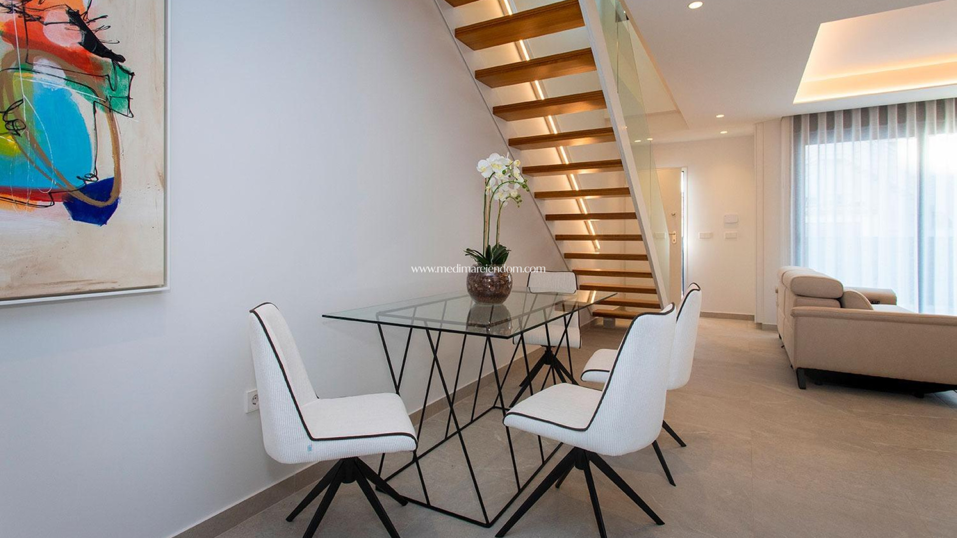 NÝBYGGÐ RÆÐHÚS Í TORRE DE LA HORADADA Nýbyggingarverkefnið sker sig úr fyrir ytri hönnun sína, blöndu af hreinum línum og húðuðum þáttum, sem gefa þessu heimili við ströndina einstakan, nútímalegan og glæsilegan stíl. Með suðaustur stefnu og staðsett í rótgrónu íbúðarhverfi, gerir það að kjörið heimili til að njóta Miðjarðarhafslífsins. Innri dreifing þess verðskuldar einnig sérstaka athygli, smáatriði sem hafa verið vandlega úthugsuð til að veita eigendum sínum hámarksþægindi og auka fagurfræði rýmisins. Því er á aðalhæðinni búið til „opið og létt“ rými þar sem stofa, borðstofa og eldhús eru tengd með rennihurðum út á innri verönd til notkunar og ánægju utandyra allt árið um kring. Einfaldleiki er lykillinn að þessu safni. Aftur, með einföldum hvítum málmbyggingu og glerhandriði, verður stiginn hið fullkomna viðbót til að viðhalda birtustigi og rými frá innganginum. Svefnherbergi með aðgangi að verönd og baðherbergi ljúka dreifingu þessarar hæðar. Þessi raðhús bíður enn eftir mjög sérstökum hluta: uppi. Gengið er upp stigann og komið í rólegheitarými, forstofu að ljósabekknum: notalegt horn með lessvæði og skrifborði. Þessi fjölnota lending víkur fyrir tveimur rúmgóðum svefnherbergjum, annað þeirra með sérverönd og deila bæði glæsilegu baðherbergi með 10m2 yfirborði. Torre de la Horadada er staðsett suður af Alicante á fallegum stað við ströndina. Fallegar strendur Torre de la Horadada og Mil Palmeras eru með fínum sandi og fallegu göngusvæði. Það eru fullt af veitingastöðum, börum og verslunum, einnig vatnaíþróttir, köfun og snorkl. Það er vel tengt aðeins 40 mínútur frá Alicante og Murcias Corvera flugvöllunum, með stórum verslunarmiðstöðvum og mörgum golfvöllum innan seilingar.