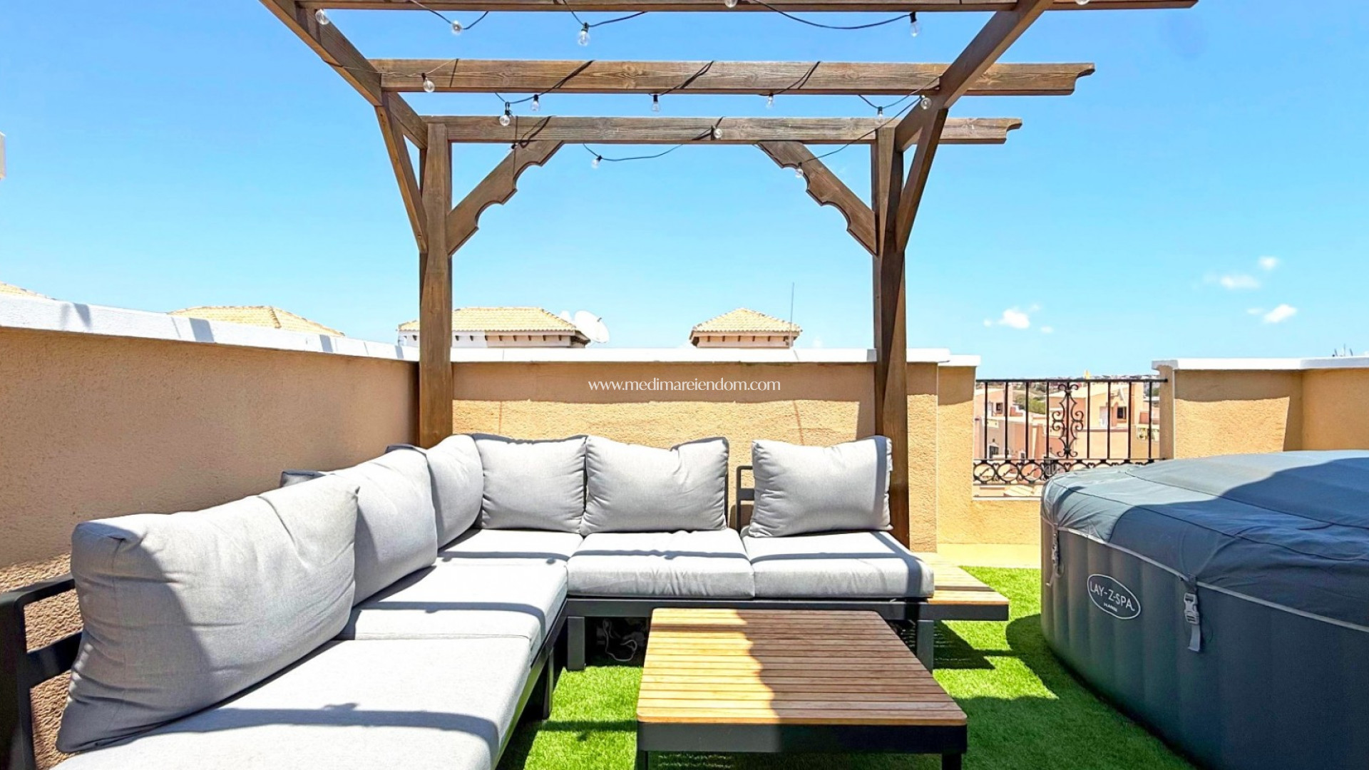 Velkomin í þetta glæsilega, fullkomlega endurnýjaða raðhús staðsett í hjarta Villamartin – eins eftirsóttasta svæðisins á Costa Blanca. Staðsett á rúmgóðri hornlóð býður þetta heimili upp á fullkomna blöndu af þægindum innandyra og útiveru. Eignin státar af 3 svefnherbergjum og 2 nútímalegum baðherbergjum, öll smekklega uppfærð samkvæmt hæsta gæðaflokki. Á jarðhæðinni er björt og opin stofa, glæsilegt eldhús og eitt af svefnherbergjunum – tilvalið fyrir gesti eða sem heimavinnustofu. Gengið út á rúmgóða einkaverönd, nógu stór til að leggja bíl inni á lóðinni ef þess er óskað. Þetta er frábær staður til að skemmta sér, borða eða einfaldlega slaka á í spænsku sólinni. Frá hjónaherberginu er aðgangur að einkasvölum, fullkomnum fyrir morgunkaffi eða kyrrlát kvöld. Rúmgóð þakverönd býður upp á auka útirými með útsýni – tilvalið til sólbaða eða til að búa til þitt eigið slökunarsvæði. Húsið er selt fullbúið og með loftkælingu fyrir þægindi allt árið um kring. Þessi eign er staðsett í vel viðhaldnu samfélagi með aðgangi að fallegri sameiginlegri sundlaug og er tilbúin til innflutnings og afþreyingar. Hvort sem þú ert að leita að fastri búsetu, frístundahúsi eða leigufjárfestingu með háum ávöxtunarkröfum, þá hefur þetta tilbúna raðhús allt.