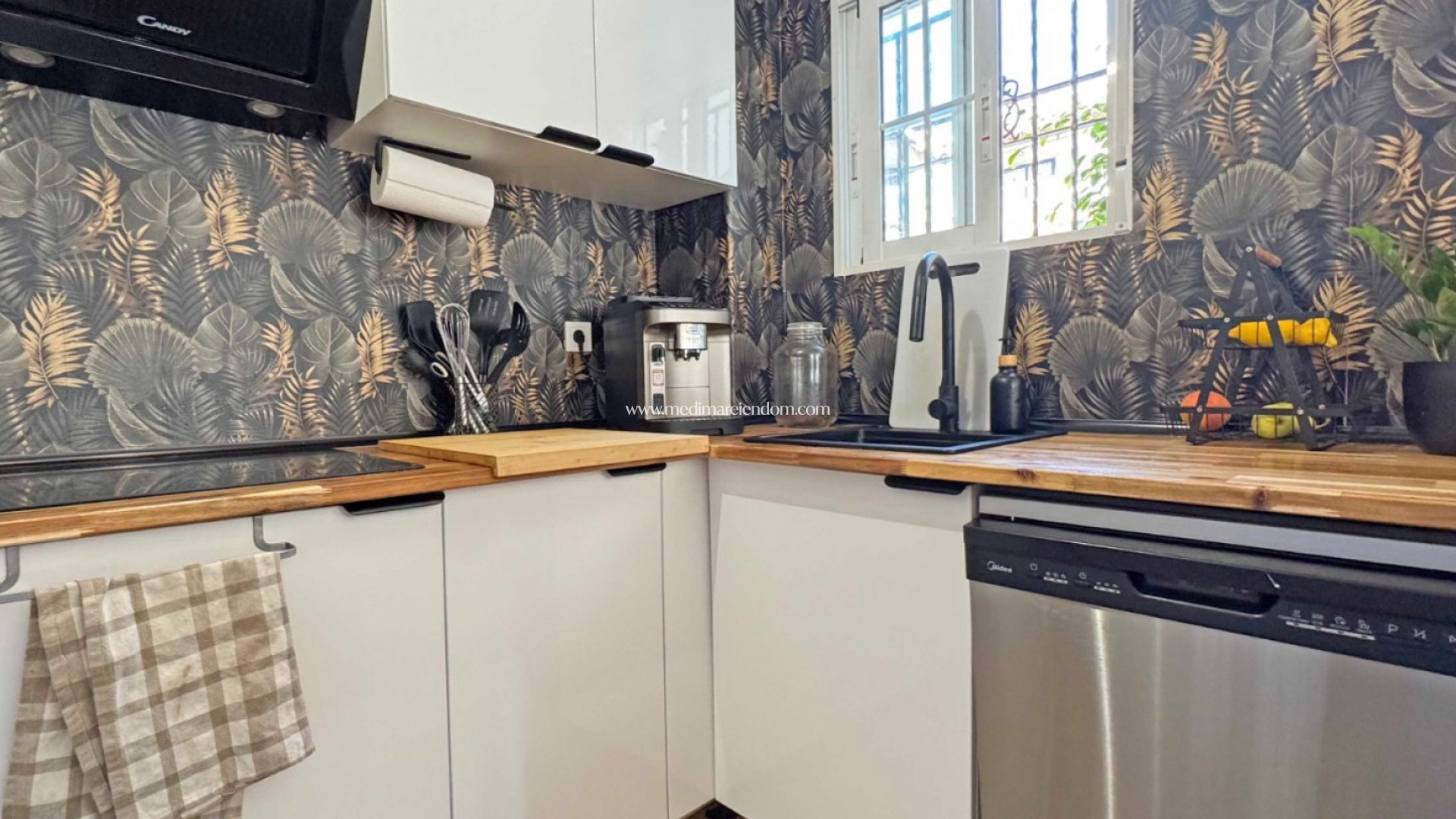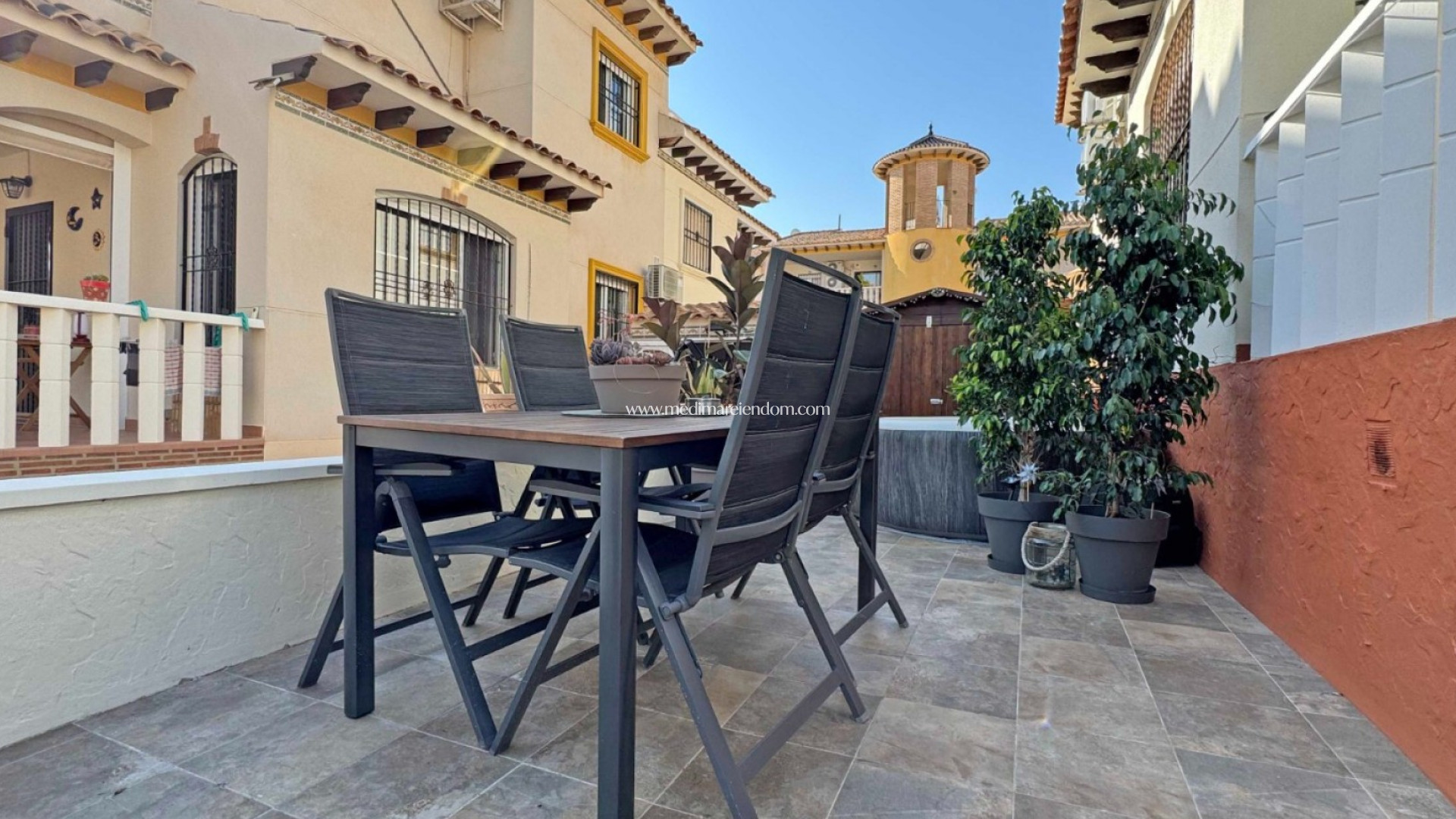 Uppgötvaðu þetta stílhreina og fullkomlega endurnýjaða raðhús í einu eftirsóttasta hverfi Orihuela Costa — Lomas de Cabo Roig. Þetta glæsilega heimili er staðsett á rúmgóðu 100 fermetra svæði og býður upp á 2 rúmgóð svefnherbergi og 2 nútímaleg baðherbergi, tilvalið bæði fyrir allt árið um kring og frí. Innréttingin hefur verið vandlega uppfærð með björtu, opnu stofu-borðstofu og sérsmíðuðu eldhúsi við innganginn, með glæsilegri frágangi, nútímalegum tækjum og frábæru geymslurými. Útgengt er á fallega viðhaldna verönd með borðkrók og einkasvæði með nuddpotti — fullkomið til að slaka á undir stjörnunum. Þakveröndin með útsýni yfir sjóinn er með gervigrasi fyrir aukin þægindi og skapar kjörinn stað til að sólbaða sig eða skemmta gestum. Róleg sameiginleg sundlaug er aðeins 100 metra í burtu. Heimilið býður upp á friðsælan en þægilegan lífsstíl nálægt allri nauðsynlegri þjónustu: La Zenia Boulevard – 2 km Veitingastaðir og barir – 600 m Matvöruverslanir – 500 m Strendur – 3 km Cabo Roig Strip – 2,7 km Helstu eiginleikar: Loftkæling um allt húsið Tilbúið til innflutnings Róleg íbúðagata Vel viðhaldið þéttbýlissvæði Frábærir leigumöguleikar Þetta er einstakt tækifæri til að eignast hágæða heimili nálægt sjónum. Hafðu samband við okkur í dag í síma eða WhatsApp til að bóka einkaskoðun.