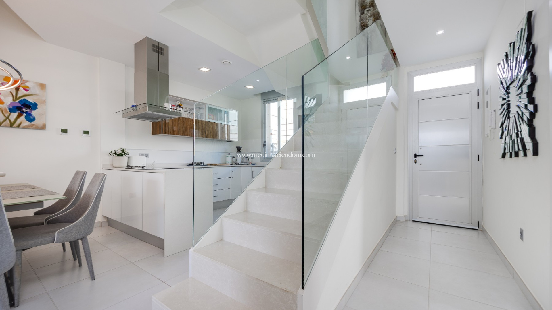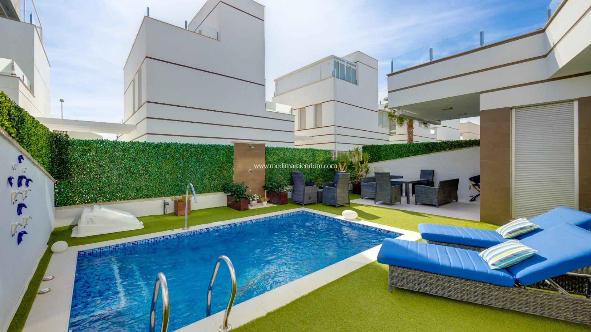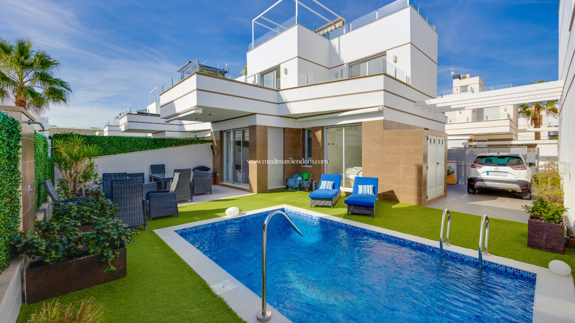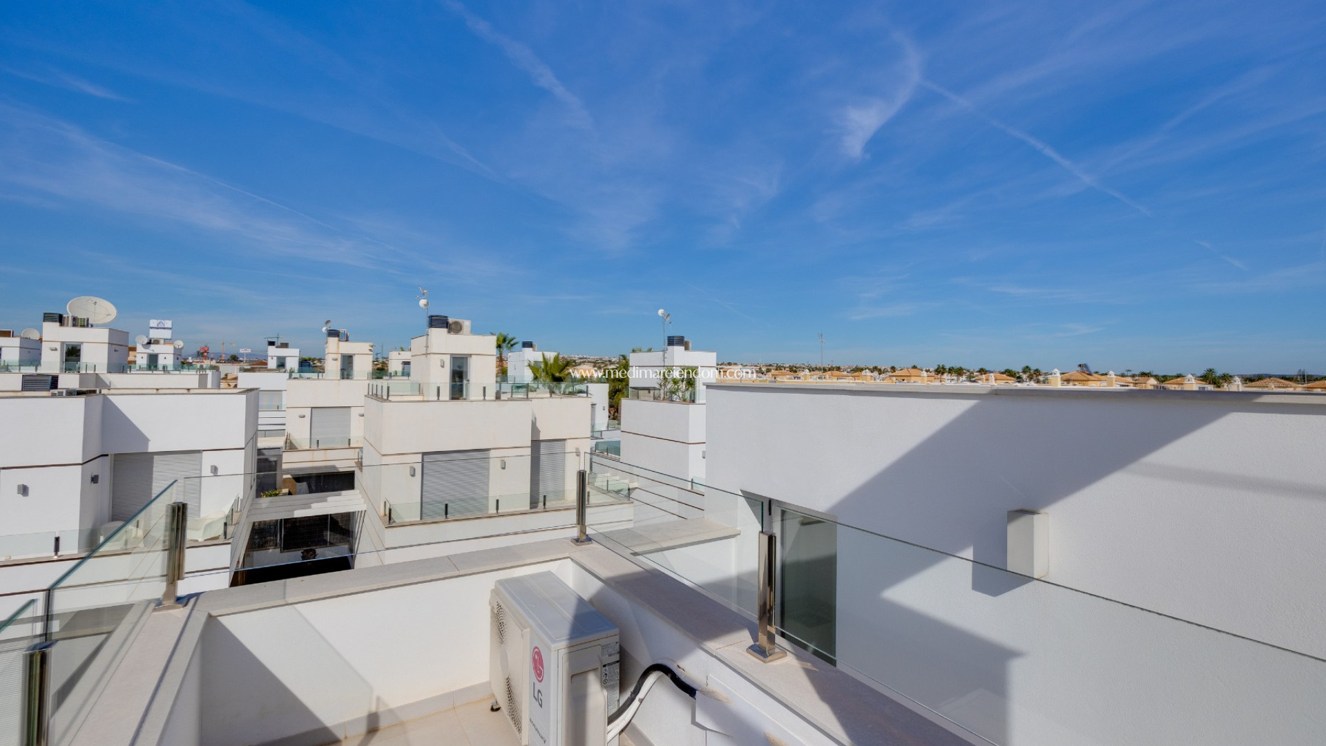 Frá þakveröndinni er hægt að njóta sólarinnar og fersks Miðjarðarhafsloftsins með nægu plássi fyrir útihúsgögn og sólstóla. Húsið er einnig með einkabílastæði og er selt með húsgögnum , tilbúið til innflutnings.