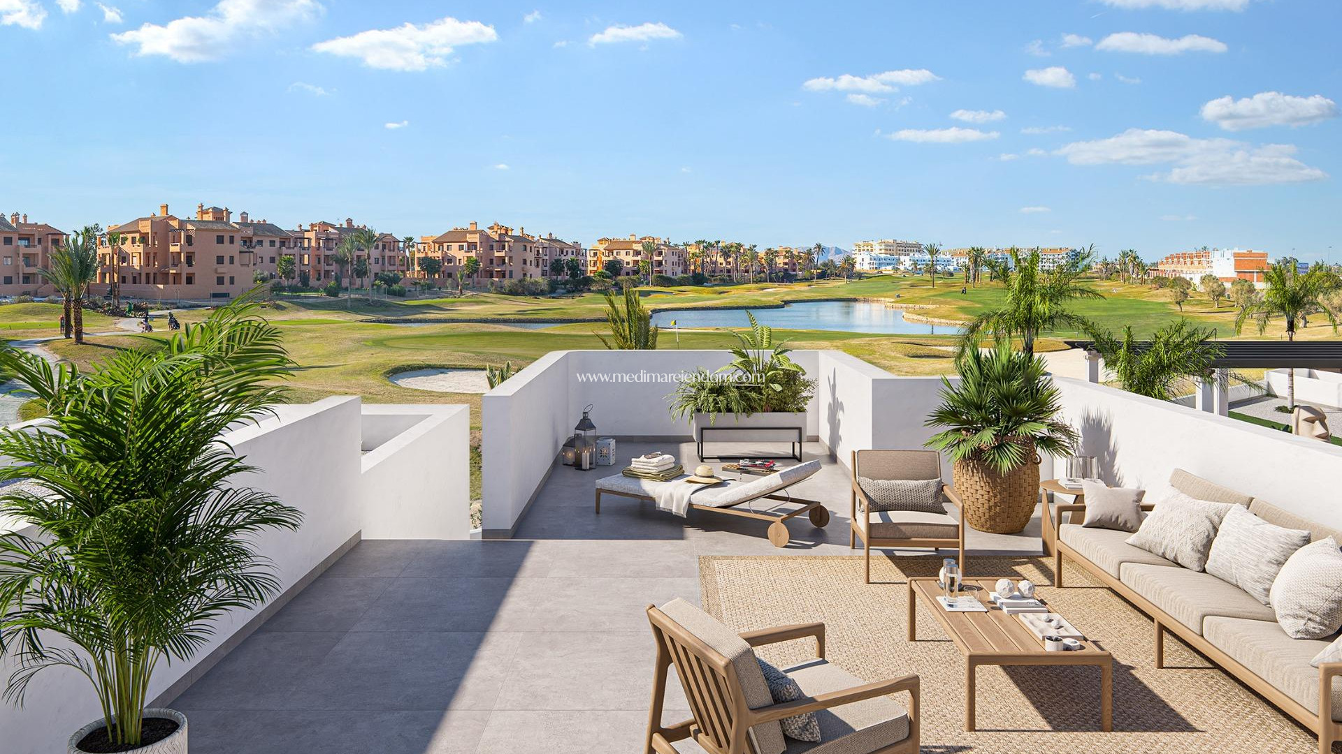 Nýbyggð íbúðabyggð nálægt Serena Golf og Mar Menor í Los Alcazares Nútímaleg strandlíf á Costa Calida Uppgötvaðu þetta aðlaðandi nýbyggða íbúðabyggðabyggð í Los Alcazares, einni vinsælustu strandbæjum á Costa Calida. Þessi þróun er staðsett aðeins 500 metra frá ströndum Mar Menor og í göngufæri við miðbæinn og býður upp á frábæra blöndu af strandlífi, golfumhverfi og daglegum þægindum. Los Alcazares er þekkt fyrir afslappaða stemningu, langar gönguleiðir, hlýtt grunnt vatn og fjölbreytt úrval veitingastaða, verslana og þjónustu sem er opin allt árið um kring. Nútímalegar íbúðir hannaðar með þægindi í huga Þróunin samanstendur af 29 nútímalegum heimilum með 2 eða 3 svefnherbergjum, hönnuð með hreinum byggingarlínum og hágæða frágangi. Kaupendur geta valið á milli íbúða á jarðhæð með einkagarði og verönd, heimila á miðhæð með rúmgóðum veröndum eða þakíbúða með einkaverönd og þakverönd með opnu útsýni. Margar eignanna njóta útsýnis í átt að Serena Golf og Mar Menor, sem skapar rólegt og þægilegt búsetuumhverfi. Öll heimilin eru hönnuð til að hámarka náttúrulegt ljós og virkni, sem gerir þau tilvalin sem fasta búsetu, frístundahús eða fjárfestingareign. Hágæða eiginleikar og sameiginleg rými Hver eign er með einkabílastæði og geymslu. Upplýsingarnar eru hannaðar til að veita þægindi og orkunýtingu, þar á meðal tvöföld gler í gluggum með hitarofi, foruppsetningu á loftkælingu, hitakerfi fyrir heitt vatn, rafmagnslokur í svefnherbergjum og heildar lýsingu bæði innandyra og utandyra. Baðherbergin eru afhent fullbúin með húsgögnum, spegli og sturtuklefa. Íbúar geta notið aðlaðandi sameiginlegra svæða með landslagsgörðum og sameiginlegri sundlaug, fullkomin til að slaka á og njóta Miðjarðarhafsloftslagsins. Valdar lóðir eru búnar lyftum fyrir aukin þægindi. Frábær staðsetning milli golfvallar og sjávar Þessi íbúðabyggð er staðsett við hliðina á Serena Golf, einum þekktasta golfvellinum á svæðinu, og aðeins í stuttri göngufjarlægð frá kyrrlátu vatni Mar Menor. Svæðið er tilvalið fyrir sund, siglingar, standandi róður og aðrar vatnaíþróttir allt árið um kring. Helstu fjarlægðir eru meðal annars strendur Mar Menor í 0,5 km fjarlægð, Serena Golf beint við hliðina á lóðinni, miðbær Los Alcazares í 2 km fjarlægð, Cartagena í 22 km fjarlægð og borgin Murcia í 40 km fjarlægð. Murcia Corvera flugvöllur er í um 30 km fjarlægð og Alicante flugvöllur er í um 90 km fjarlægð. Tilvalið heimili eða fjárfestingartækifæri Með frábærri staðsetningu, nútímalegri hönnun og nálægð við bæði golfvöll og sjó býður þetta nýja íbúðakomplex í Los Alcazares upp á einstakt tækifæri til lífsstíls á Costa Calida. Hafðu samband við okkur í dag til að fá frekari upplýsingar eða til að bóka einkaskoðun og tryggja þér nýja heimilið þitt við Mar Menor.