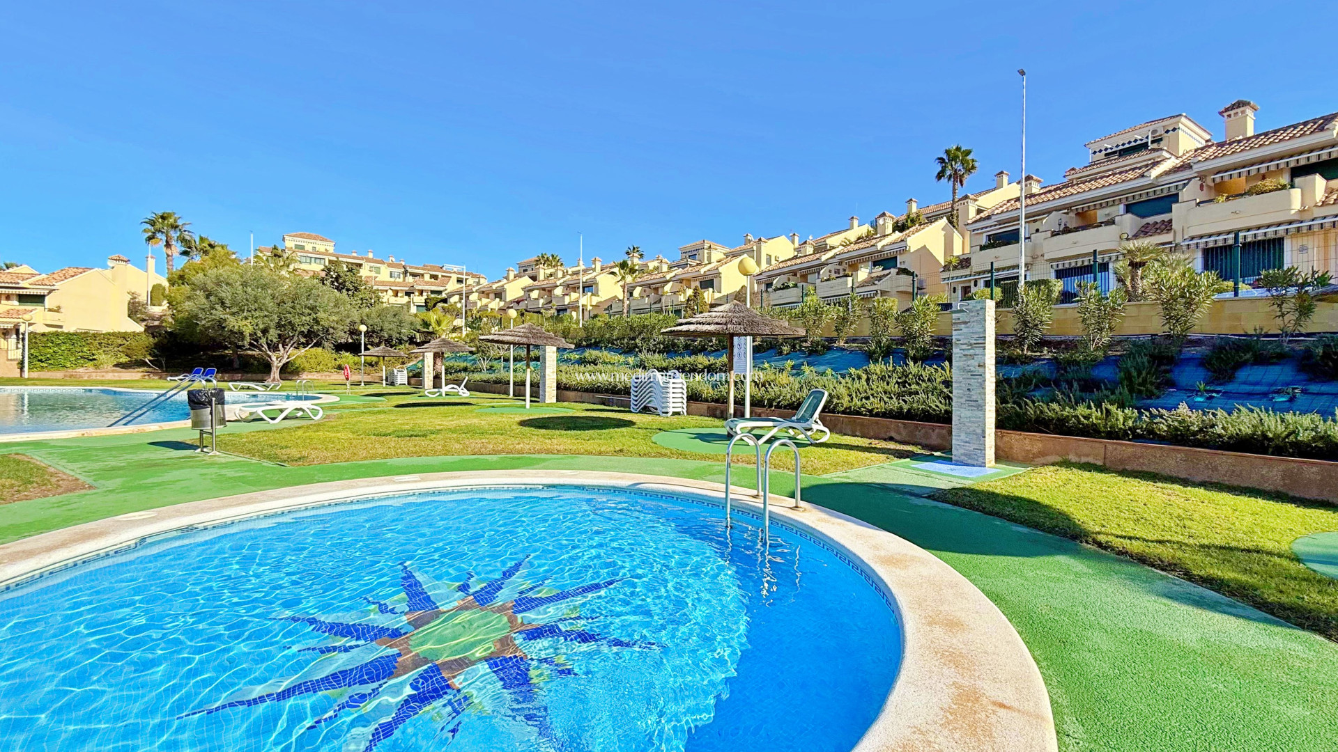 Þetta raðhús í Lomas de Campoamor stendur upp úr fyrir suðvesturátt og frábæra nýtingu útirýmisins, hannað til að njóta síðdegissólarinnar og sólsetursins. Með 83 fermetra íbúðarrými býður það upp á hagnýta skipulagningu með 2 svefnherbergjum og 2 baðherbergjum, er í góðu ástandi og er með loftkælingu. Helsta gildi eignarinnar liggur í þremur útisvæðum hennar: 25 fermetra garðlóð við innganginn, 15 fermetra verönd að aftan og 33 fermetra þakverönd, sem býður upp á óhindrað útsýni yfir golfvöllinn. Flókið býður upp á græn svæði og stóra sameiginlega sundlaug. Staðsetningin er stefnumótandi fyrir kylfinga og frígesti: aðeins 500 metra frá Real Club de Golf Campoamor og aðliggjandi viðskiptasvæðum með matvöruverslunum og veitingastöðum, sem býður upp á alla þjónustu í göngufæri án þess að fórna ró umhverfisins.