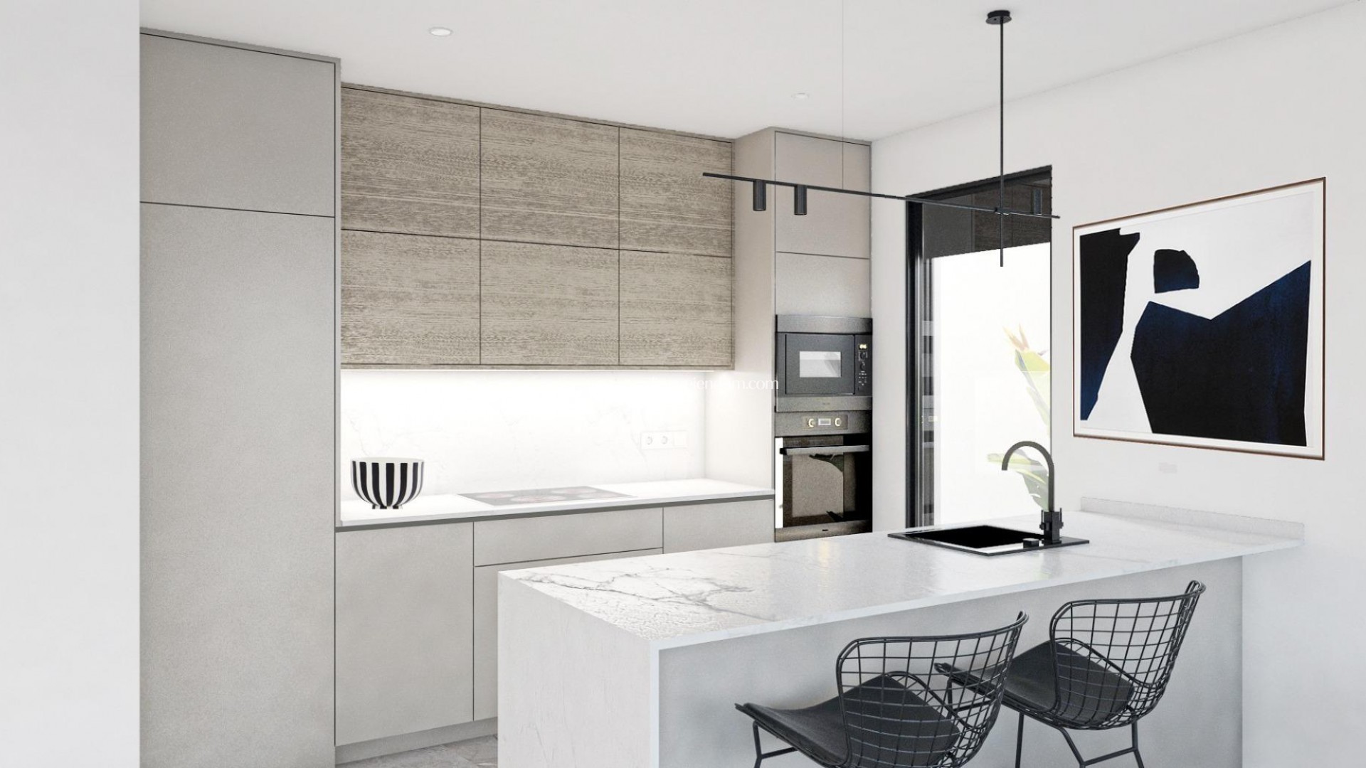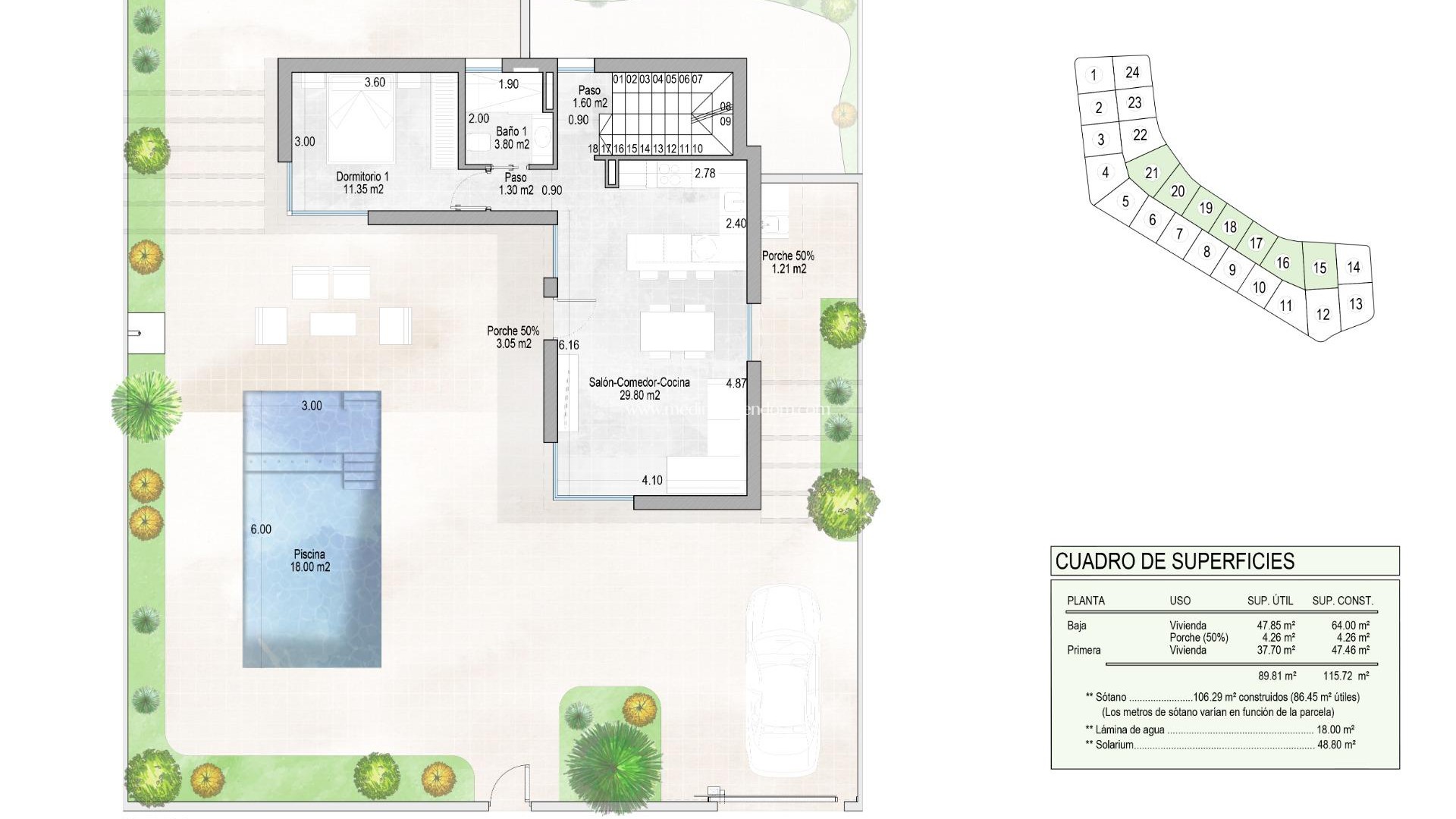 NIEUWBOUW VILLA'S IN PRIVÉ-GATED RESORT IN DE PROVINCIE MURCIA De moderne villa heeft een open woonkamer, woonkamer, eetruimte en een moderne keuken van hoge kwaliteit, compleet met inbouwapparatuur, 3 grote ruime slaapkamers met inbouwkasten en er zijn 4 stijlvolle moderne badkamers, waarvan de master een eigen badkamer heeft. Er is ook het prachtige solarium op het dak dat een geweldige ruimte biedt om te ontspannen of te entertainen met familie en vrienden in de 300 dagen zon die we hier elk jaar genieten. Terug binnen heb je toegang tot het lagere souterrain dat is inbegrepen en een ruimte biedt die extra slaapkamers kan bieden, een bioscoop en een speelkamer, een fitnessruimte of wat je maar wilt. Elke villa is gebouwd op een eigen perceel en gelegen op de tweede lijn van de lagune, genietend van deze bevoorrechte locatie in het resort. Op het perceel heeft u een eigen tuin met terrassen en een privé zwembad. Je hebt hier ruimte voor een zit- en eethoek buiten en zelfs om een jacuzzi en een zomerkeuken toe te voegen, terwijl je geniet van een panoramisch uitzicht op het resort en de lagune. Gelegen in een omheind privéresort, met een hoofdingang en 24 uur per dag beveiliging. Het resort is ontworpen rond een indrukwekkend groen gebied van 126.000 m2. Het omvat wandel- en fietspaden, sportfaciliteiten, paddle- en tennisbanen, een minigolfbaan, tuinen, hondenparken, recreatiegebieden, clubhuis…. Ook in het centrale gebied is de parel van het resort, een kristalhelder kunstmatig meer van bijna 17.000 m2 wateroppervlak, omgeven door witte zandstranden en palmbomen, dat een stukje Caribisch gebied naar de regio Murcia brengt. Er zijn 2 eilanden in het meer, een van hen heeft een eigen bar, er zijn ook "strand Chiringuitos" verspreid over het meer. Het resort is strategisch gelegen op minder dan 4 km van het strand en de stad Los Alcázares, waar u verschillende watersporten kunt beoefenen, omgeven door verschillende golfbanen en de stad Cartagena op minder dan 15 minuten met de auto en 22 km van de luchthaven van Murcia, daarmee een breed cultureel, gastronomisch en sportief aanbod binnen handbereik.