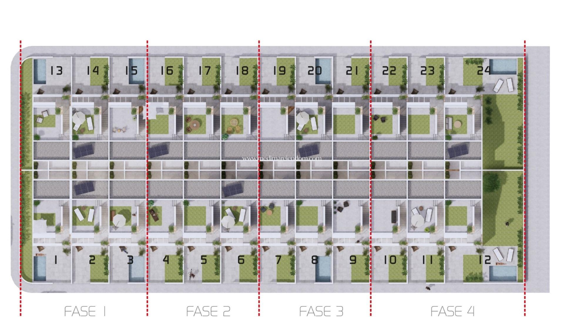 NIEUWBOUW HALFVRIJSTAANDE VILLA'S IN ORIHUELA COSTA Nieuwbouw schitterend complex bestaande uit 24 herenhuizen en halfvrijstaande villa's met 3 slaapkamers en 2 badkamers, privé zwembad en solarium om elke dag van het jaar van de zon te genieten. Complex gelegen in PAU 26, rustige woonwijk van Orihuela Costa. Deze woningen worden geleverd met vooraf geïnstalleerde airconditioning met kanalen, inclusief toevoer- en afvoerroosters in de woonkamer en slaapkamers, evenals een vooraf geïnstalleerde gezoneerde klimaatregeling. Complex gelegen naast het strand van Punta Prima zodat u het hele jaar door kunt genieten van de Spaanse zon aan de Costa Blanca. Slechts 10 minuten van de golfbaan Villa Martín en het winkelcentrum La Zenia Boulevard. Complex gelegen op 40 minuten van de luchthaven van Alicante en 1 uur van de luchthaven van Murcia - Corvera.