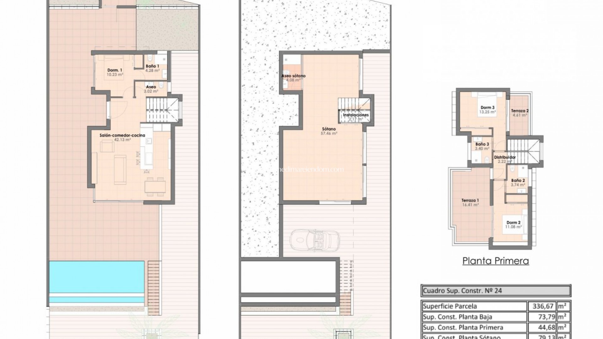 NIEUWBOUW WOONCOMPLEX IN ALGORFA Nieuwbouw complex van 14 herenhuizen, 2 geschakelde villa's en 7 vrijstaande villa's in La Finca Golfbaan, Algorfa. Alle woningen zijn uitgerust met afgewerkte kelder, airconditioning, volledig ingerichte keuken met elektrische apparaten, volledig ingerichte badkamers, interieur en exterieur verlichting, ingebouwde kasten, elektrische rolluiken, thermo regulatiesysteem, warm water door aerotermia, prive-tuin met zwembad en een parkeerplaats. De woning bestaat uit 3 slaapkamers, 4 badkamers, gastentoilet, open keuken met de woonkamer, Engelse patio in de kelder, 2 terrassen op de eerste verdieping. Toegang voor voertuigen tot het perceel is via een gemotoriseerde poort met afstandsbediening. Privé zwembad uitgerust met: - Warmtepomp en onderwaterverlichting - Buitendouche - Tegelcoating met hoge weerstand Residentieel complex gelegen in La Finca Golf resort, in de gemeente Algorfa, in het Vega Baja gebied van de Costa Blanca Zuid. Slechts 15 minuten rijden van de zandstranden van Guardamar del Segura, en slechts 35 minuten van de luchthaven van Alicante. De grotere steden Almoradi, Benijófar en Ciudad Quesada liggen op korte rijafstand. Torrevieja en Orihuela Costa, met hun grote winkelcentra, liggen op 15 minuten afstand.