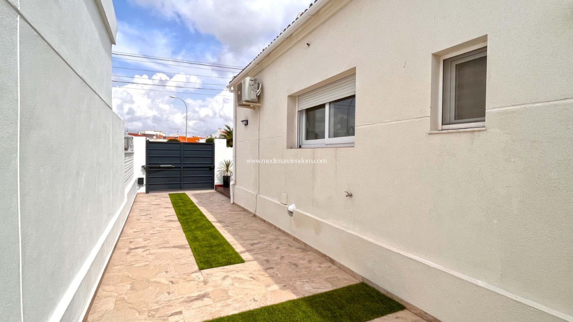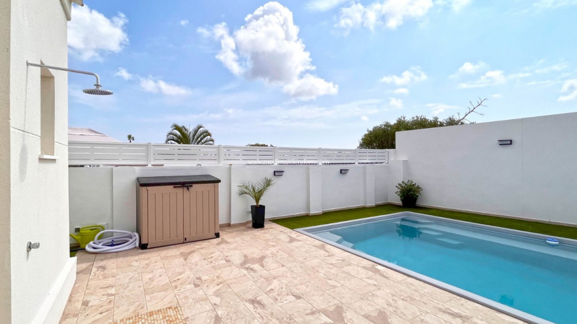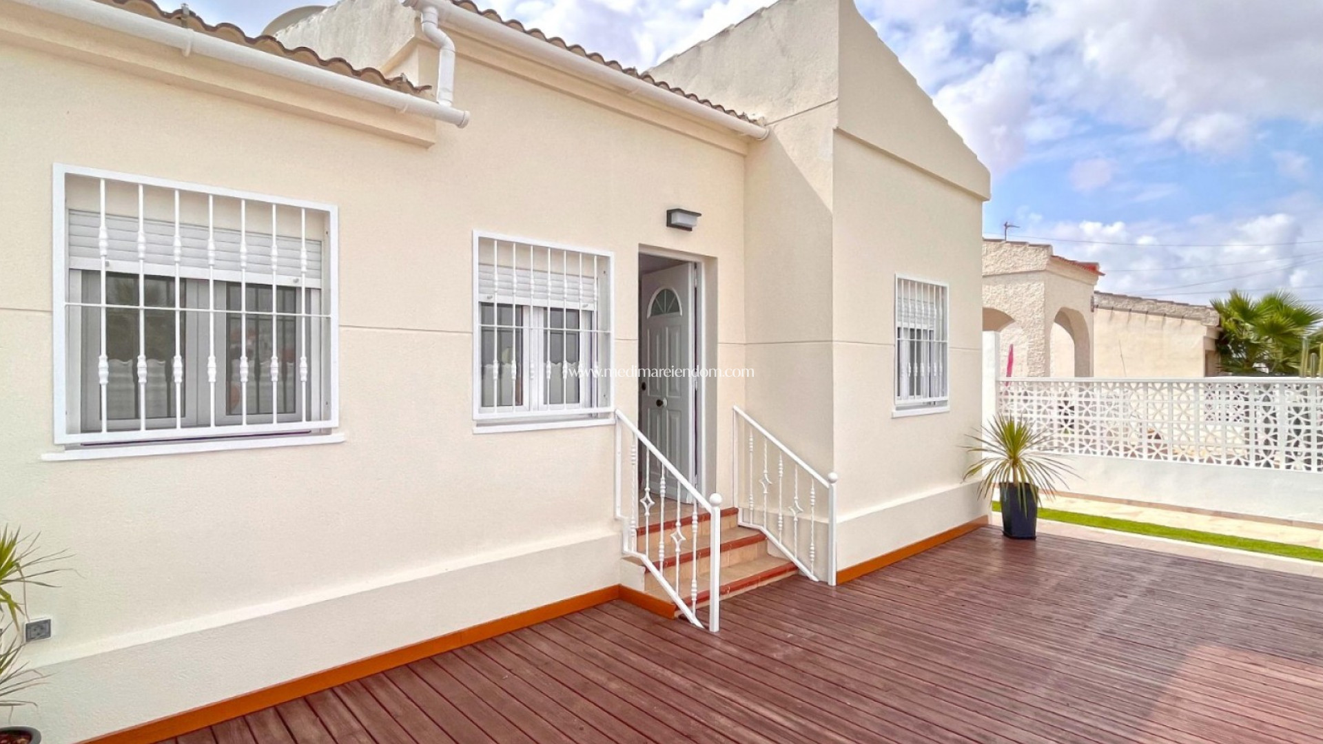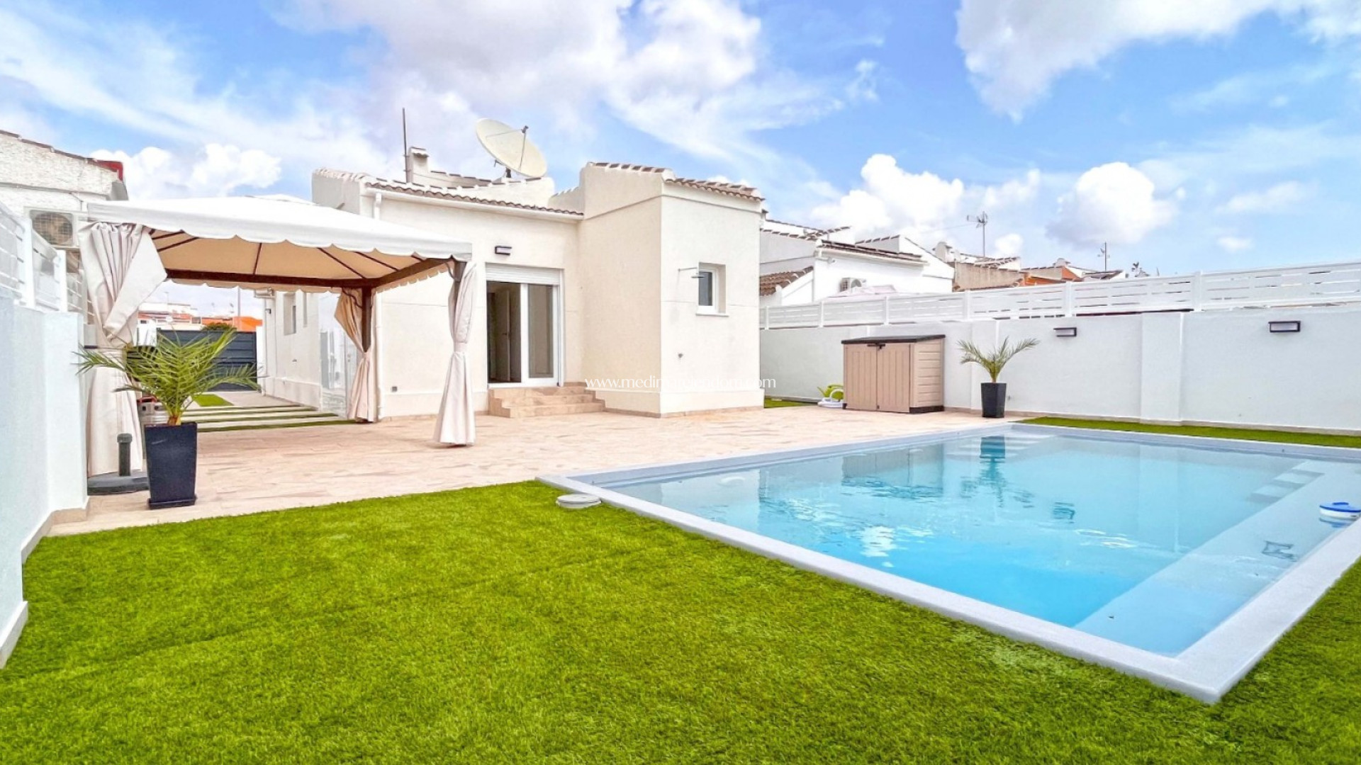 Ontdek deze prachtig gerenoveerde, op het zuiden gelegen vrijstaande villa in de rustige wijk San Luis, net buiten Torrevieja. Deze stijlvolle woning op één niveau biedt de perfecte combinatie van modern comfort en mediterrane charme, ideaal voor wie op zoek is naar een rustige en toch comfortabele levensstijl. Belangrijkste Kenmerken: 3 Slaapkamers & 2 Badkamers: Ruime accommodatie met drie lichte slaapkamers, waaronder een hoofdsuite met eigen badkamer. De tweede badkamer is handig gelegen voor gasten en de andere slaapkamers.Open Woonruimte: Geniet van een royale open woonruimte met een moderne keuken, uitgerust met kwaliteitsapparatuur en naadloos verbonden met de woon- en eetgedeeltes – perfect om te ontspannen of te entertainen.Privézwembad & Grote Terras: Stap naar buiten naar uw privéoase met een schitterend zwembad, omgeven door een ruim betegeld terras, ideaal om te zonnen, buiten te dineren of familie en vrienden te ontvangen.Ruime Parkeergelegenheid: De woning biedt parkeerruimte voor meerdere auto's, ideaal voor gezinnen of wie graag gasten ontvangt.Volledig Gerenoveerd: Recent gerenoveerd volgens hoge standaarden, inclusief nieuwe loodgieters- en elektrische installaties, biedt deze villa een instapklare oplossing met alle moderne gemakken.Uitstekende Locatie: Gelegen in een rustige woonwijk, is de villa op loopafstand van lokale supermarkten, restaurants en voorzieningen, wat de perfecte balans biedt tussen rust en gemak. Deze onberispelijke villa is een zeldzame vondst en biedt een uitzonderlijke kans om een prachtig bijgewerkt huis te bezitten in een van de meest gewilde gebieden nabij Torrevieja. Perfect voor permanent wonen, als vakantieverblijf of als lucratieve verhuurinvestering. Mis deze kans niet om te genieten van het beste van het Spaanse kustleven!