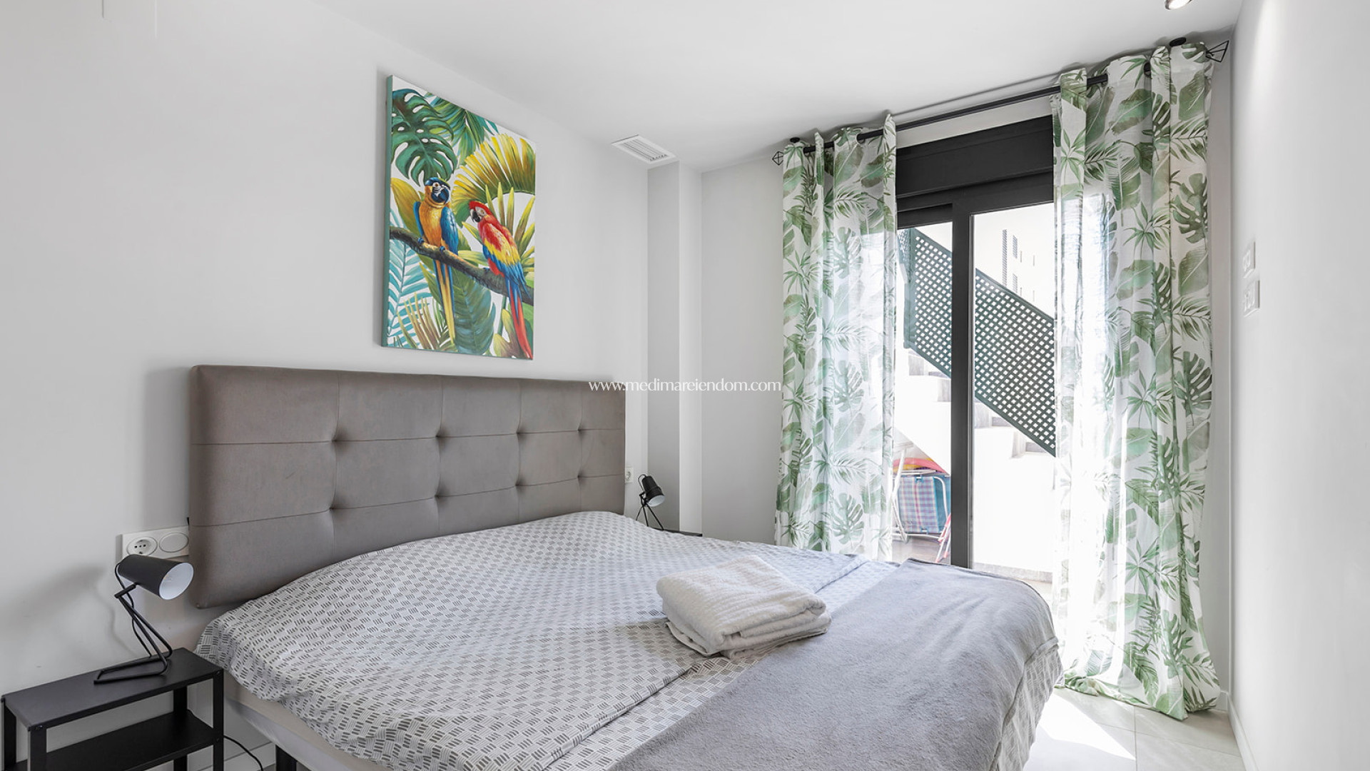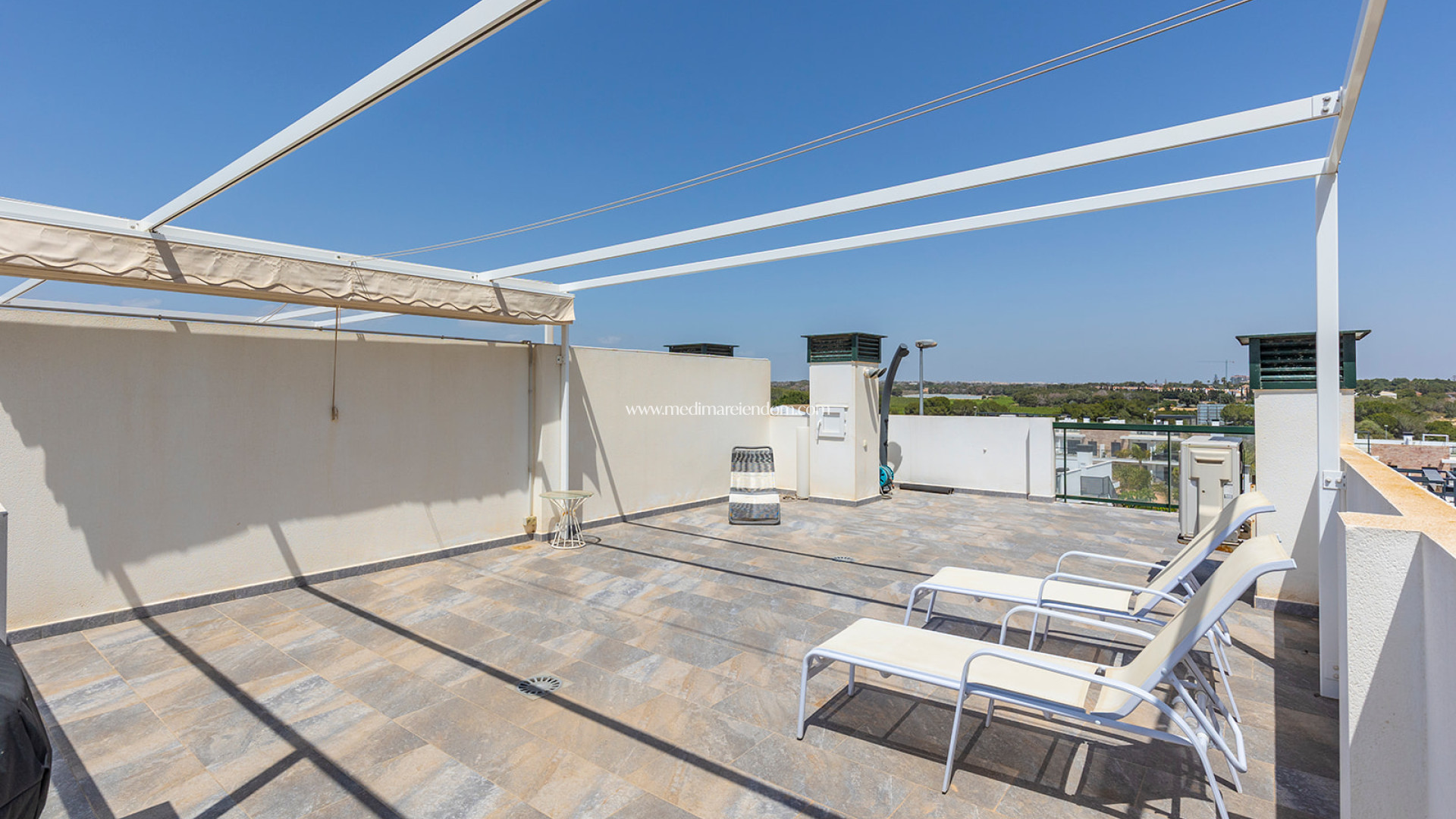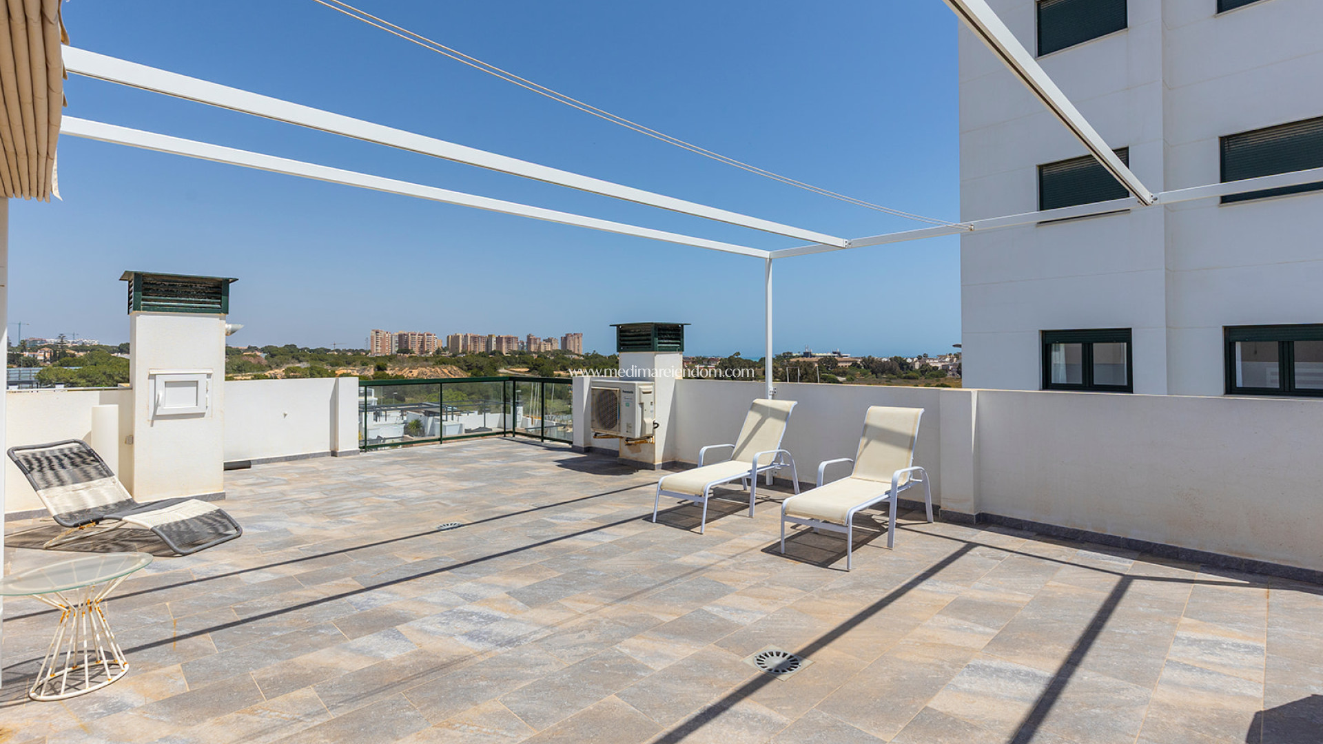 Dit moderne appartement is gelegen in de gewilde wijk Mil Palmeras, in Pilar de la Horadada, op slechts 400 meter van de witte zandstranden van de Middellandse Zee. Gelegen op de bovenste verdieping van een gebouw met twee verdiepingen, gebouwd in 2020, combineert het perfect comfort, design en een toplocatie. De woning heeft een bebouwde oppervlakte van 77,3 m², verdeeld over twee slaapkamers, twee badkamers, een Italiaanse keuken met ontbijtbar en een lichte woonkamer met toegang tot een terras van 12 m² met uitzicht op de gemeenschappelijke ruimtes. Een van de opvallende kenmerken is het privé-solarium van 30 m² met uitzicht op zee, een uitschuifbare pergola en een decoratieve verticale tuin - ideaal om te genieten van het klimaat en de omgeving. Het appartement wordt volledig gemeubileerd verkocht en is voorzien van airconditioning, een privéparkeerplaats en een lift. Het wooncomplex biedt uitstekende gemeenschappelijke faciliteiten, waaronder twee zwembaden, een buitenfitnessruimte, ontspanningsruimtes en met palmbomen omzoomde tuinen die een rustige en gastvrije sfeer creëren. Mil Palmeras is een gevestigde woonwijk met alle benodigde voorzieningen op loopafstand: restaurants, supermarkten, winkelcentra en stranden met een Blauwe Vlag en de "Q" voor Toeristische Kwaliteit. De woning ligt op slechts 50 minuten rijden van de luchthaven van Alicante en op 5 minuten van diverse recreatie- en eetgelegenheden, waardoor het een uitstekende keuze is voor zowel permanente bewoning als voor vakantieverhuur.