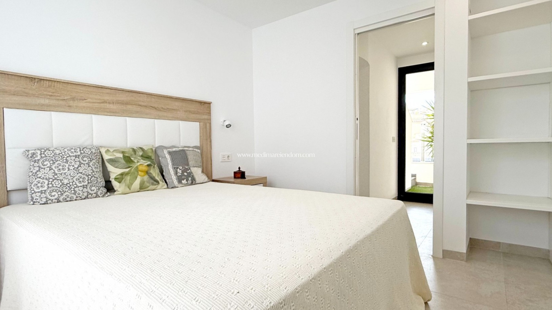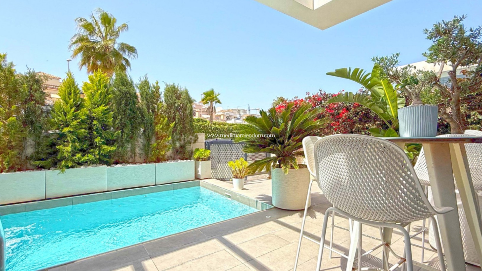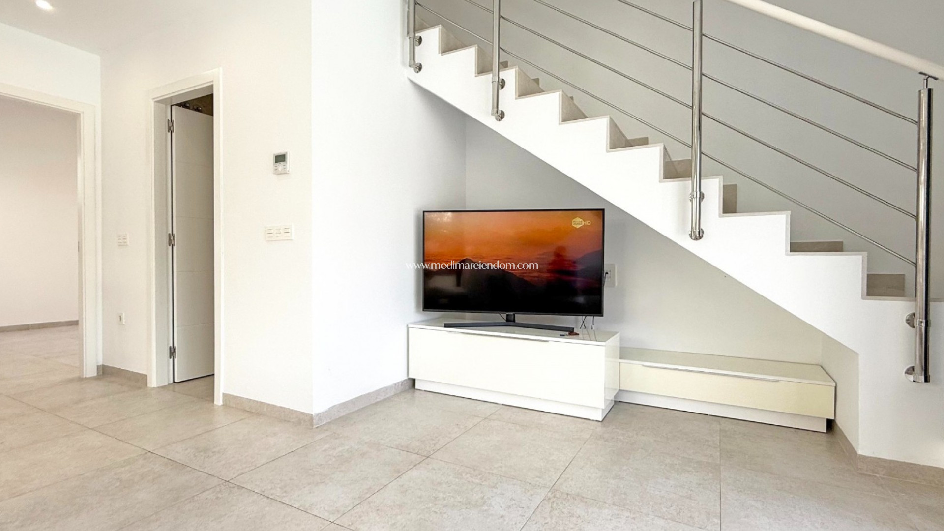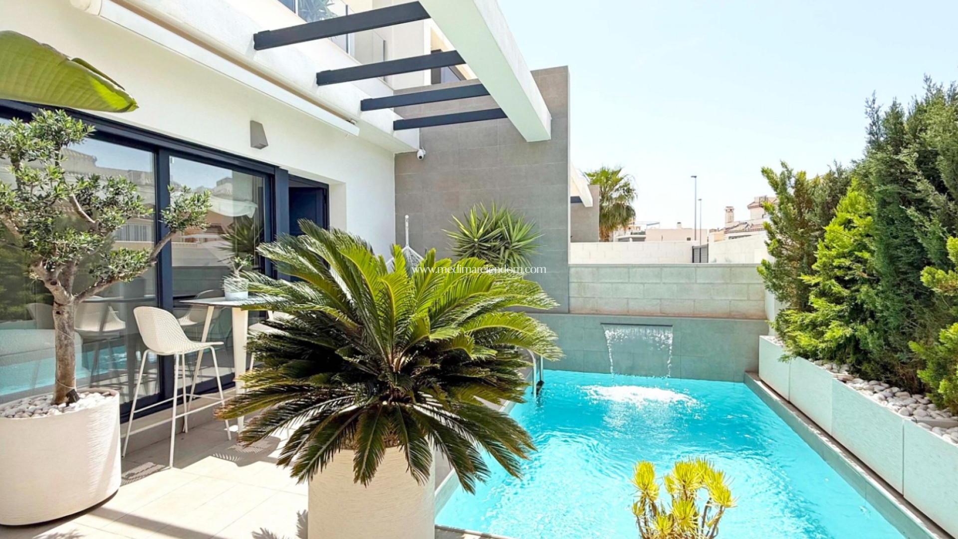 Moderne tussenwoning met 3 slaapkamers in een populaire wijk van Villamartin, gebouwd in 2017 en gedeeltelijk gemeubileerd. De woning beschikt over 3 slaapkamers, 2 badkamers en een extra gastentoilet. Op de begane grond bevindt zich een lichte woon- en eetkamer, een moderne keuken, het gastentoilet, en toegang tot het privézwembad en terras. Op de bovenverdieping zijn de slaapkamers en badkamers, met directe toegang tot een ruim dakterras met prachtig uitzicht op het roze zoutmeer van Torrevieja. Inclusief parkeerplaats op eigen perceel. De woning maakt deel uit van een goed onderhouden woonwijk met groot gemeenschappelijk zwembad en groenzones.Ideaal als vakantiehuis, permanente woning of investering.