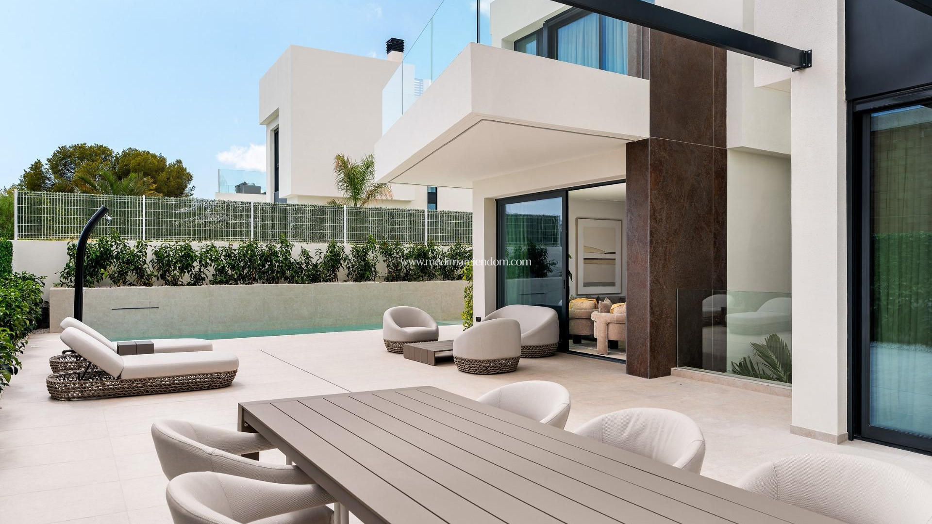 Exclusieve nieuwbouwwoningen met privézwembaden in La Nucía, vlakbij Benidorm Premium omheinde woonwijk met ongeëvenaarde beveiliging Maak kennis met een exclusieve collectie van slechts 10 vrijstaande villa's in La Nucía, grenzend aan de prestigieuze urbanisatie Coblanca van Benidorm en op minder dan 4 km van het strand. Deze beveiligde omheinde urbanisatie biedt de perfecte mix van mediterrane levensstijl, luxe, privacy en gemoedsrust, met 24/7 bewaking van het terrein en een eigen nachtbewaker. Elke villa heeft een eigen tuin met inheemse planten, een privézwembad met waterval en een dakterras met panoramisch uitzicht op de omgeving en de Middellandse Zee. De gemeenschap zorgt voor het volledige onderhoud van de tuin en het zwembad, plus een handige service voor dagelijkse reparaties aan de woning, waardoor deze huizen ideaal zijn voor een stressvrij leven of als vakantieverblijf. Ruim ontwerp en hoogwaardige voorzieningen Deze villa's zijn gebouwd over drie verdiepingen: begane grond, bovenverdieping en een semi-kelder met onafhankelijke toegang en een binnenplaats die zorgt voor natuurlijk licht en ventilatie. Alle woningen beschikken over 4 of 5 slaapkamers en 4 of 5 badkamers, een grote open woon- en eetkamer, een volledig uitgeruste keuken met Miele-apparatuur en een overdekt terras met barbecue. Belangrijkste kenmerken: Installatie van 10 zonnepanelen op het dak Slimme domotica voor verlichting en zonwering Airconditioning met luchtkanalen door de hele villa Dubbele beglazing met thermische onderbreking en gemotoriseerde rolluiken Design badkamers met meubels, spiegels en douchewanden Optionele installatie van een lift Semi-kelder met afwerkingen naar keuze Toplocatie aan de Costa Blanca La Nucía is een goed verbonden en levendige stad op slechts enkele minuten van Benidorm en Altea. De ontwikkeling biedt gemakkelijke toegang tot alle essentiële voorzieningen, waaronder scholen, gezondheidszorg, supermarkten en restaurants. Belangrijkste afstanden: Strand van Benidorm: 3,5 km Strand van Albir: 6 km Luchthaven Alicante: 60 km (ongeveer 45 minuten met de auto) Villaitana Golf: 5 km Winkelcentrum La Marina: 6 km Puerto Deportivo de Altea: 8 km Geniet van het mediterrane leven met alle comfort en veiligheid Dit is een zeldzame kans om een ultramoderne villa te bezitten in een van de veiligste en meest exclusieve gemeenschappen aan de Costa Blanca. Neem vandaag nog contact met ons op voor meer informatie of om een privébezichtiging van de modelwoning te regelen.