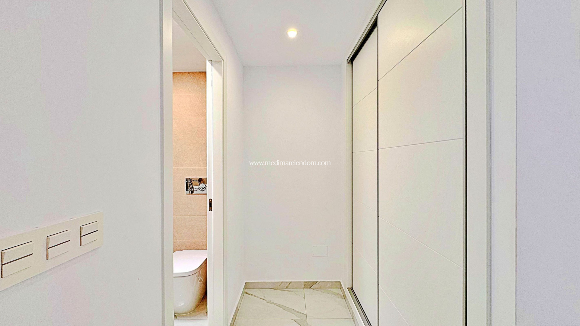 Deze duplexwoning met drie slaapkamers en drie badkamers is gelegen in de exclusieve woonwijk Los Balcones in Torrevieja. De woning onderscheidt zich door zijn moderne design, lichte interieur en ruime terrassen, waardoor u het hele jaar door kunt genieten van de mediterrane levensstijl. Op de begane grond beschikt de woning over een privétuin van 22 m² met ruimte om buiten te eten. Binnen is er een open woonkamer met een elegante accentmuur, verbonden met een volledig uitgeruste moderne keuken met apparatuur en een ontbijtbar. Op deze verdieping bevinden zich ook een slaapkamer met inbouwkasten, momenteel ingericht als studeerkamer, en een complete badkamer met douche. Boven zijn er nog twee slaapkamers, beide met inbouwkasten. De hoofdslaapkamer is bijzonder licht en heeft directe toegang tot een privéterras met uitzicht op de woonwijk en het zwembad. Deze verdieping biedt ook twee extra badkamers met moderne afwerkingen. De woning beschikt ook over een groot privésolarium met open uitzicht op de lagune van Torrevieja, uitgerust met een chill-outruimte, pergola, barbecue en ligstoelen - perfect voor bijeenkomsten in de buitenlucht of gewoon om te ontspannen in een rustige omgeving. Het wooncomplex biedt ruime gemeenschappelijke ruimtes met een zwembad omgeven door palmbomen en groene ruimtes, waardoor het een ideale omgeving creëert voor gezinnen of mensen die op zoek zijn naar een ontspannen levensstijl. Los Balcones is een van de meest gevestigde woonwijken van Torrevieja, met alle voorzieningen in de buurt: supermarkten, scholen, apotheken, sportfaciliteiten en het Universitair Ziekenhuis van Torrevieja. De stranden van Punta Prima en Torrevieja liggen op minder dan 4 km afstand, waardoor deze woning een uitstekende keuze is voor zowel permanente bewoning als een vakantie-investering.