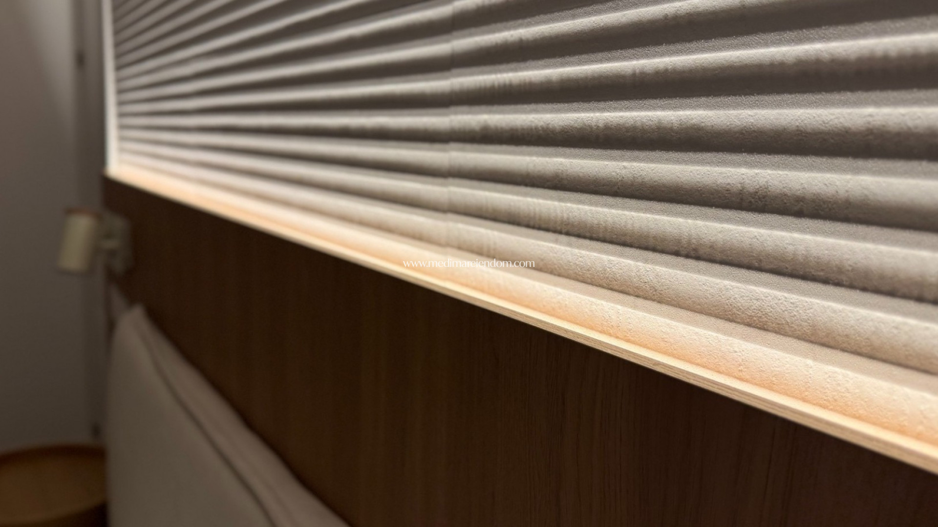 Op slechts 500 meter van de Middellandse Zee ligt dit volledig gerenoveerde hoek-penthouse op de 6e verdieping, met privacy, veel natuurlijk licht en panoramische uitzichten in een van de meest prestigieuze delen van Punta Prima. Dankzij de hoge ligging en hoekpositie geniet het appartement van open zicht op zee, zoutmeren, bergen en de skyline van de stad, met zonsopgangen en zonsondergangen het hele jaar door. De woning voelt licht en ruim aan, zowel overdag als ’s avonds. De woning heeft een bebouwde oppervlakte van 70 m² en is gerenoveerd volgens hoge kwaliteitsnormen. Alle ramen openen direct naar het terras, zonder interne patio’s, wat zorgt voor een sterke binnen-buitenbeleving. Geluidsisolerende panoramaramen bieden optimaal comfort zonder het uitzicht te beperken. Het interieur combineert modern designmeubilair met natuurlijke steen en grootformaat porseleinen tegels. De keuken is volledig uitgerust en voorzien van een inductiekookplaat en kwaliteitsapparatuur. Inverter-airconditioning met WiFi-bediening, een programmeerbare boiler en goede isolatie zorgen voor comfort het hele jaar door. Wordt volledig gemeubileerd verkocht en is direct klaar voor gebruik. Het gebouw beschikt over een lift en een gemeenschappelijk zwembad. Een volledige gevelrenovatie is momenteel bezig en volledig betaald, zonder extra kosten voor de koper. Het appartement beschikt over een toeristenvergunning en een nieuwe vergunning kan worden uitgegeven, aangezien vergunningen in dit gebouw worden verleend. Afgesloten gemeenschappelijke parkeerplaats met overkapping aanwezig. Optionele ondergrondse parkeerplaats beschikbaar voor €10.000.