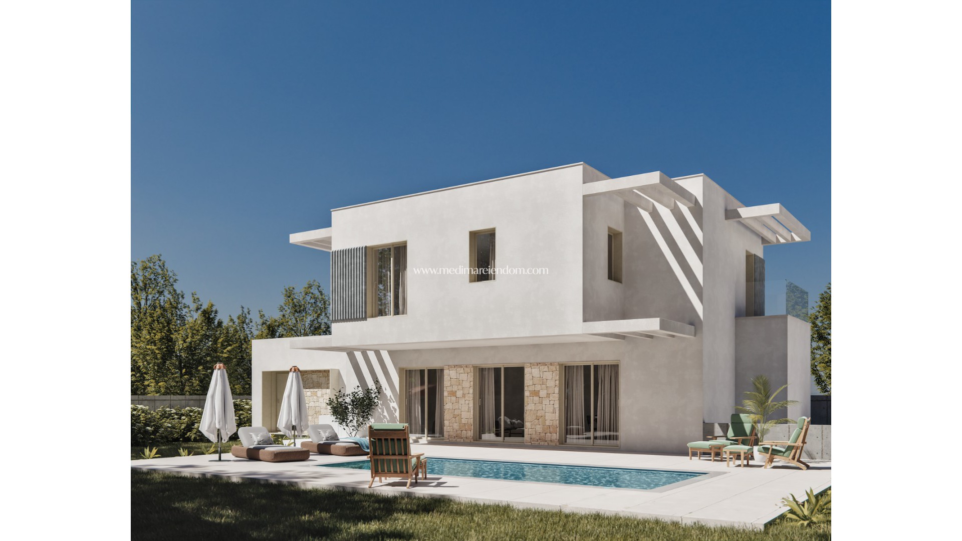 Domy posadowione są na działkach o powierzchni 450-583 m2 z własnym basenem i posiadają przestronny salon z kuchnią, 3 sypialnie z wbudowanymi szafami, 3 łazienki oraz toaletę dla gości.