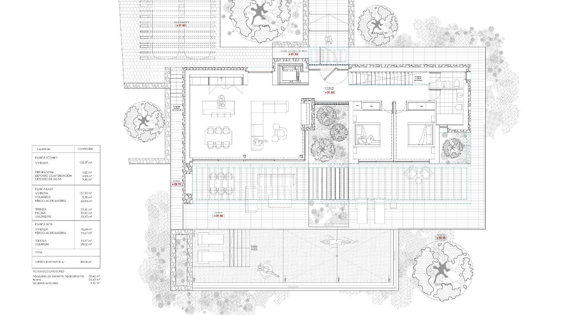 Nowoczesna willa z panoramicznym widokiem na morze w La Fustera, Benissa Costa Ta ekskluzywna, nowo wybudowana willa, zaprojektowana przez znanego architekta i zrealizowana przez lokalnego dewelopera z ponad 20-letnim doświadczeniem, położona jest na działce o powierzchni 800 m², zaledwie kilka kroków od plaży La Fustera. Łącząc śródziemnomorskie ciepło z nowoczesną elegancją, architektura łączy naturalny kamień, drewno i delikatne neutralne odcienie, płynnie wtapiając się w nadmorski krajobraz. Dzięki całkowitej powierzchni zabudowy wynoszącej 716 m² rozmieszczonej na trzech poziomach – piwnicy, parterze i pierwszym piętrze – willa oferuje idealną równowagę między funkcjonalnością, designem i komfortem. Parter Dolna kondygnacja o powierzchni 105,97 m² została zaprojektowana z myślą zarówno o praktyczności, jak i wypoczynku. Znajduje się tu w pełni wyposażona siłownia, pralnia i pomieszczenia techniczne, z możliwością adaptacji dodatkowych przestrzeni na piwniczkę z winami, kino lub salę wielofunkcyjną. Na tym poziomie znajduje się również system filtracji basenu i zbiorniki na wodę, zapewniające efektywne zarządzanie wszystkimi instalacjami technicznymi. Parter Główny poziom o powierzchni 137,93 m² rozciąga się w jasnym, otwartym układzie, który oddaje esencję śródziemnomorskiego stylu życia. Przestronny salon, jadalnia i kuchnia otwierają się przez duże okna sięgające od podłogi do sufitu na główny taras i basen bez krawędzi, tworząc niesamowitą panoramę morza, która definiuje charakter tego domu. Dwie sypialnie dwuosobowe, w pełni wyposażona łazienka i toaleta dla gości uzupełniają tę kondygnację, zapewniając komfort i funkcjonalność. Na zewnątrz drewniana pergola zapewnia cień w salonie i jadalni na świeżym powietrzu, otoczonych bujnymi ogrodami, tarasami słonecznymi i basenem bez krawędzi o powierzchni 59,40 m², który wizualnie łączy się z morzem. Pierwsze piętro Górny poziom o powierzchni 70,19 m² jest zarezerwowany dla apartamentu głównego - prywatnego zacisza z garderobą, łazienką i dużym prywatnym tarasem z zapierającym dech w piersiach widokiem na Morze Śródziemne. Drugą sypialnię lub przestrzeń biurową uzupełnia to piętro, które zapewnia również dostęp do solarium o powierzchni 25,02 m², idealnego do relaksu w słońcu i cieszenia się spokojem otoczenia. Wygląd zewnętrzny i lokalizacja Położona przy cichej ulicy mieszkalnej, w otoczeniu nowoczesnych willi, nieruchomość ta cieszy się wyjątkową lokalizacją, zaledwie 3 minuty spacerem od plaży La Fustera (150 m), baru i restauracji Mandala Beach Bar & Restaurant oraz niezbędnych udogodnień, takich jak supermarkety i lokalne usługi. Zaprojektowana z naciskiem na światło, przestrzeń i płynne przejście między wnętrzem a otoczeniem zewnętrznym, willa ta uosabia nowoczesny śródziemnomorski styl życia – elegancki, relaksujący i idealnie harmonizujący ze spektakularnymi panoramicznymi widokami na morze. Zabezpiecz swoją wymarzoną willę w La Fustera, Benissa Costa, i ciesz się najlepszym śródziemnomorskim stylem życia z zapierającymi dech w piersiach widokami na morze i niezrównanym komfortem.