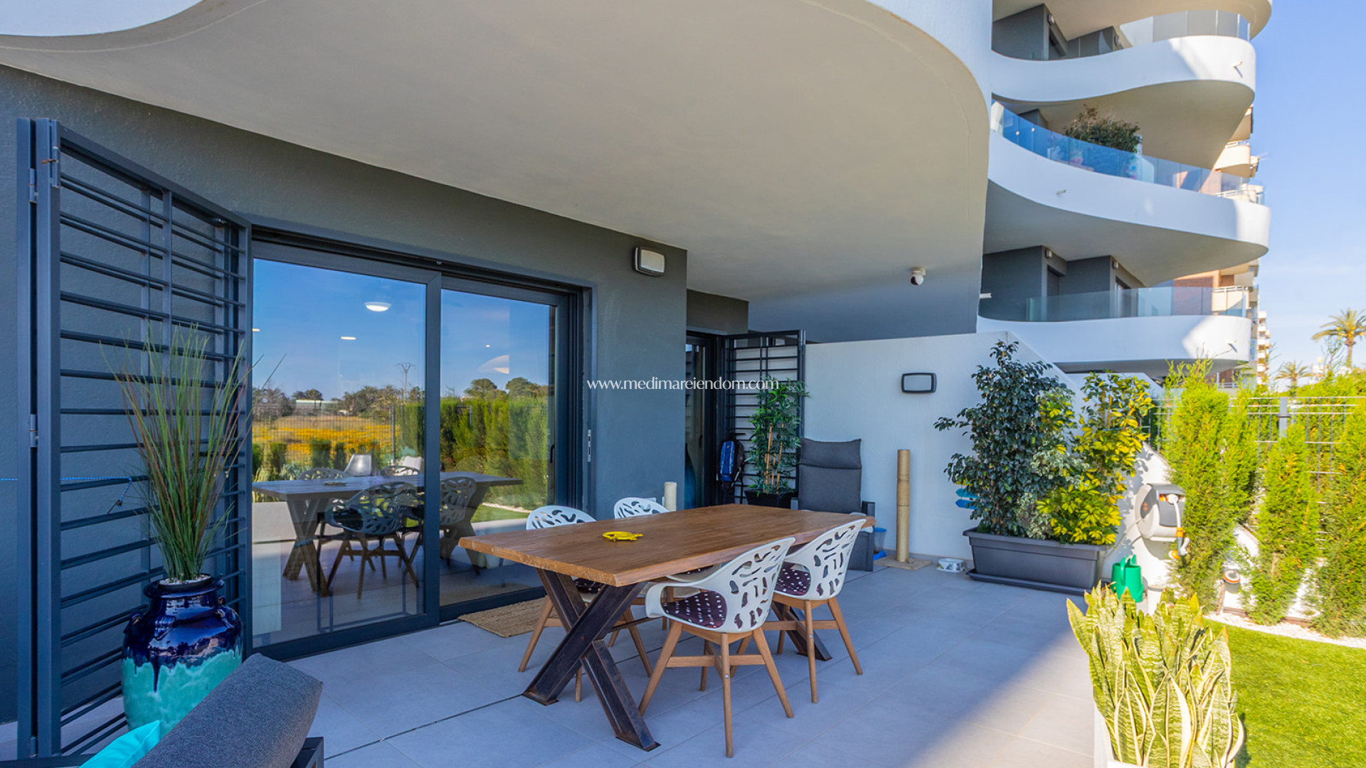 Ten apartament w kompleksie Ocean Dream wyróżnia się funkcjonalnością i strategiczną lokalizacją, zaledwie 200 metrów od plaży Punta Prima. Nieruchomość o powierzchni 84 m² składa się z dwóch sypialni i dwóch w pełni wyposażonych łazienek. Jej główną atrakcją jest duża, prywatna przestrzeń zewnętrzna: taras połączony z 95-metrowym ogrodem, z którego z parteru roztacza się niezwykły widok na otwarte morze.